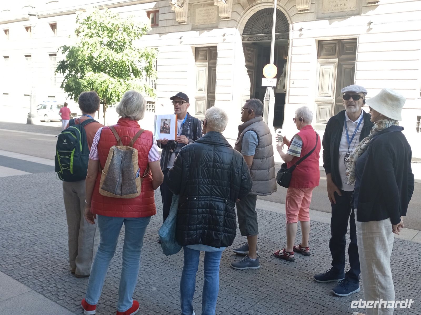 Unser Rundgang endet an der Plaza de Oriente. Thomas berichtet über die Geschichte des Königspalastes - Palacio Real, das wir morgen besuchen werden.