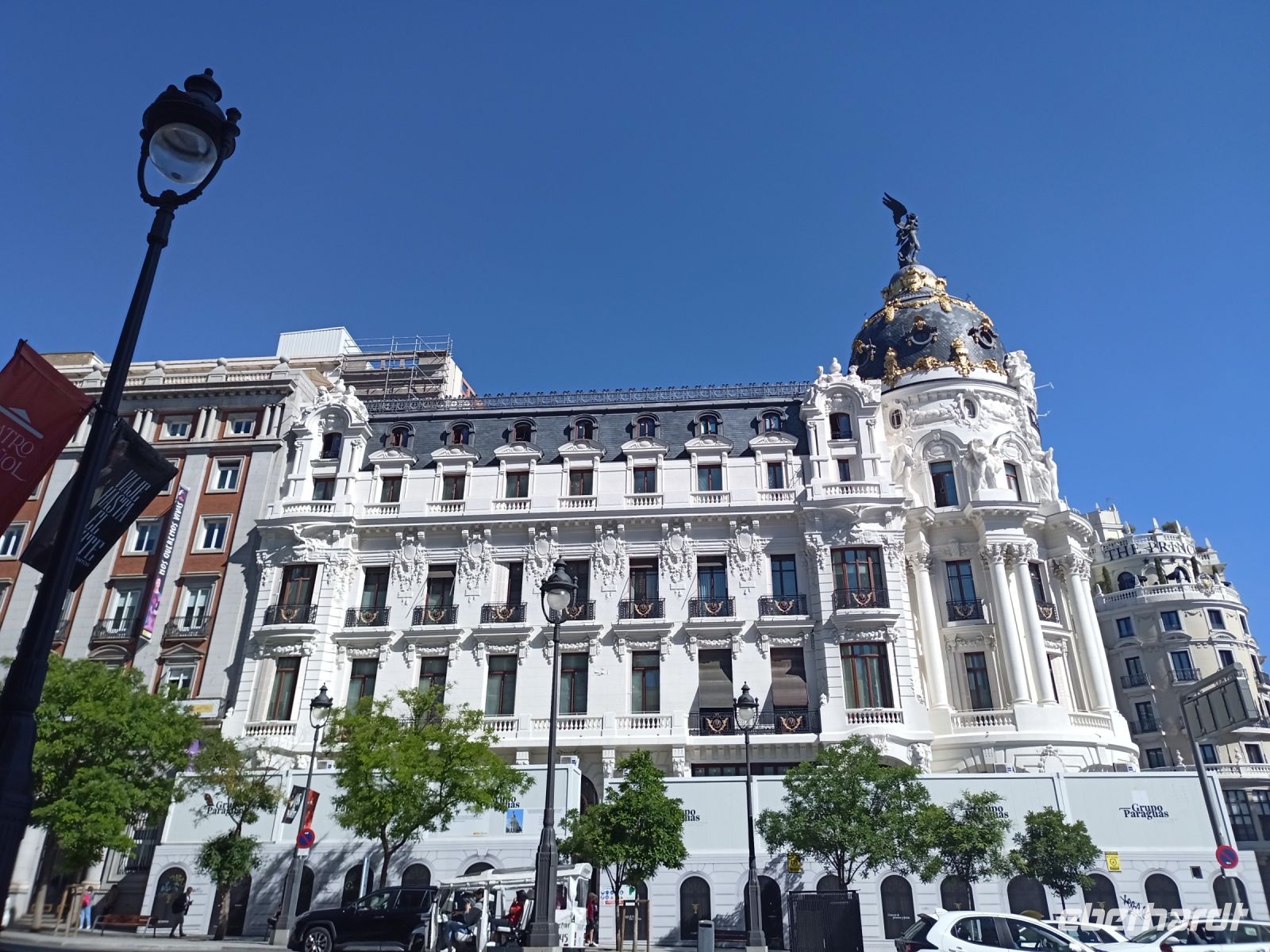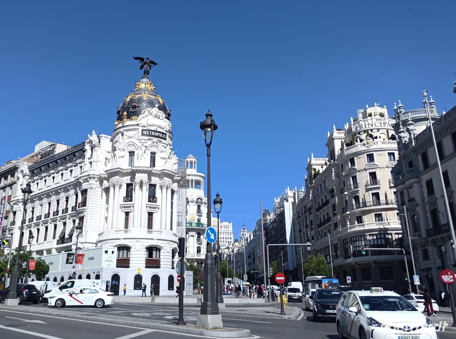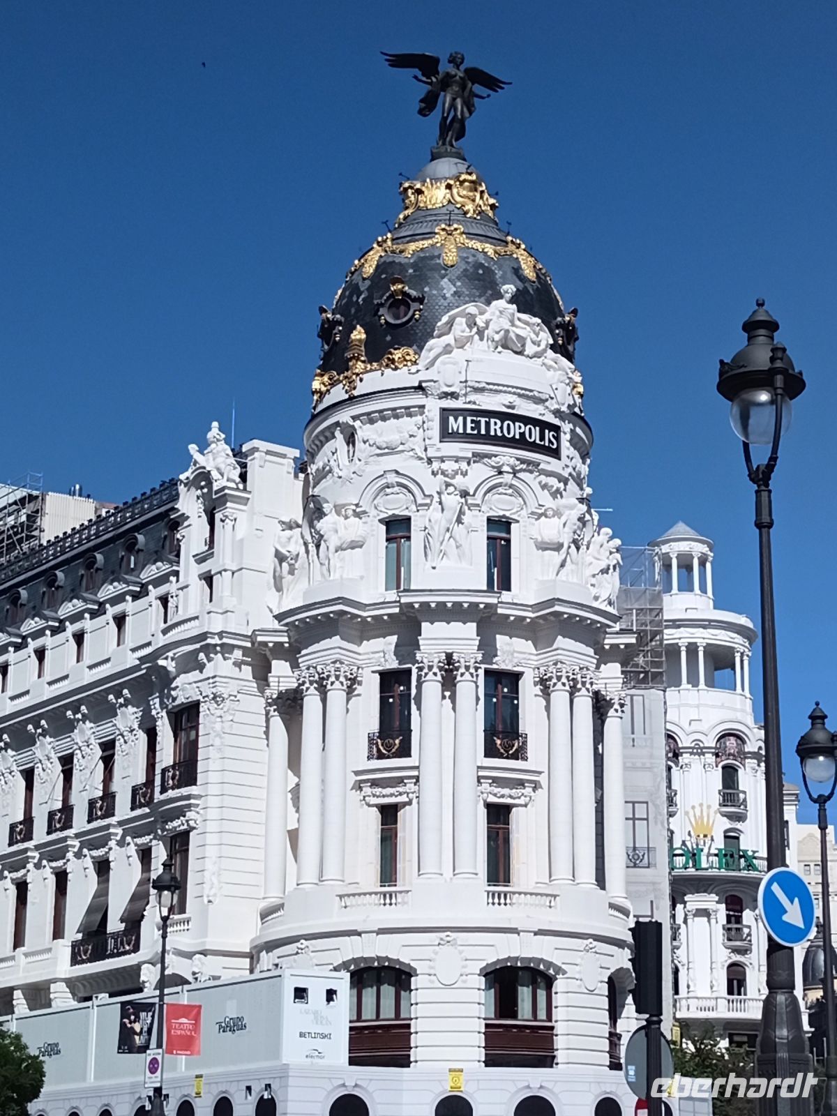 Auf dem Rückweg spazierten wir über die Gran Vía, Madrids prächtige Hauptstraße, die für ihre eindrucksvolle Architektur bekannt ist. Gleich am Anfang beeindruckte uns das Metropolis-Gebäude mit seiner kunstvollen Fassade und der goldenen Kuppel, die von einer Siegesgöttin gekrönt wird.