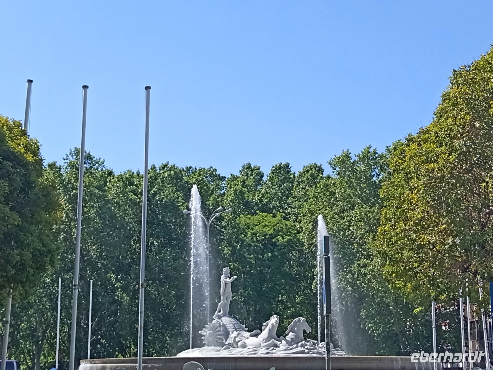 Wir folgen weiter der Calle de Alcalá bis zur Plaza de Cibeles. Dort machen wir eine kurze Pause. Anschließend erkunden wir die Paseo del Prado und Thomas erklärt uns die drei bedeutenden Brunnen entlang der Straße: den Cibeles-Brunnen (Symbol der Stadt), „Fuente de Cibeles“, der monumentalen Brunnen, der die Göttin Kybele auf einem von Löwen gezogenen Wagen zeigt.