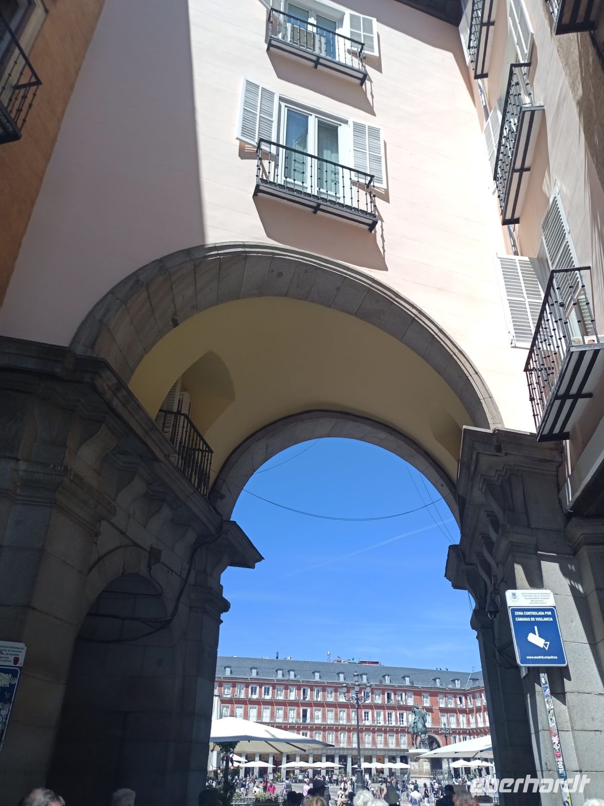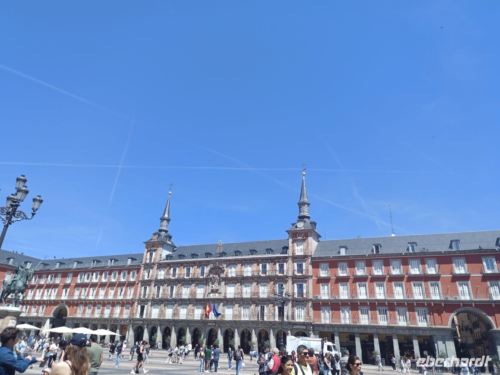 Die Plaza Mayor wurde im frühen 17. Jahrhundert unter Philipp III. errichtet und diente ursprünglich als Marktplatz, später auch für Feste, Stierkämpfe und Inquisitionstribunale. Das Denkmal in der Mitte zeigt Philipp III. zu Pferd, ein Geschenk des Großherzogs der Toskana. Die umliegenden Gebäude sind typisch für die Zeit der Habsburger mit ihren geschlossenen Arkadengängen und schlichten Fassaden.