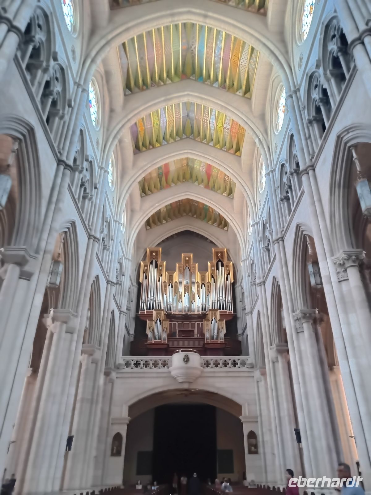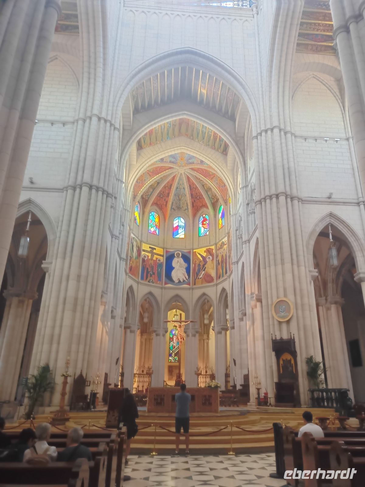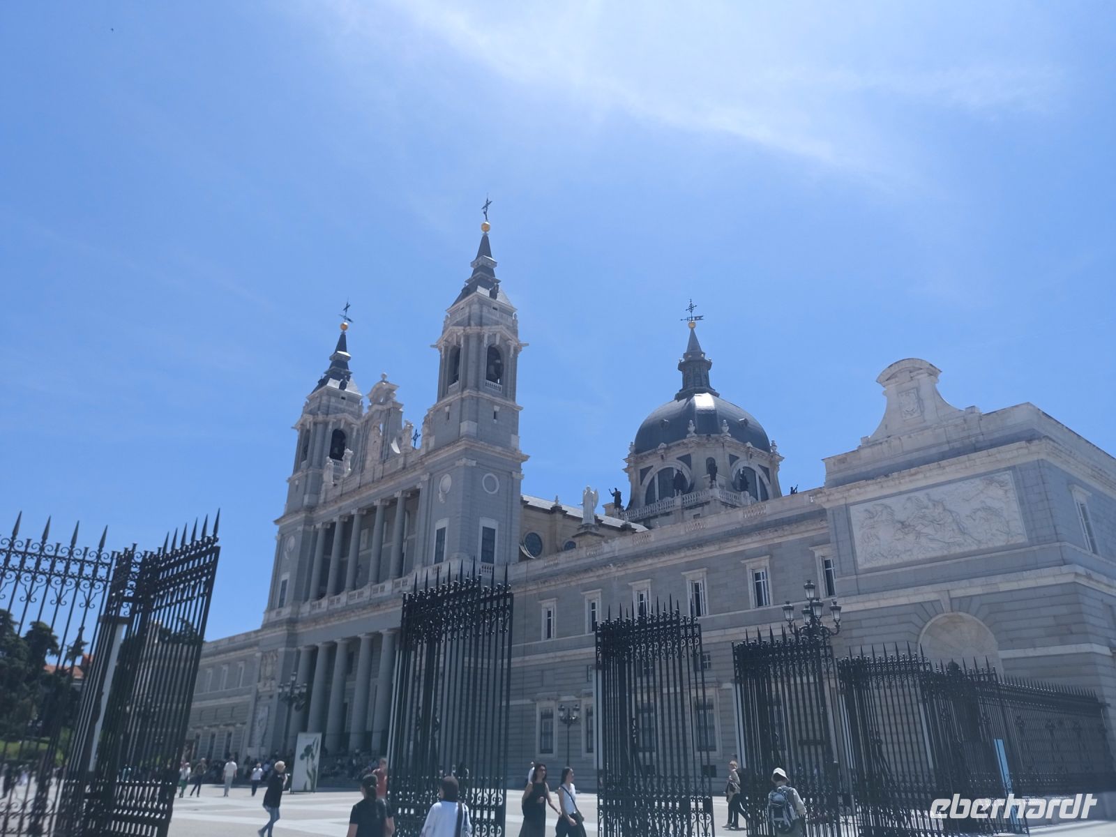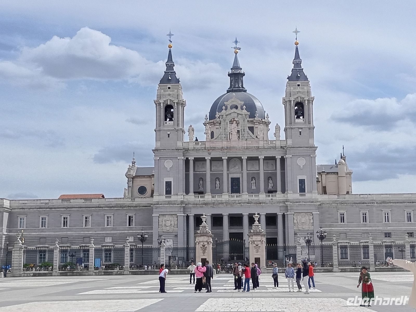 Damit endet unser erster Stadtrundgang. Es ist früher Nachmittag und ich schlage vor, noch die Almudena-Kathedrale zu besuchen – fast alle aus der Gruppe kommen mit. Gemeinsam spazieren wir zur größten Kathedrale Madrids, die sich direkt gegenüber dem Palacio Real erhebt.