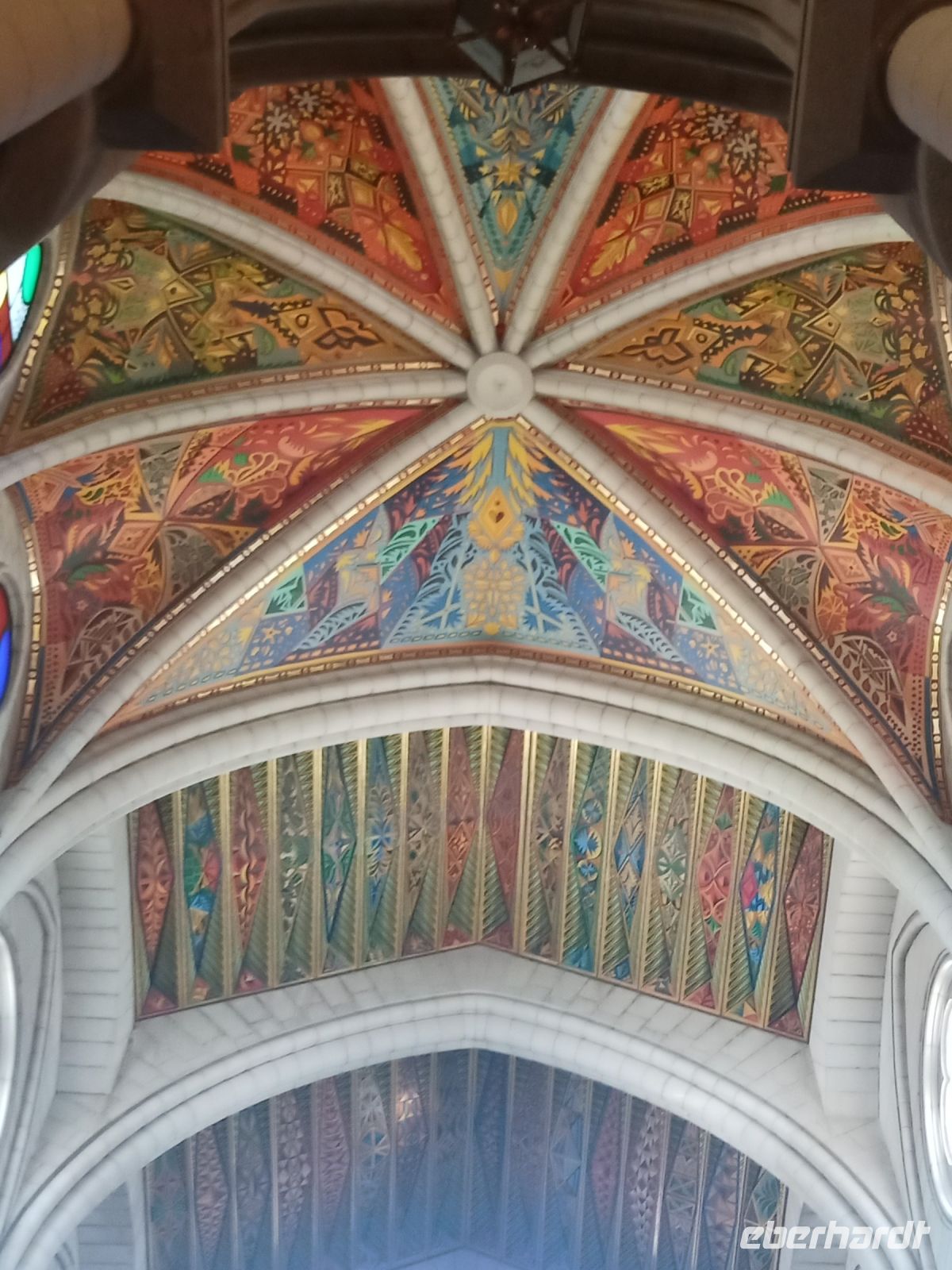 Die Catedral de Santa María la Real de la Almudena ist vergleichsweise jung: Der Bau begann im Jahr 1883, wurde jedoch erst 1993 von Papst Johannes Paul II. geweiht – als erste Kathedrale Spaniens, die in der Neuzeit fertiggestellt wurde. Ursprünglich als neugotischer Bau geplant, wurde sie im Laufe der Jahrzehnte in verschiedenen Stilrichtungen weitergebaut, was sich auch in ihrer Architektur widerspiegelt. So vereint die Kathedrale heute Elemente des Neoklassizismus an der Außenseite, neogotische Formen im Inneren. Besonders auffällig ist die moderne, lichtdurchflutete Gestaltung des Kirchenschiffs mit farbenfrohen Deckenmalereien und Buntglasfenstern.