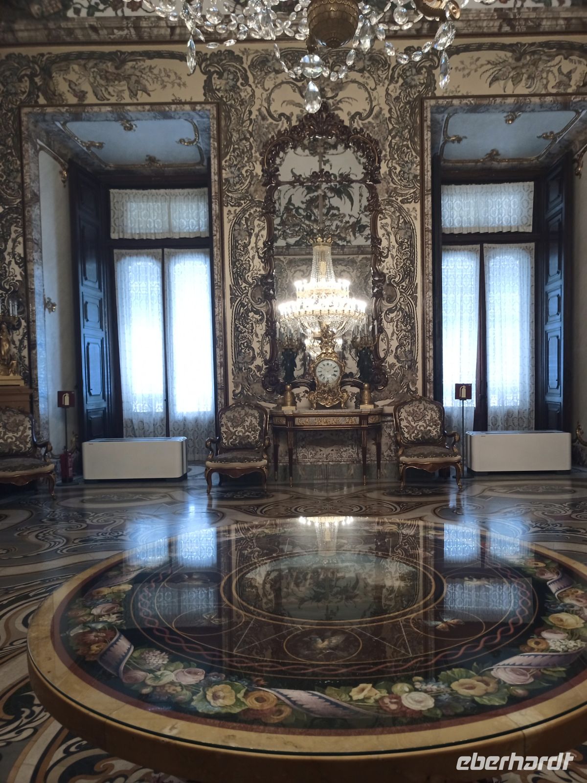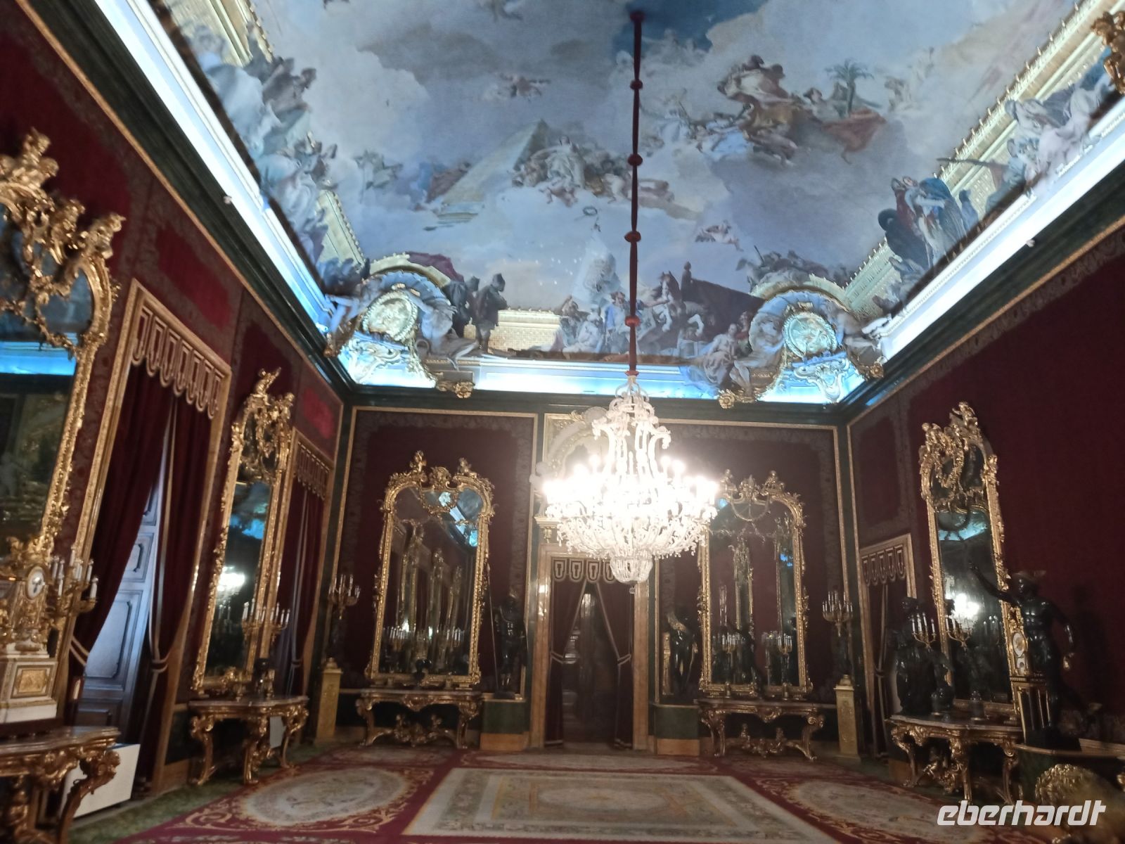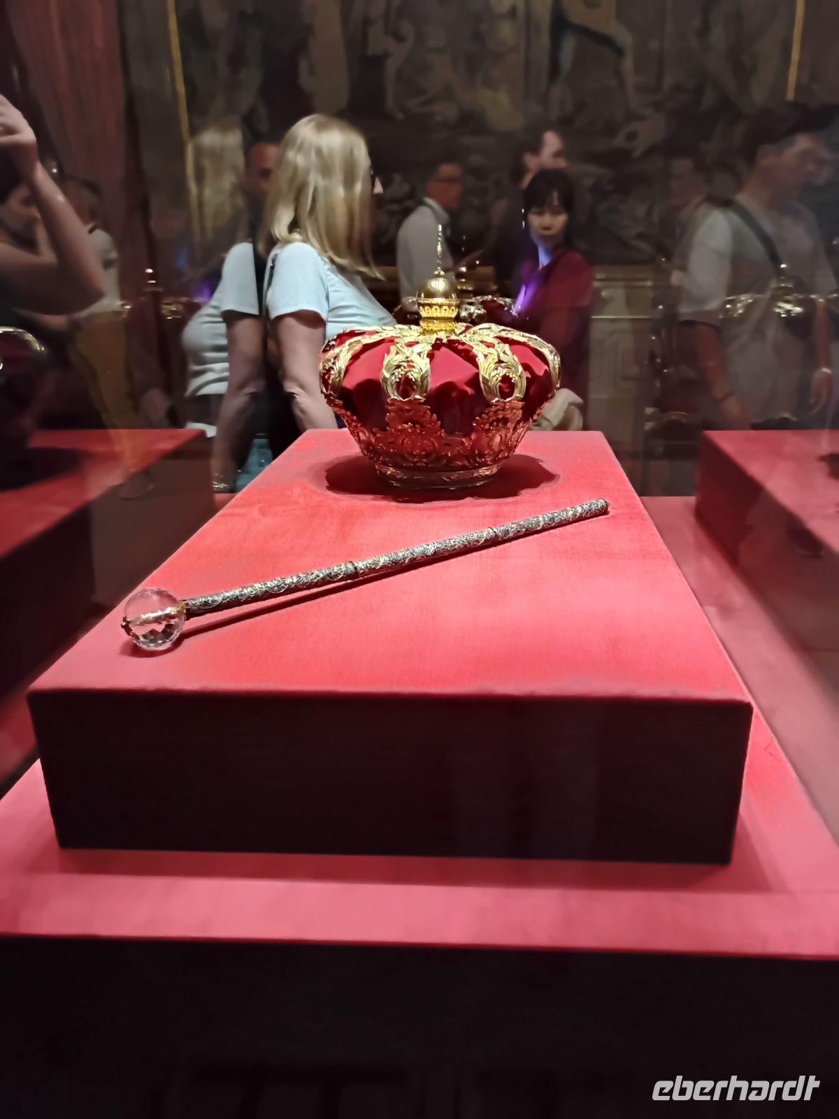 Wir durchqueren eine Reihe eindrucksvoller Säle – darunter der Thronsaal mit seinen roten Samttapeten, goldenen Ornamenten und kunstvollen Deckenfresken, sowie der Gasparini-Saal, dessen florale Wandverzierungen und filigrane Details einen bleibenden Eindruck hinterlassen. Besonders beeindruckt uns die königliche Kapelle mit ihrer prachtvollen Ausstattung und der feierlichen Stille, die sie ausstrahlt.