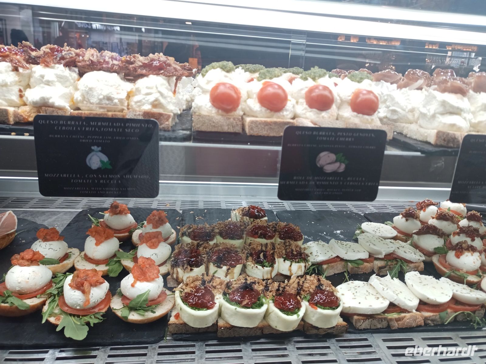 Eine bunte Auswahl an Tapas wird uns serviert – unser Tisch ist schnell bis zum Rand gefüllt. Wir genießen Klassiker wie Pan con Tomate, Patatas Bravas, Pimientos de Padrón, Garnelensalat, russischen Salat mit Thunfisch, Tortilla Española und zarten Tintenfisch.