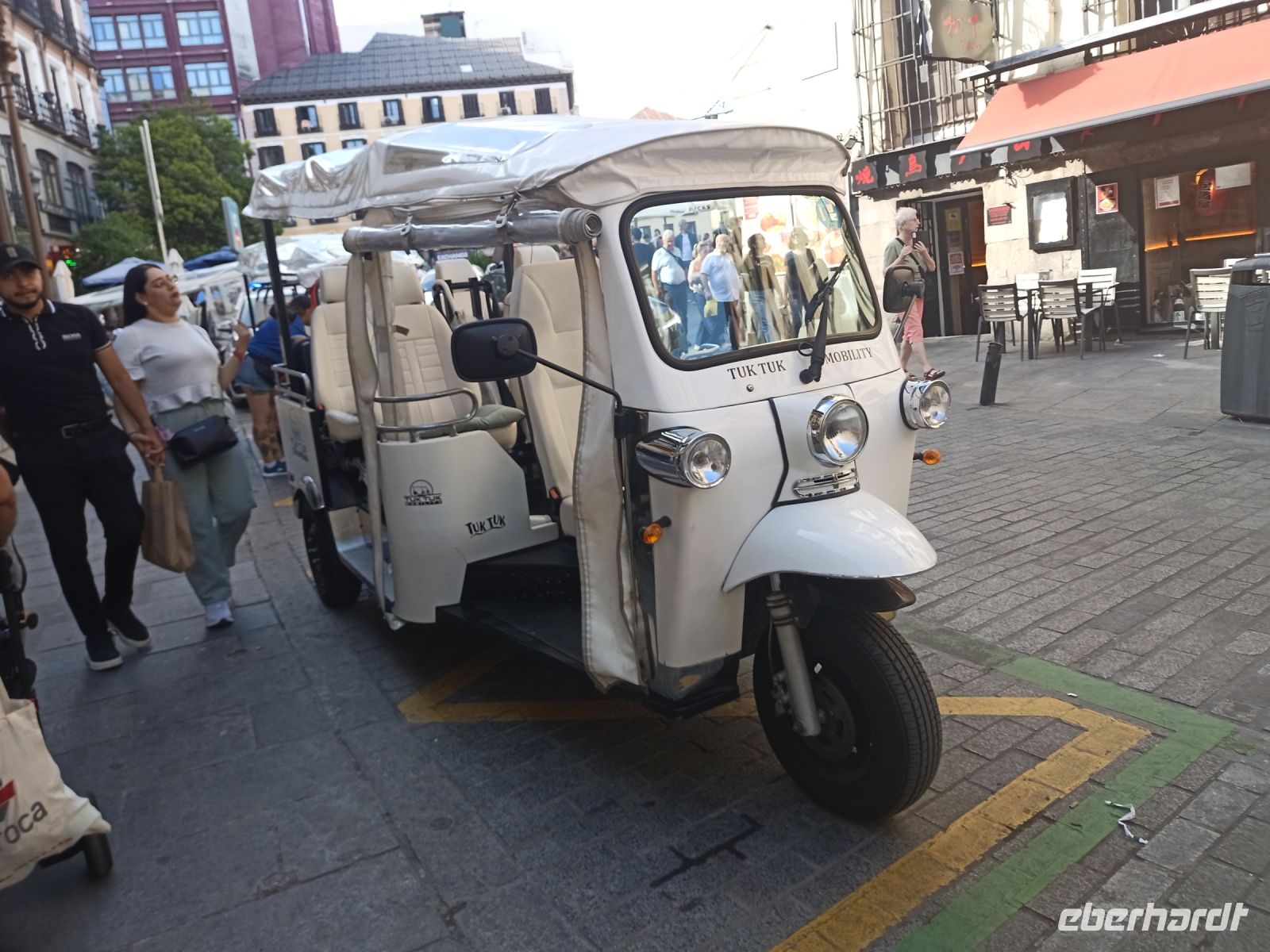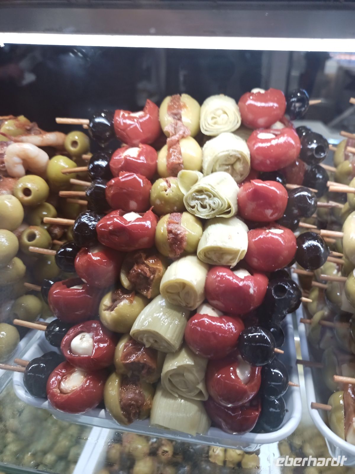 Zurück im Hotel nutzen wir die Zeit, um uns für den Abend frisch zu machen. Dann begeben wir uns zum Mercado de San Miguel. Die Stimmung ist lebhaft, der Markt ist voller Einheimischer und Touristen. Die Auslagen sind ein Fest für die Sinne: von iberischem Schinken über Fisch- und Meeresfrüchte-Tapas bis zu süßen Verführungen – alles ist kunstvoll angerichtet und lädt zum Probieren ein. Einige Gäste kosten direkt vor Ort.