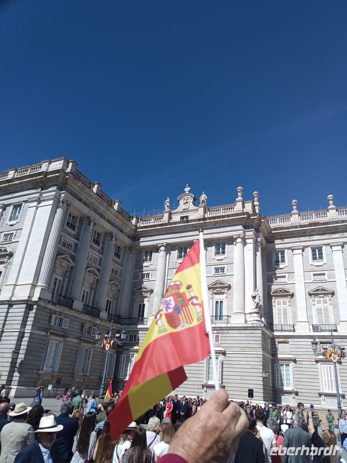 Die letzte Gruppe wird erst um 15 Uhr abgeholt – so bleibt noch ein ganzer Vormittag für letzte Erkundungen. Wie wir erfahren haben findet heute die feierliche Wachablösung vor dem Palacio Real statt.. So machen sich gegen 10 Uhr die Gäste auf den Weg zum Palacio Real, um diese Zeremonie hier live erleben. Schon vorher hat sich eine große Menschenmenge versammelt – es ist sonnig, die Stimmung feierlich, fast festlich. Viele Madrilenen und Touristen jubeln, wehen die spanischen Flaggen, fotografieren – ein echtes Spektakel voller Stolz und Tradition.