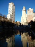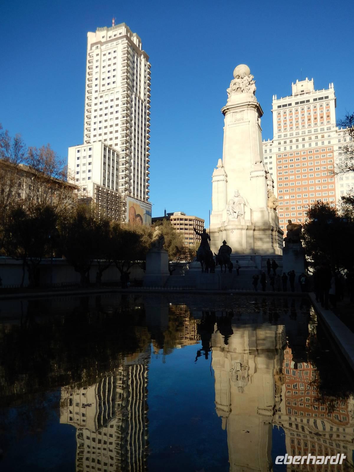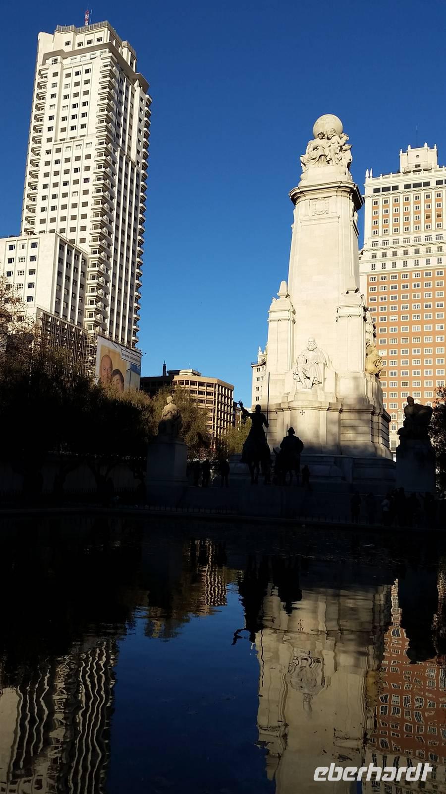 Um erst einmal ein bisschen Orientierung in meiner Heimatstadt zu gewinnen, starteten wir zu einer kleiner Panorama-Stadtrundfahrt auf dem Weg vom Flughafen zum Hotel. Die Fahrt führte uns über die Puerta de Alcala, und Plaza de Cibeles. Da vier andere Gäste aus Wien und Düsseldorf mit anderen Flügen und Transfers zum Hotel gebracht wurden, ließen wir uns die Stierkampfarena, die Paseo Castellana mit dem Real Madrid Stadion und die Hochhäuser Viertel für die nächsten Tagen. Kurze Zeit später checkten wir in unserem, im Herzen von Madrid gelegenen, 4-Sterne-Hotel Senator Gran Via 70 ein. Nun blieb Zeit, um sich frisch zu machen oder sich bei einem kleinen Nickerchen zu erholen, denn einige von uns waren am Morgen schon kurz nach Mitternacht abgeholt wurden. Um 16 Uhr trafen wir uns an der Rezeption vom Hotel. Nun hatten wir die Gelegenheit, erste Eindrücke dieser wunderbar pulsierenden Metropole zu gewinnen und die Umgebung unseres Hotels im Zentrum der Stadt zu erkunden. Gemeinsam unternahmen wir zu Fuß einen Stadtrundgang. Zunächst ging es auf die Plaza de España, wo sich Denkmäler berühmter Schriftsteller befinden.