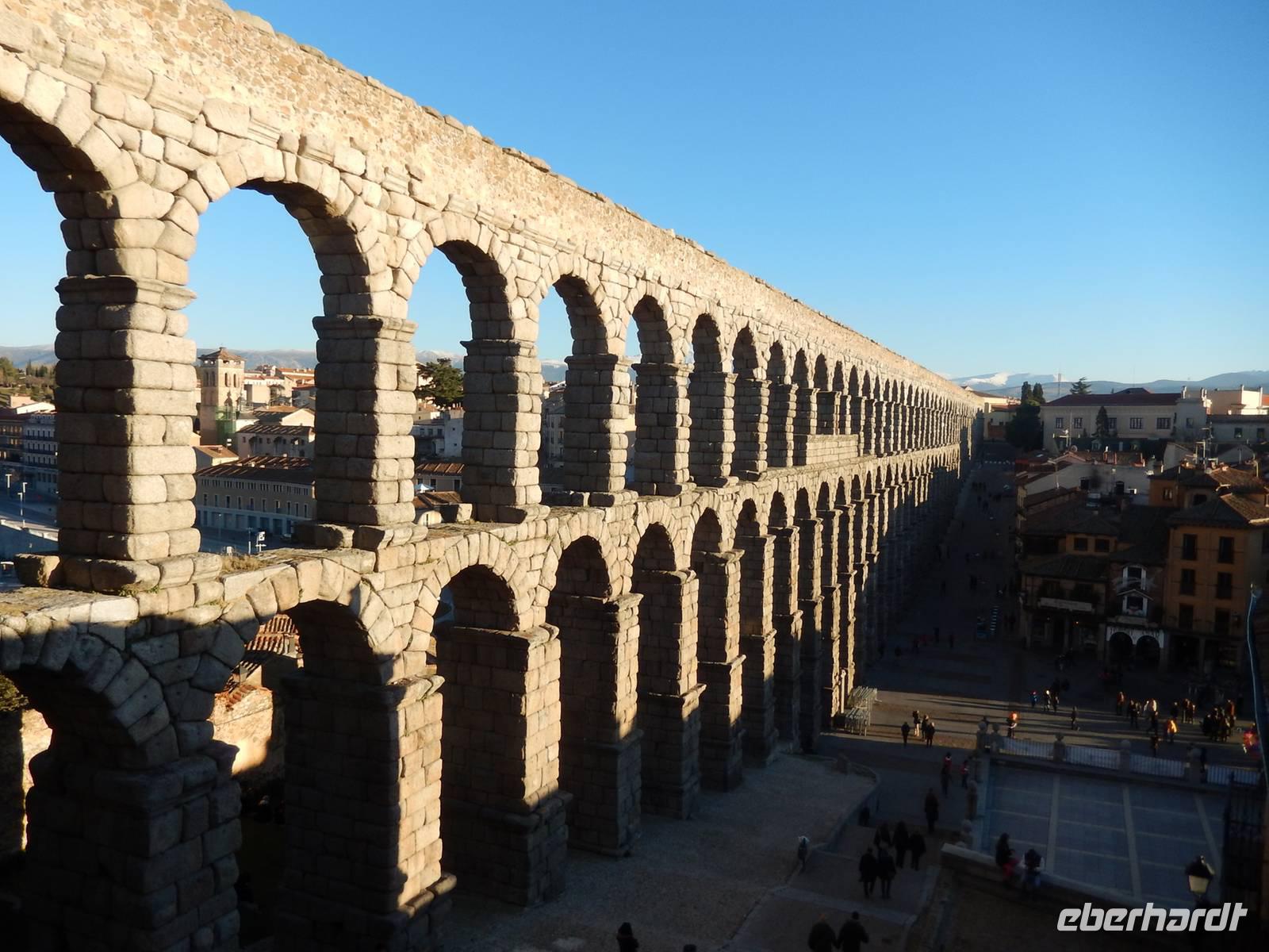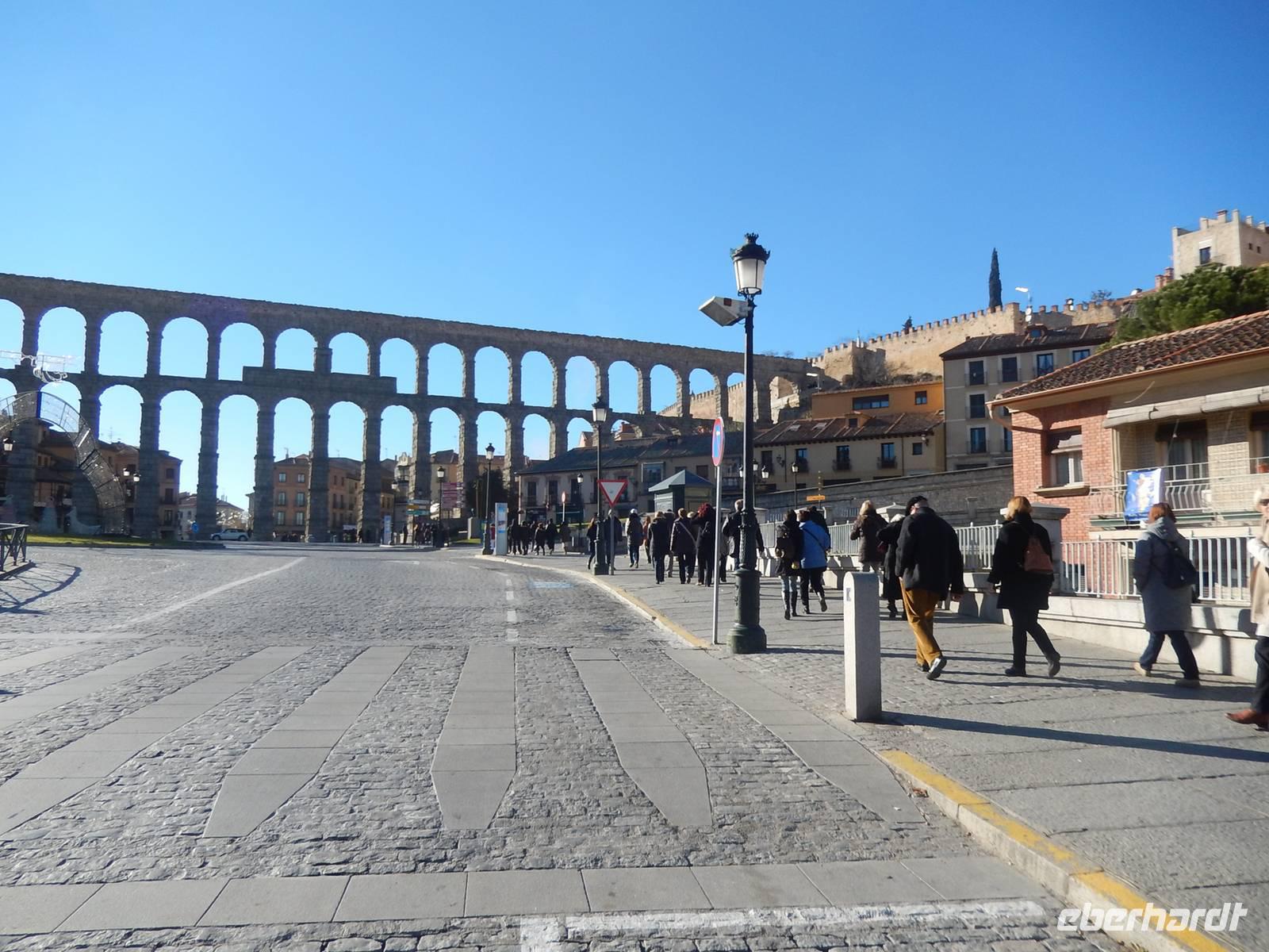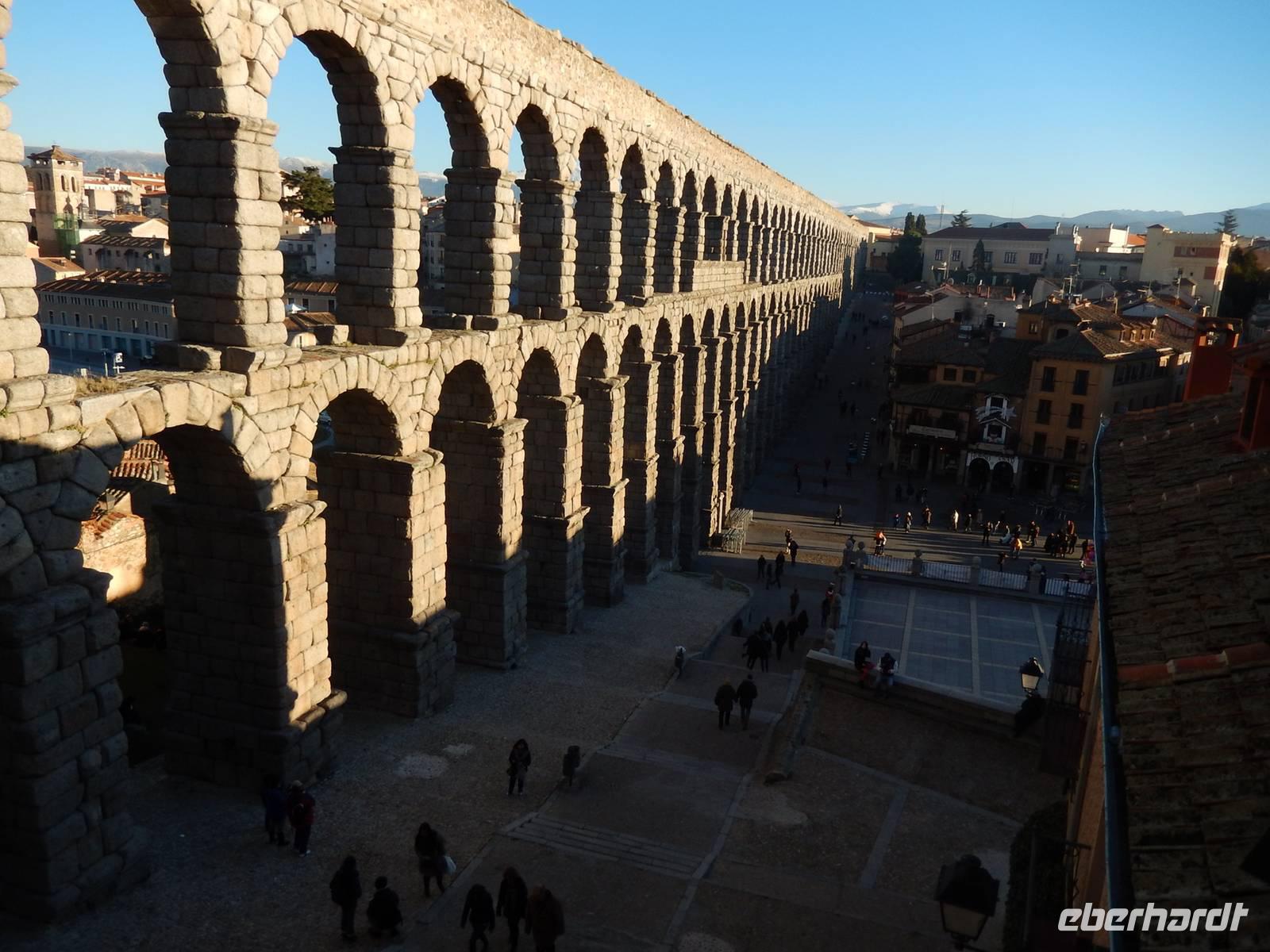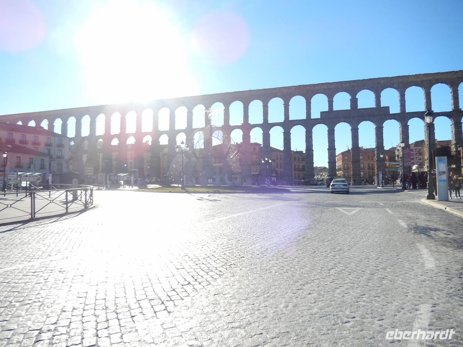 Nach einer schönen Kaffeepause an der Sonne fuhren wir über die Berge und über den „Löwen" Pass anschließend weiter in die Stadt Segovia, die insbesondere für ihre zahlreichen Kirchen aus romanischer Zeit berühmt geworden ist. Als besonderer Höhepunkt gilt das über 28 Meter hohe antike römische Aquädukt. Majestätisch erhebt sich dieser eindrucksvolle Bau in mitten der Stadt und durchläuft diese auf 700 Meter Länge. Wir hatten heute keine Zeit zum Mittagessen, um die berühmte Spezialität „Cochinillo" (BabySchwein) zu essen aber nach dem großes Silvester Essen von gestern, hatten wir auch noch keinen richtigen Hunger.