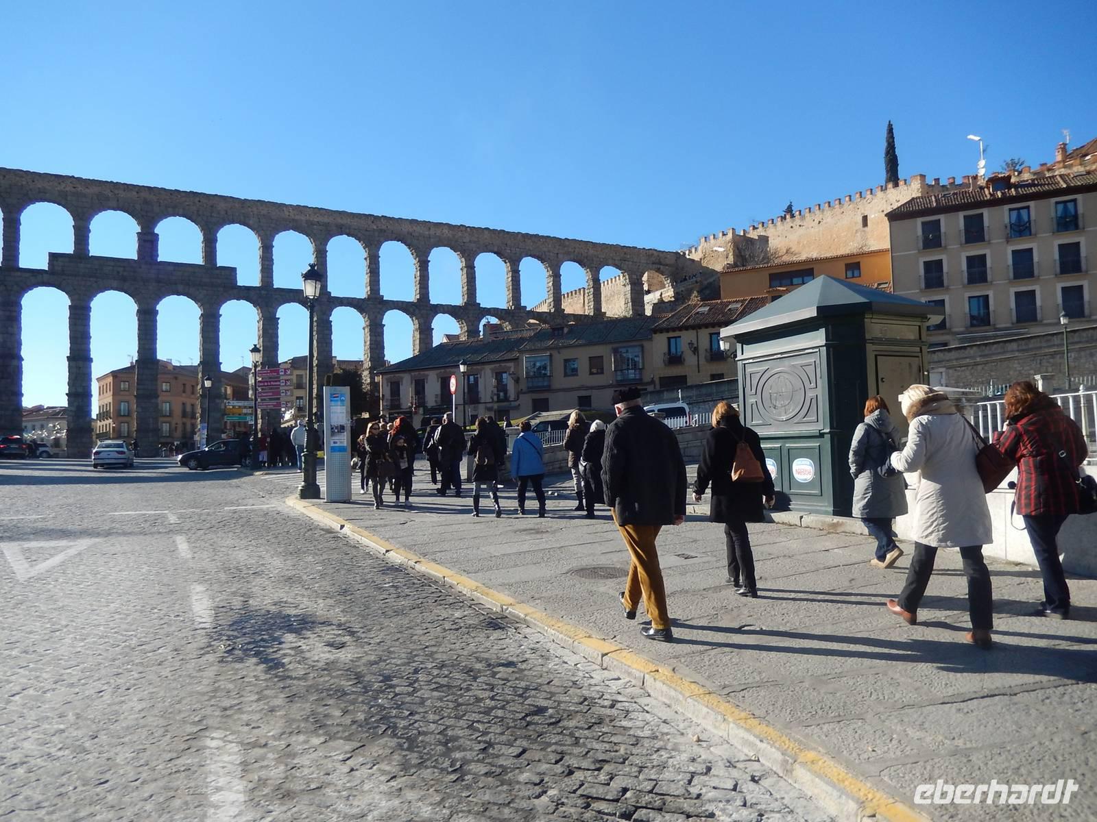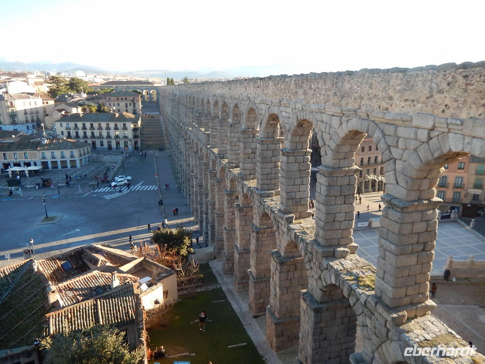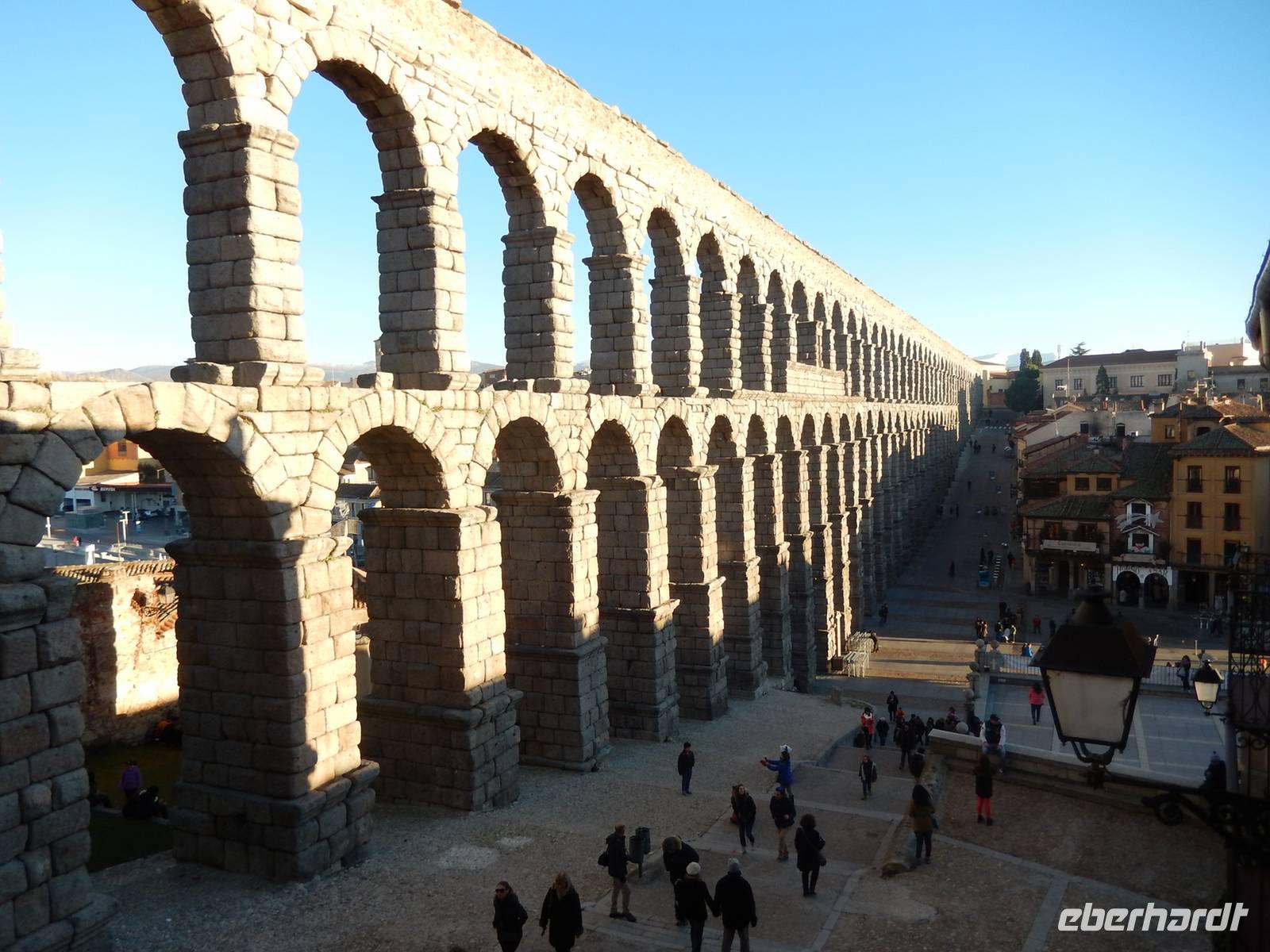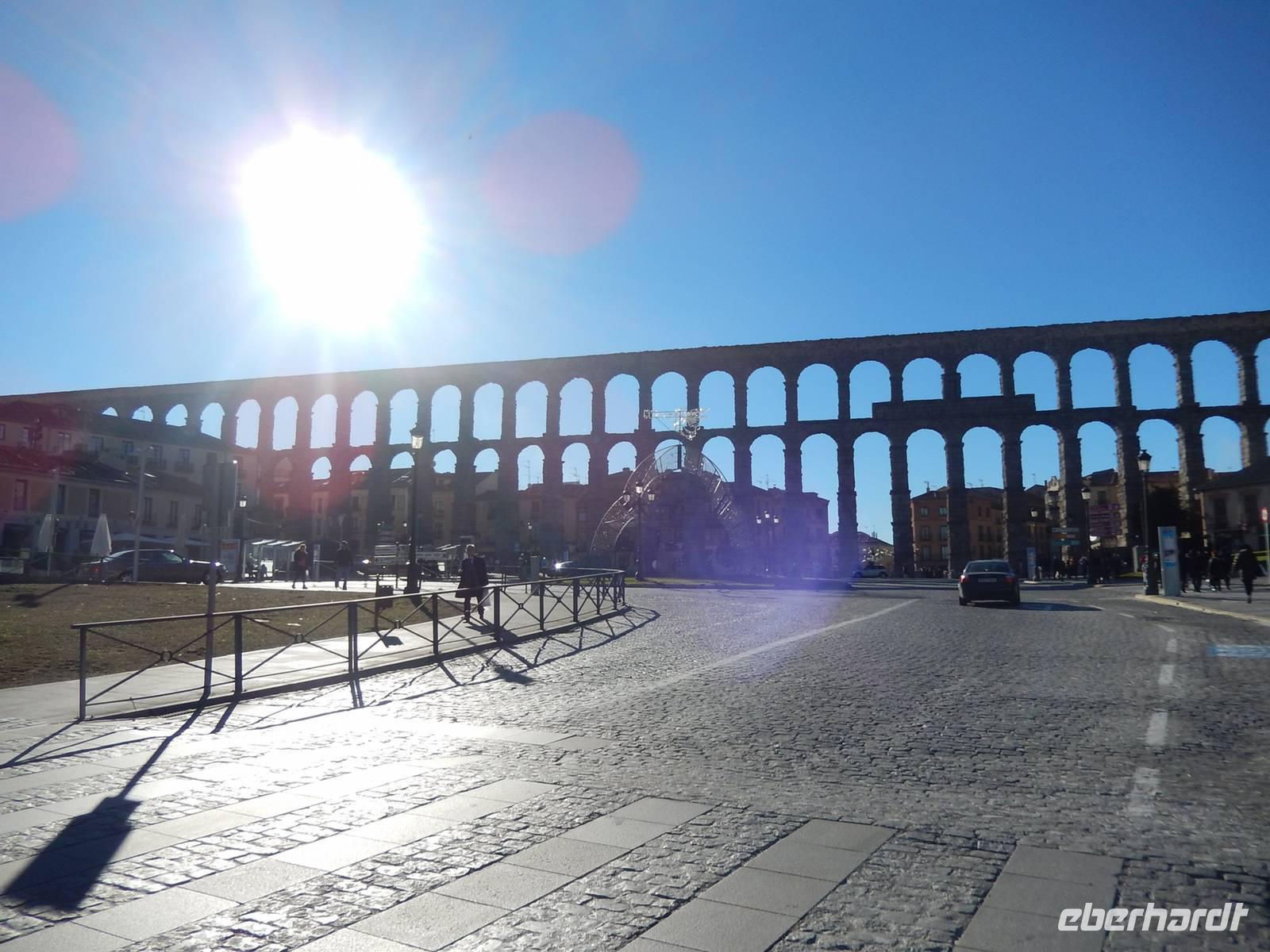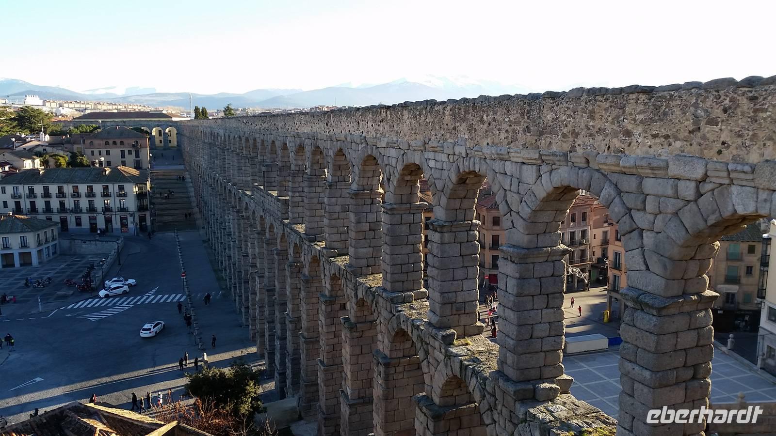 Nach einer schönen Kaffeepause an der Sonne fuhren wir über die Berge und über den „Löwen" Pass anschließend weiter in die Stadt Segovia, die insbesondere für ihre zahlreichen Kirchen aus romanischer Zeit berühmt geworden ist. Als besonderer Höhepunkt gilt das über 28 Meter hohe antike römische Aquädukt. Majestätisch erhebt sich dieser eindrucksvolle Bau in mitten der Stadt und durchläuft diese auf 700 Meter Länge. Wir hatten heute keine Zeit zum Mittagessen, um die berühmte Spezialität „Cochinillo" (BabySchwein) zu essen aber nach dem großes Silvester Essen von gestern, hatten wir auch noch keinen richtigen Hunger.
