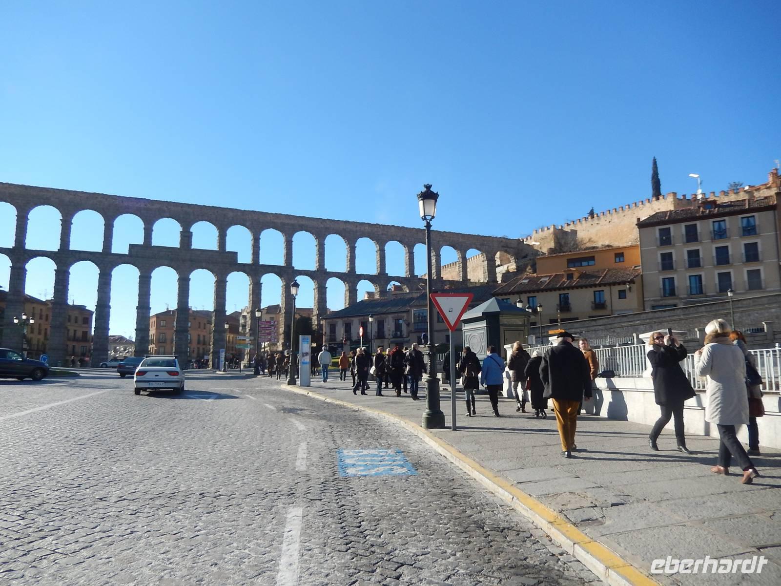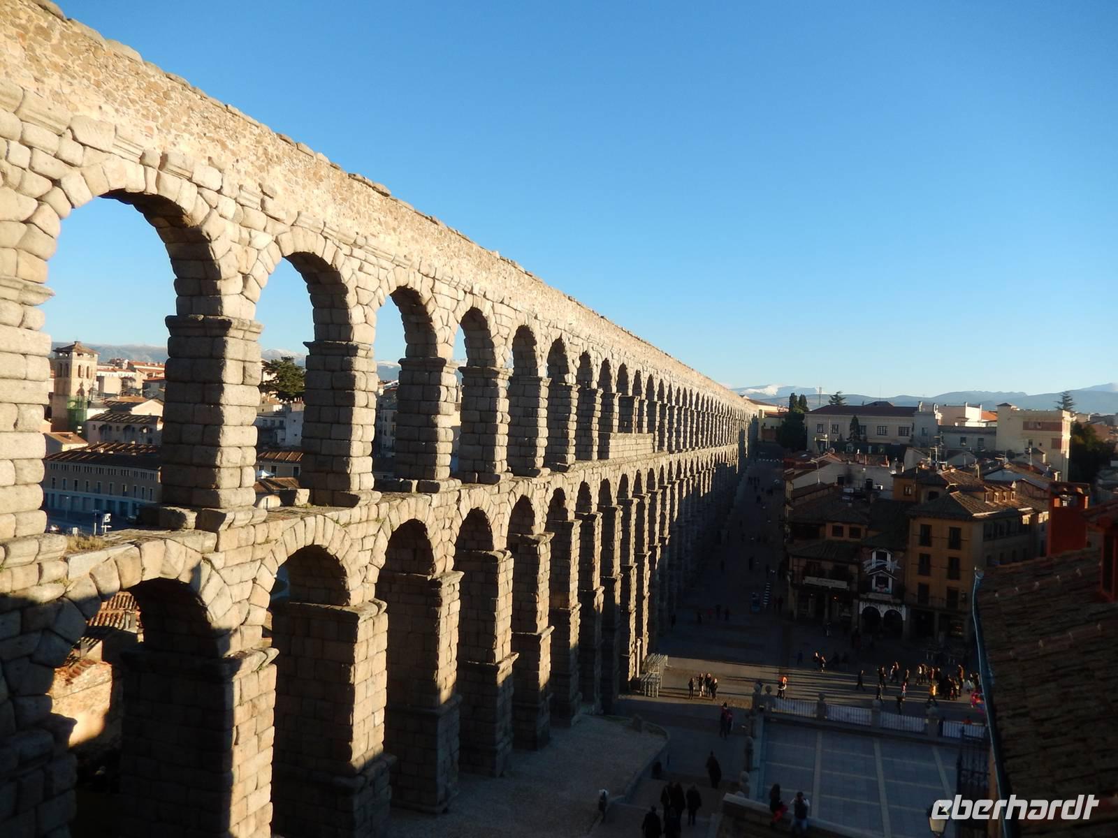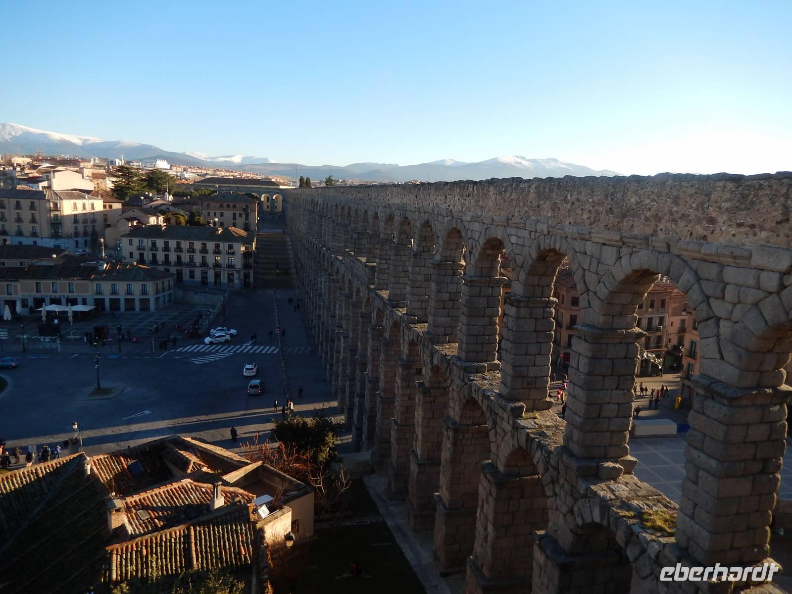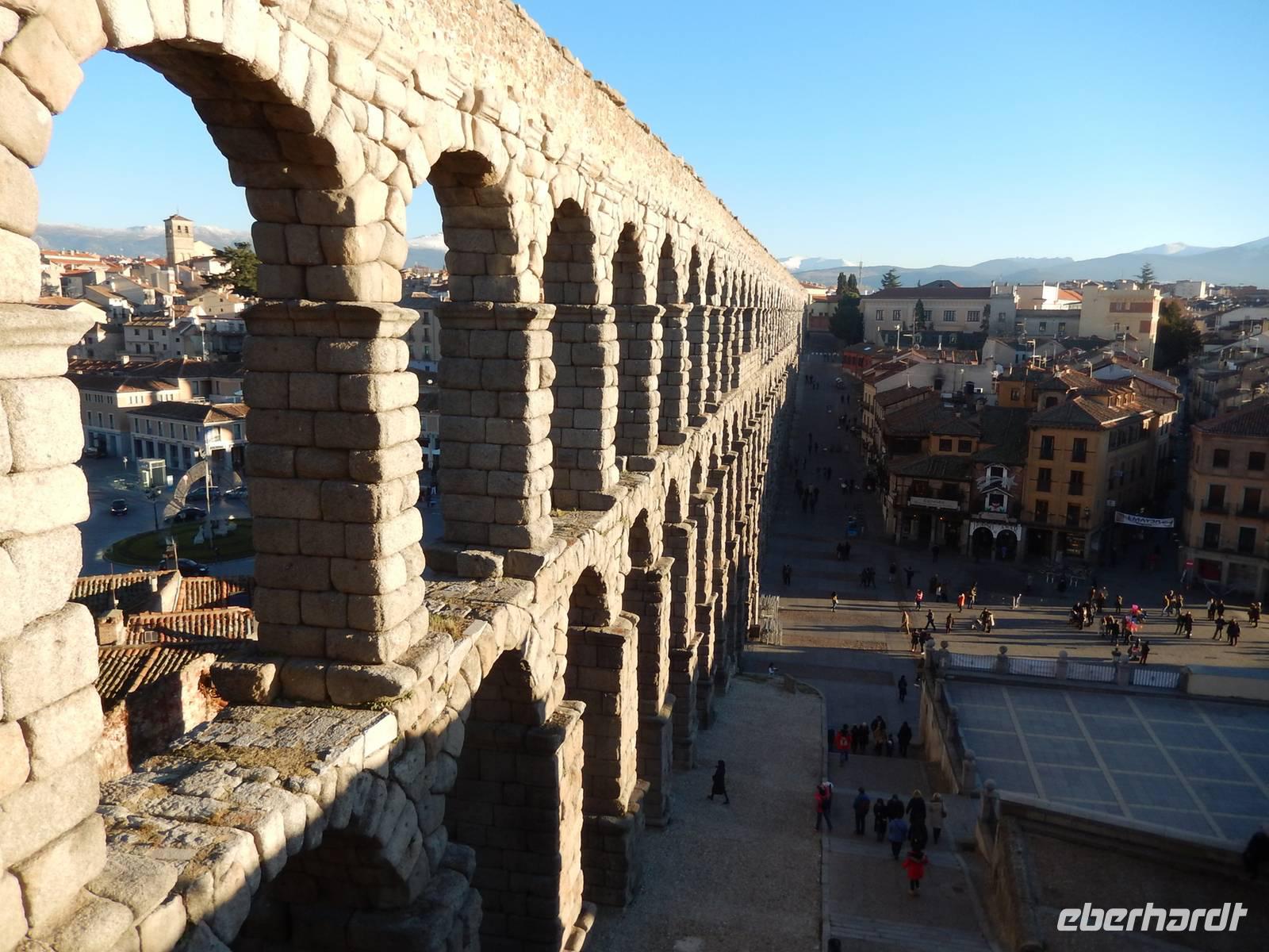 Nach einer schönen Kaffeepause an der Sonne fuhren wir über die Berge und über den „Löwen" Pass anschließend weiter in die Stadt Segovia, die insbesondere für ihre zahlreichen Kirchen aus romanischer Zeit berühmt geworden ist. Als besonderer Höhepunkt gilt das über 28 Meter hohe antike römische Aquädukt. Majestätisch erhebt sich dieser eindrucksvolle Bau in mitten der Stadt und durchläuft diese auf 700 Meter Länge. Wir hatten heute keine Zeit zum Mittagessen, um die berühmte Spezialität „Cochinillo" (BabySchwein) zu essen aber nach dem großes Silvester Essen von gestern, hatten wir auch noch keinen richtigen Hunger.