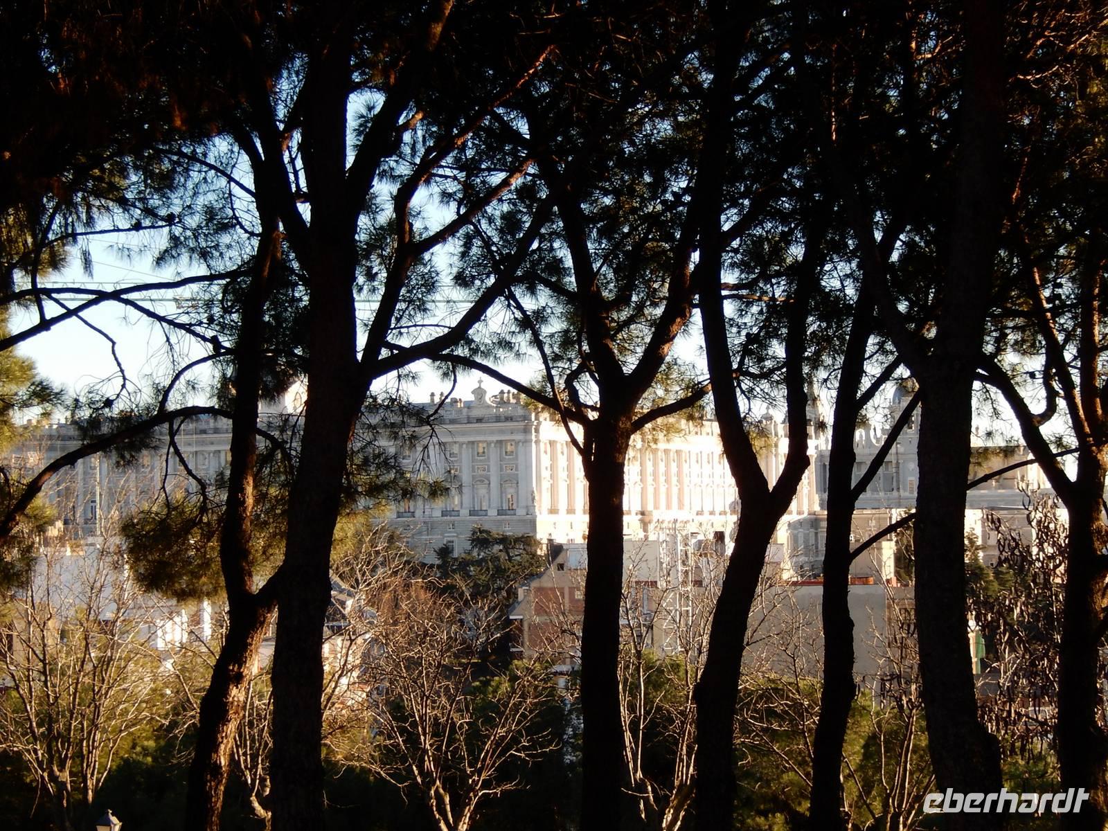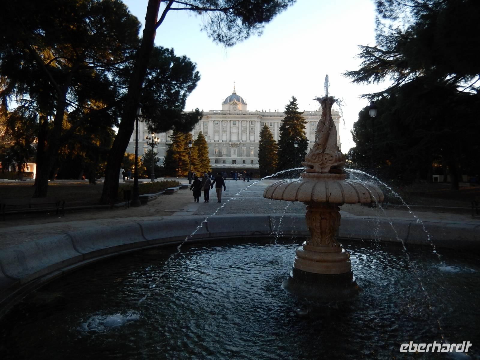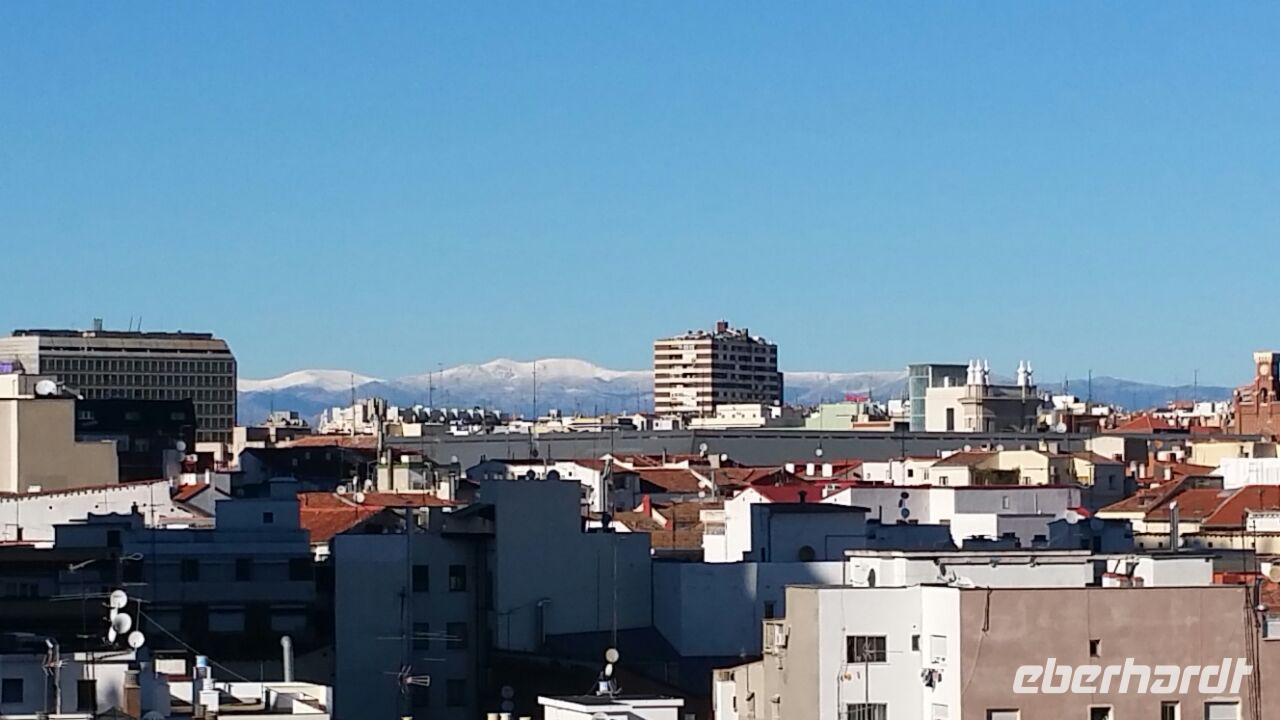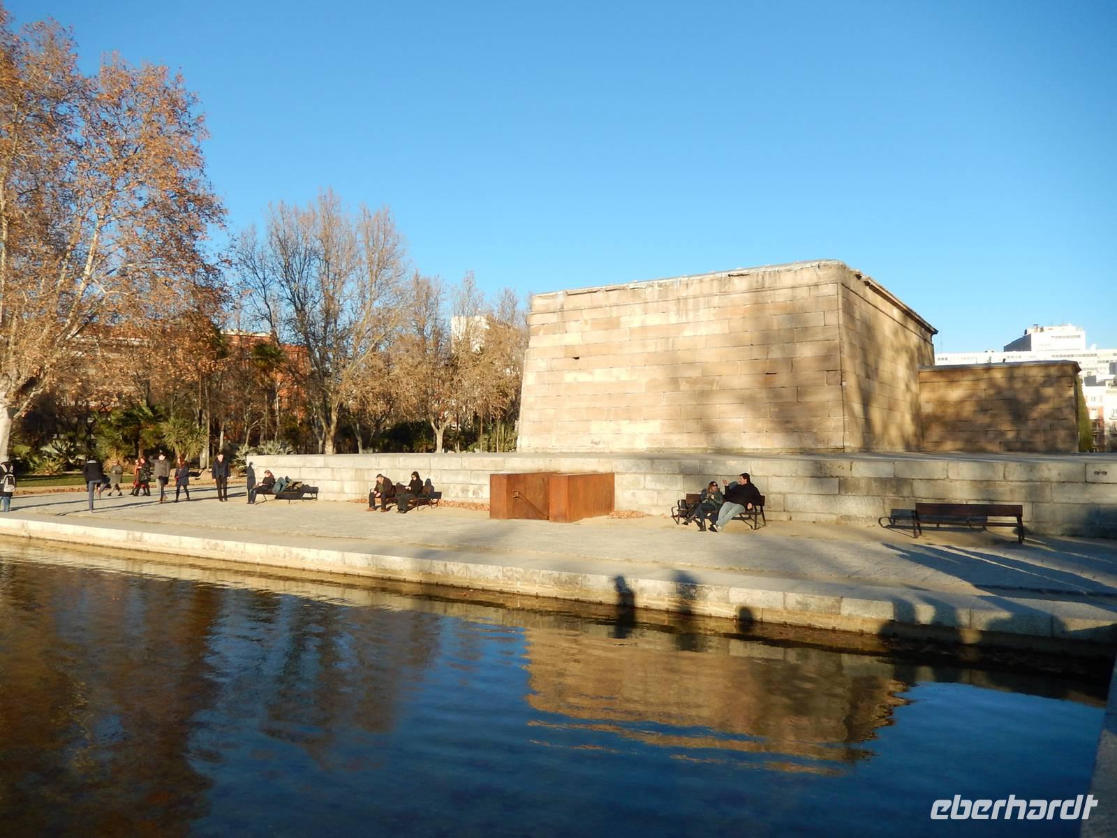Anschließend gingen wir zu der berühmte „Templo de Debod", dem kleinen altägyptischen Tempel und ältesten Bauwerk Madrids. Es war ein Geschenk der ägyptischen Regierung an Spanien zum Dank für die Hilfe der spanischen Archäologen bei der Rettung Abu Simbels während des Baus des Asusanstaudamms vor mehr als 50 Jahren. Von hier hat man einen der besten Ausblicke von Madrid bis zu den Gebirgsketten voller Schnee über den Königspalast und die Casa de Campo. Wir wollten heute gar nicht viel mehr sehen, da wir noch einen richtigen Stadtrundgang am Mittwoch haben würden, aber einen erste Eindruck von meiner Heimat wollte ich meinen Gästen schon heute geben. Wir hatten riesig Glück mit dem Wetter in diesen Tage, da es immer sonnig war. Man darf nicht vergessen, dass sich Madrid in einer Höhe von 665 Metern befindet. Wenn die Sonne scheint, ist es sehr angenehm, aber am Abend und in der Nacht kann richtig frisch und kalt sein.
