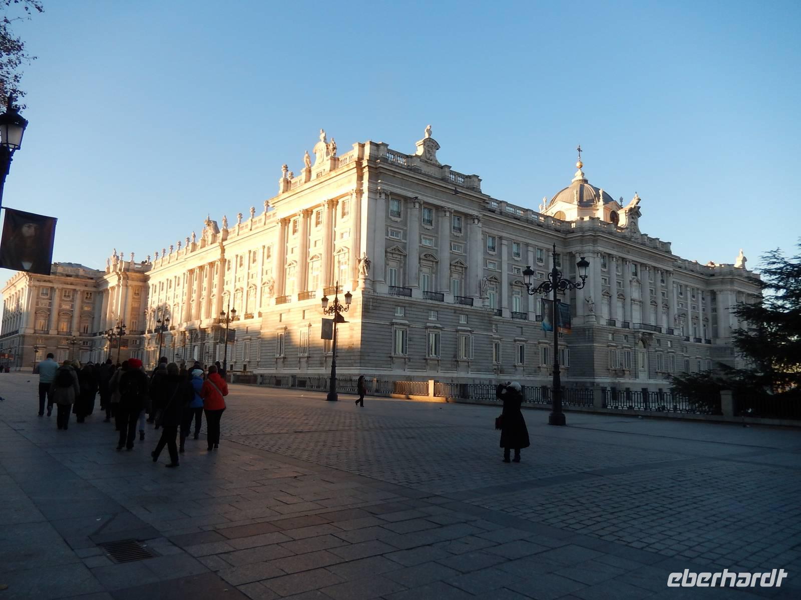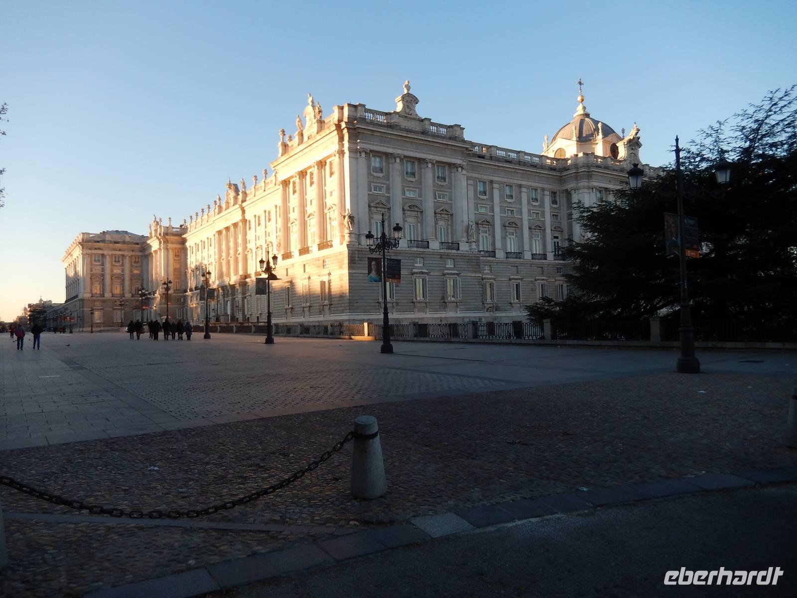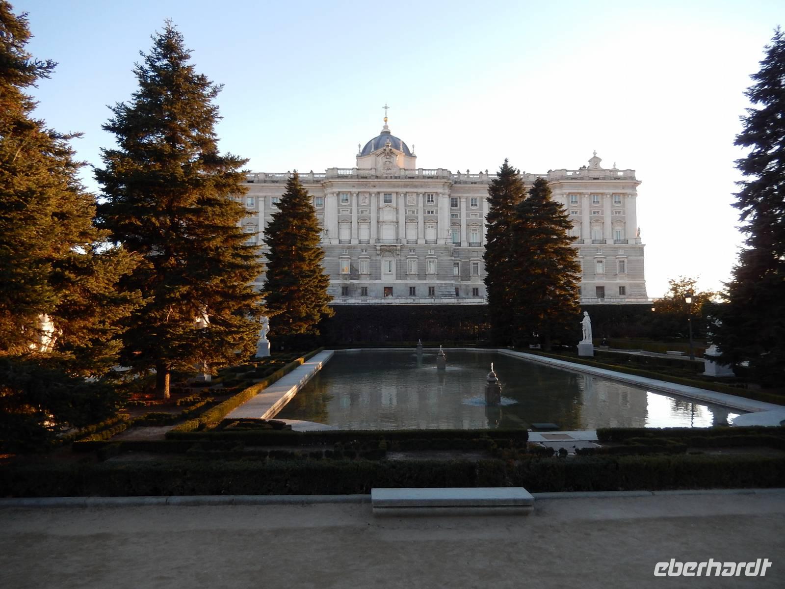 Anschließend gingen wir zu der berühmte „Templo de Debod", dem kleinen altägyptischen Tempel und ältesten Bauwerk Madrids. Es war ein Geschenk der ägyptischen Regierung an Spanien zum Dank für die Hilfe der spanischen Archäologen bei der Rettung Abu Simbels während des Baus des Asusanstaudamms vor mehr als 50 Jahren. Von hier hat man einen der besten Ausblicke von Madrid bis zu den Gebirgsketten voller Schnee über den Königspalast und die Casa de Campo. Wir wollten heute gar nicht viel mehr sehen, da wir noch einen richtigen Stadtrundgang am Mittwoch haben würden, aber einen erste Eindruck von meiner Heimat wollte ich meinen Gästen schon heute geben. Wir hatten riesig Glück mit dem Wetter in diesen Tage, da es immer sonnig war. Man darf nicht vergessen, dass sich Madrid in einer Höhe von 665 Metern befindet. Wenn die Sonne scheint, ist es sehr angenehm, aber am Abend und in der Nacht kann richtig frisch und kalt sein.