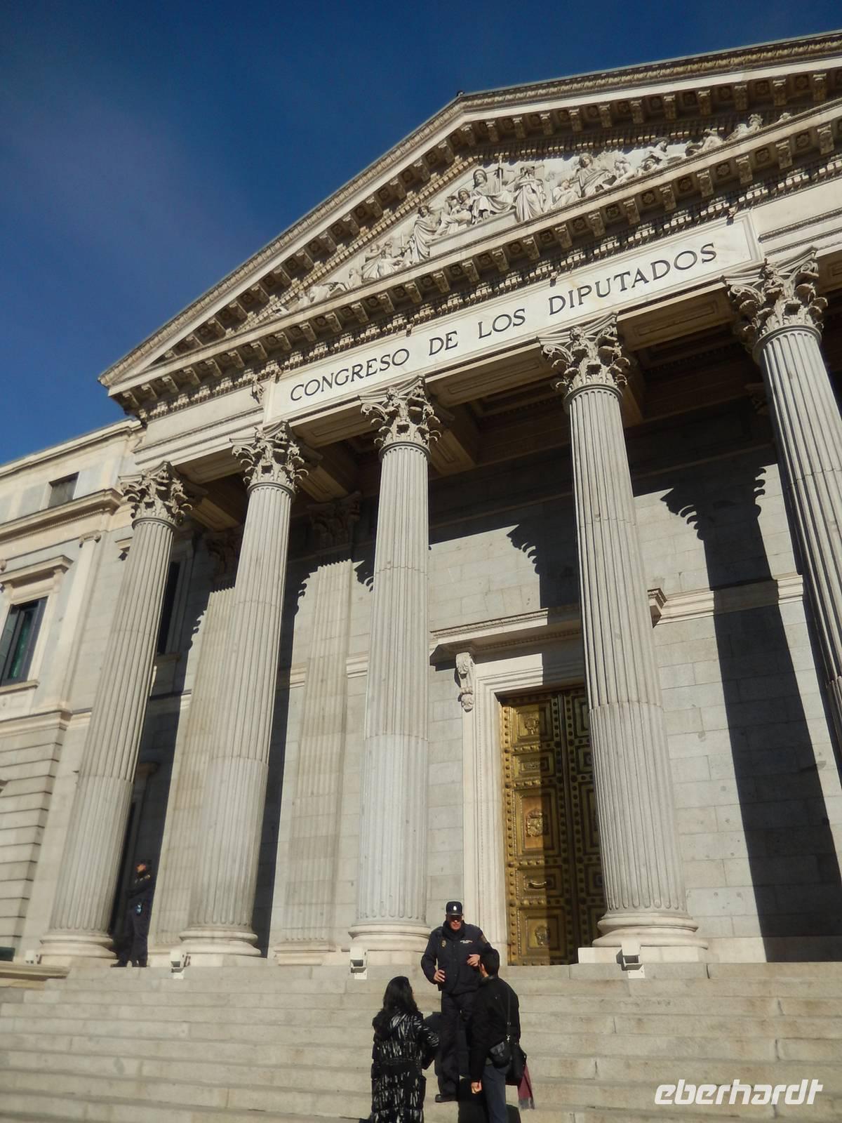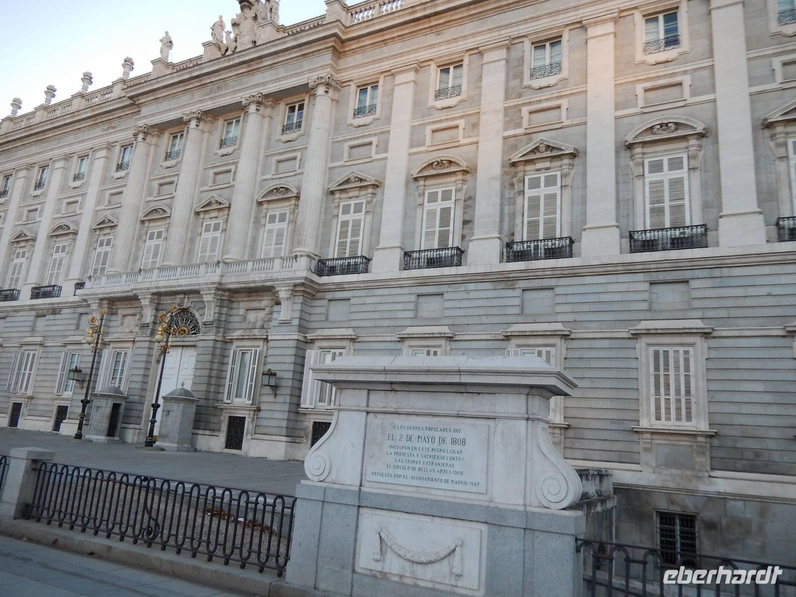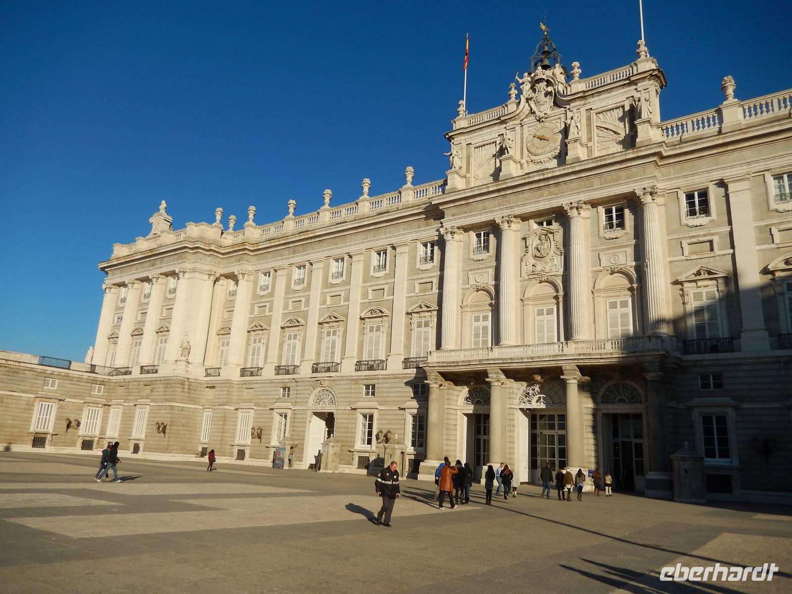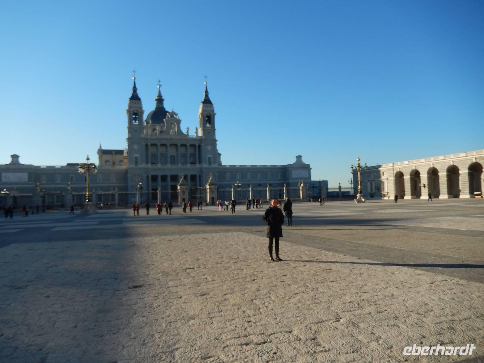 Anschließend gingen wir zu der berühmte „Templo de Debod", dem kleinen altägyptischen Tempel und ältesten Bauwerk Madrids. Es war ein Geschenk der ägyptischen Regierung an Spanien zum Dank für die Hilfe der spanischen Archäologen bei der Rettung Abu Simbels während des Baus des Asusanstaudamms vor mehr als 50 Jahren. Von hier hat man einen der besten Ausblicke von Madrid bis zu den Gebirgsketten voller Schnee über den Königspalast und die Casa de Campo. Wir wollten heute gar nicht viel mehr sehen, da wir noch einen richtigen Stadtrundgang am Mittwoch haben würden, aber einen erste Eindruck von meiner Heimat wollte ich meinen Gästen schon heute geben. Wir hatten riesig Glück mit dem Wetter in diesen Tage, da es immer sonnig war. Man darf nicht vergessen, dass sich Madrid in einer Höhe von 665 Metern befindet. Wenn die Sonne scheint, ist es sehr angenehm, aber am Abend und in der Nacht kann richtig frisch und kalt sein.
