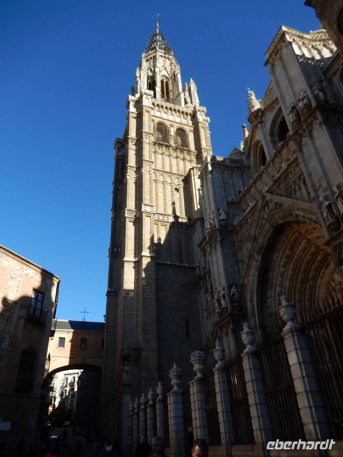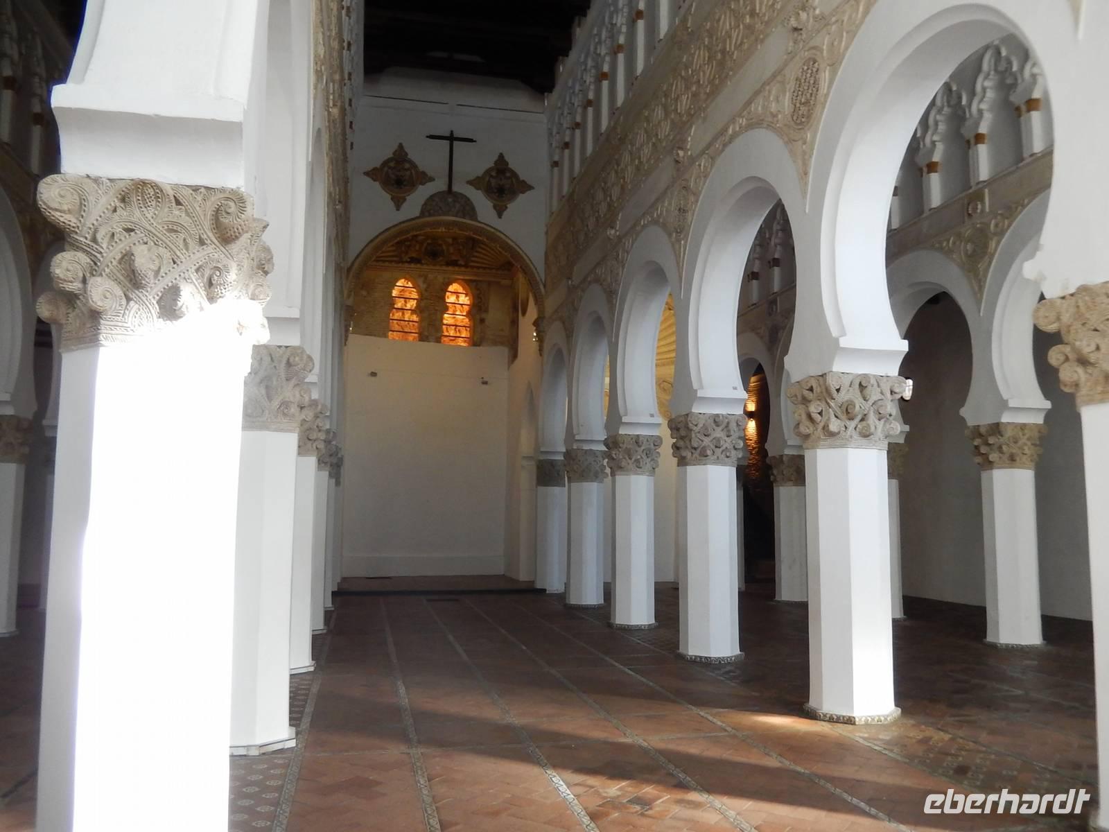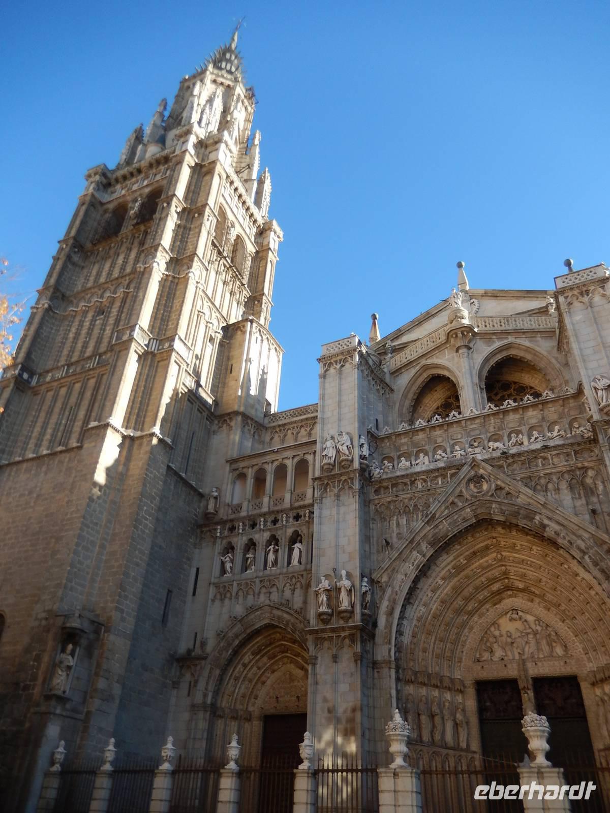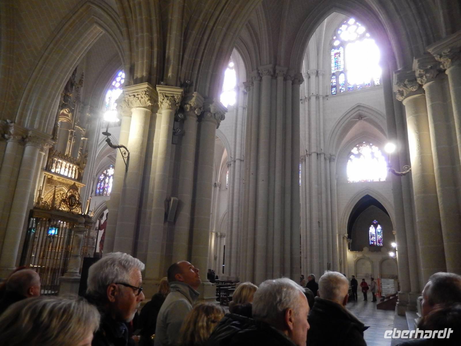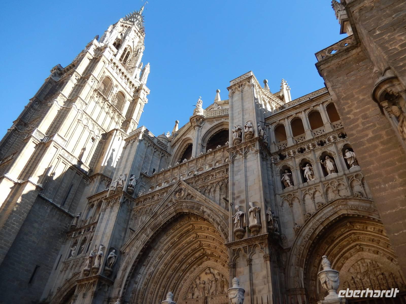 Eines der Wahrzeichen der Stadt, den Arco de la Sangre, lernten wir bei einer Stadtführung kennen. Der aus Cervantes "Don Quijote" bekannte Bogen mit dem dahinter liegenden Alcazar (Palast) ist ein traumhaftes Fotomotiv. Wir fingen bei dem Zocodover Platz an und spazierten gemeinsam durch die Straßen von Toledo. Zuerst besuchten wir die imposante Kathedrale. Dieser Dom hat 2 Türme, aber einer war nicht zu Ende gebaut worden, da dann das Geld gefehlt hatte. Von innen erinnerte uns dieser Dom an den von Sevilla oder Malaga. Später besuchten wir das berühmtes Bild von El Greco „Das Begräbnis von dem Graf Orgaz" und machten eine kleine Mittagspause an der Sonne. Weiter ging zu der jüdische Synagoge „Santa Maria La Blanca". Toledo ist ein einziges und gutes Beispiel wie damals Christen, Juden und Muslime in Friede zusammenleben konnten.