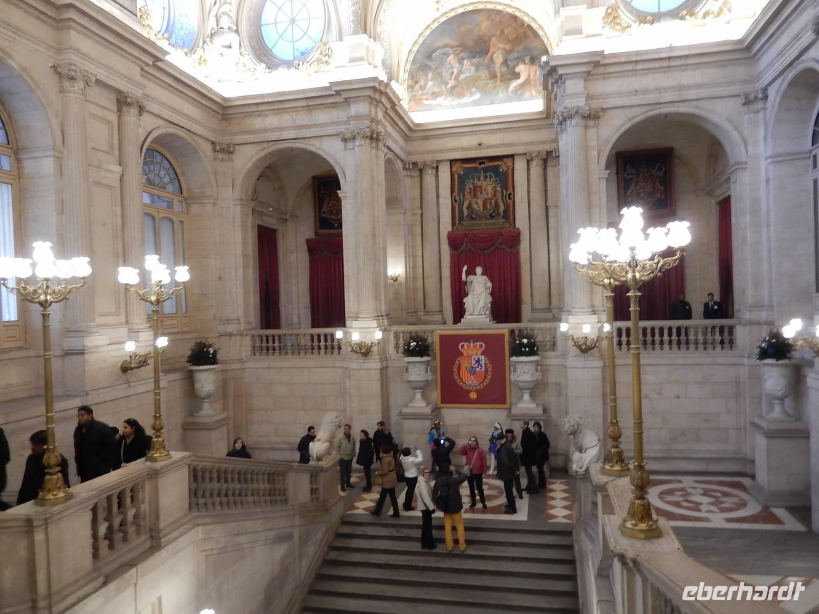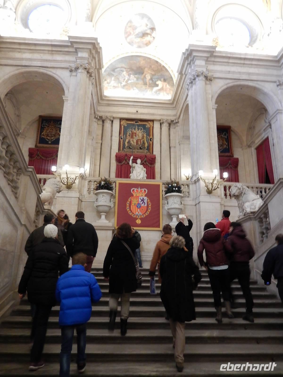 Nach dem herrlichen Frühstück mit Blick auf der Gran Via, begannen wir den Tag mit einem umfassenden Stadtrundgang durch Madrid. Auf diese Weise lernten Sie die bedeutendsten Sehenswürdigkeiten, wie wieder den Plaza de España, den Königspalast oder den Plaza de Mayor kennen. Erstmals sahen wir die Kathedrale La Almudena. Um 10 Uhr besuchten wir den imposanten Königspalast, wo wir die verschiedenen Räume und Thronsaal erstaunen konnten. Gemeinsam mit Reiseleiterin Christine erkundeten wir nun die wunderschöne Altstadt. Wir schlenderten über den weltbekannten Platz Puerta de Sol und wir besuchten auch den San Miguel Markt. Unseren Stadtrundgang beendeten wir auf dem Platz Santa Ana, wo viele noch auf den verschiedenen Terrassen saßen, um die letzten Sonnenstrahlungen des Jahres zu genießen. Man musste Geduld haben, um etwas zu Essen zu bekommen, auch die Kellner heute nicht mehr arbeiten wollten.