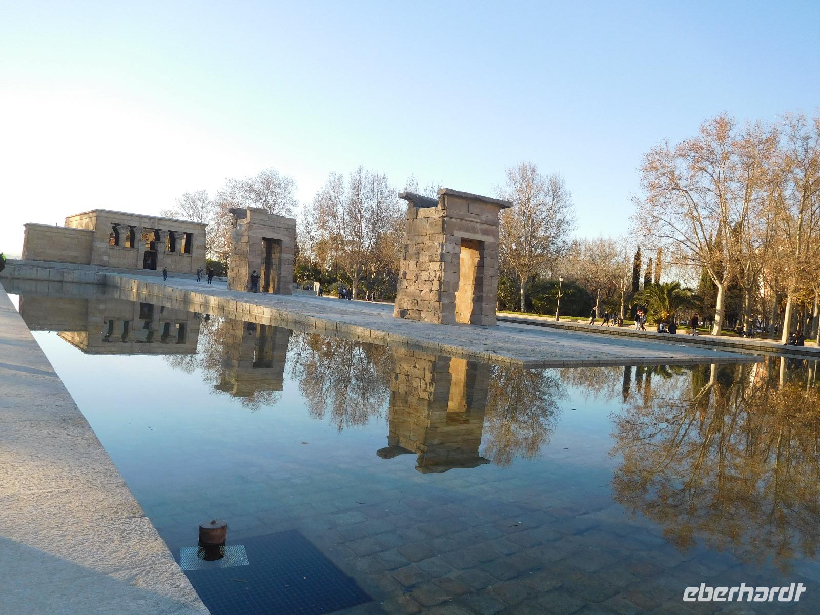 Der erste kleine Spaziergang führte vorbei am Plaza de Espana durch den überaus verlockenden Kunsthandwerkermarkt in den Parque de la Montana - den Park des Bergs. Hier hat man nicht nur eine fantastische Aussicht über Madrid. Nein, viel beeindruckender ist dieser Berg, steht doch tatsächlich ein ägyptischer Tempel! Der Templo de Debod stand ursprünglich dort, wo sich heute in Ägypten der Assuan-Staudamm befindet und wurde 1970 nach Spanien geschafft und hier aufgebaut. Es war ein Dankeschön für die Rettung von Abu Simbel, den Felsentempeln am Nassersee.