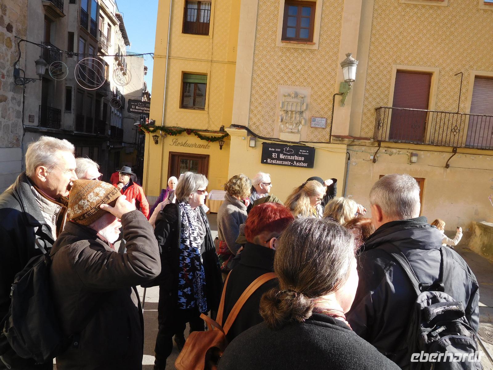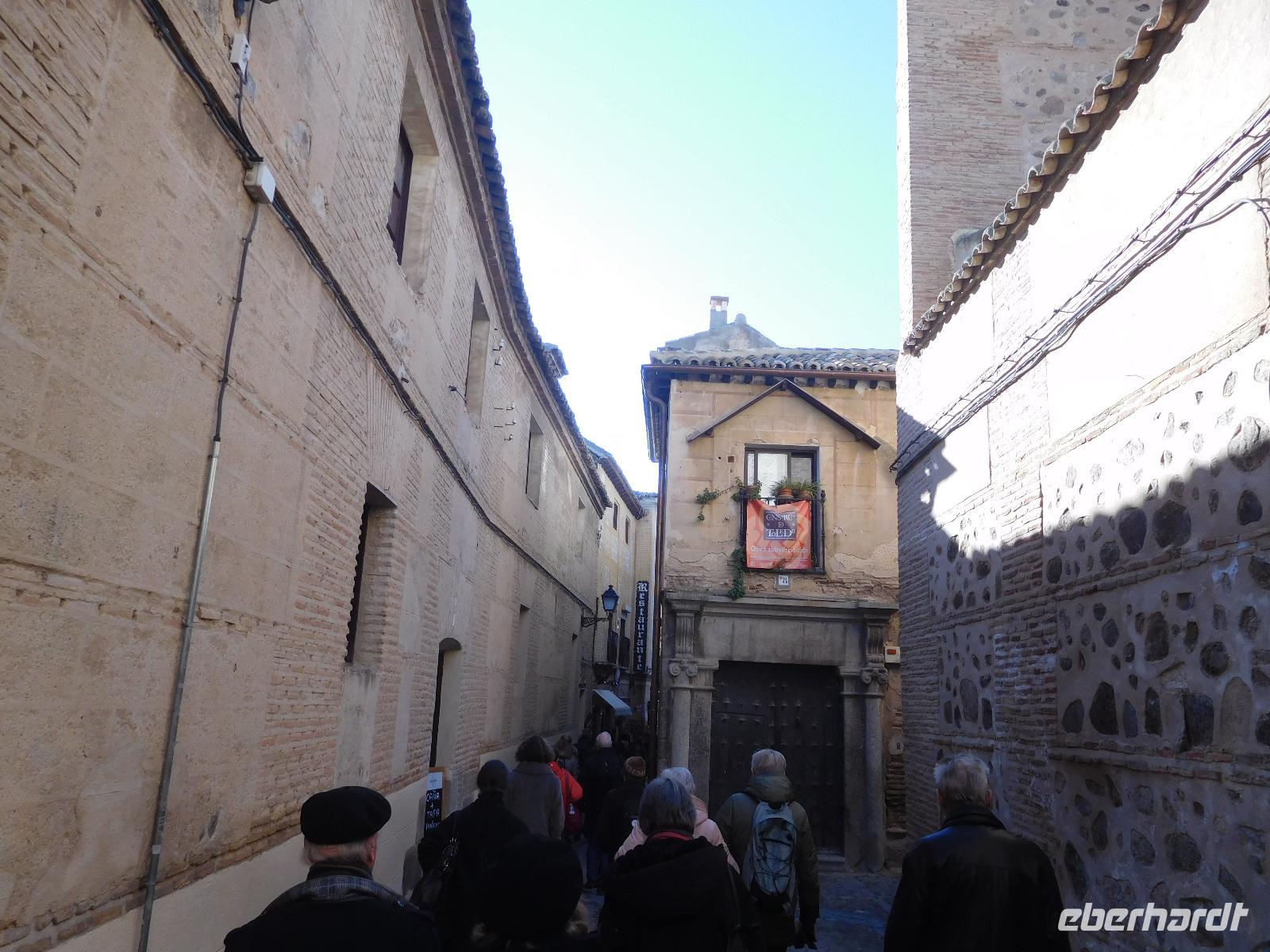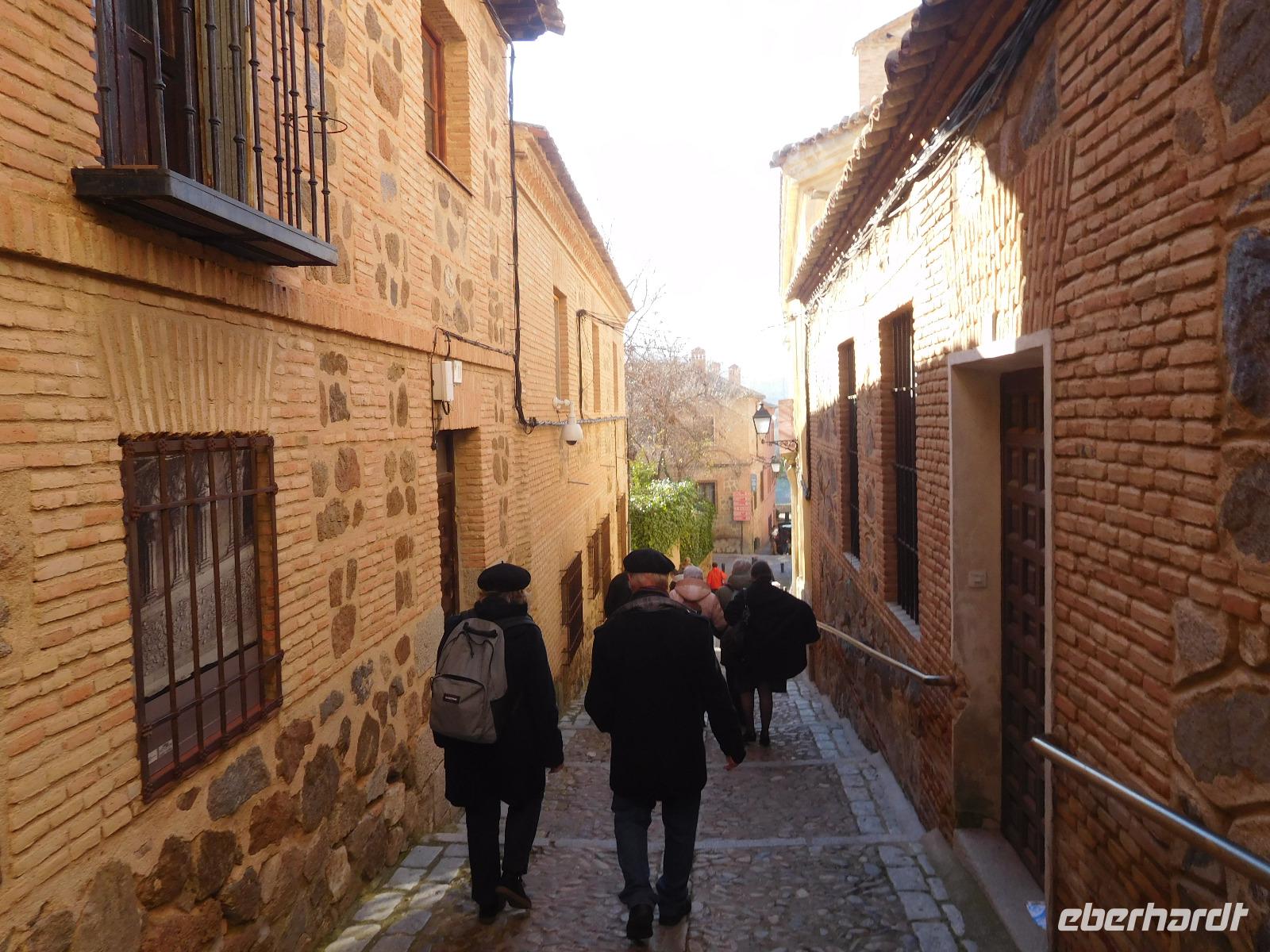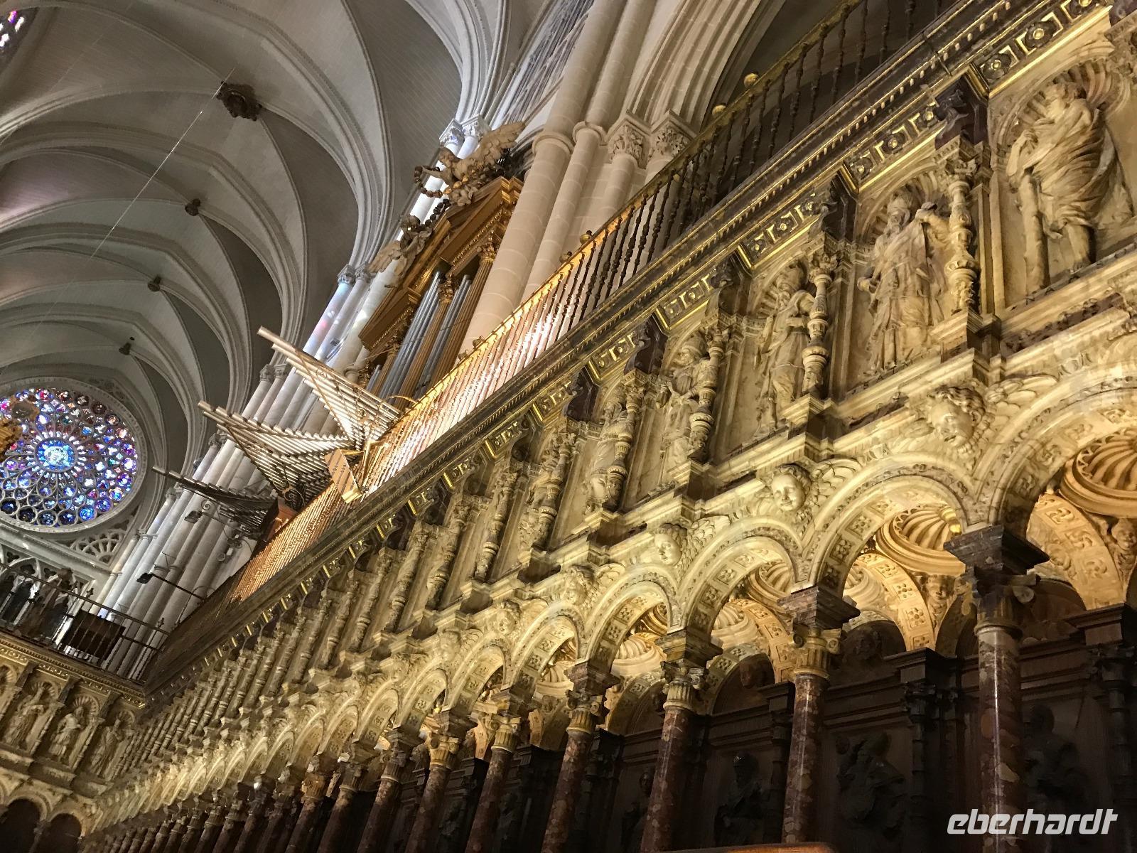 Seitdem die Altstadt von Toledo UNESCO Weltkulturerbe ist, dürfen Reisebusse nicht mehr hinein fahren, was ein schöneres Stadtbild auf unseren Fotos versprach, aber auch einen mühsamen Aufstieg bedeuten konnte. Doch weit gefehlt: Christine führte uns zu Rolltreppen, die die ebenso einfallsreichen wie touristenfreundlichen Spanier gebaut haben, um Besucher der Stadt bequem hinauf in die Altstadt zu befördern. Oben angekommen, lernten wir den Marktplatz und die Kathedrale kennen, in der der Altar von dem Selbstbewusstsein eines Bischofs und der Chor vom Streit zweier Künstler zeugte. Hier, in dieser prunkvollen Kirche, zeigte sich die Kunstfertigkeit des Barock an jeder Ecke in seiner ganzen Pracht. Christine führte uns auch zu den Gemälden von Michelangelo Merisi da Caravaggio und El Greco - und zur goldenen Monstranz, auf der sich über 260 fein ausgearbeitete Figuren befinden!