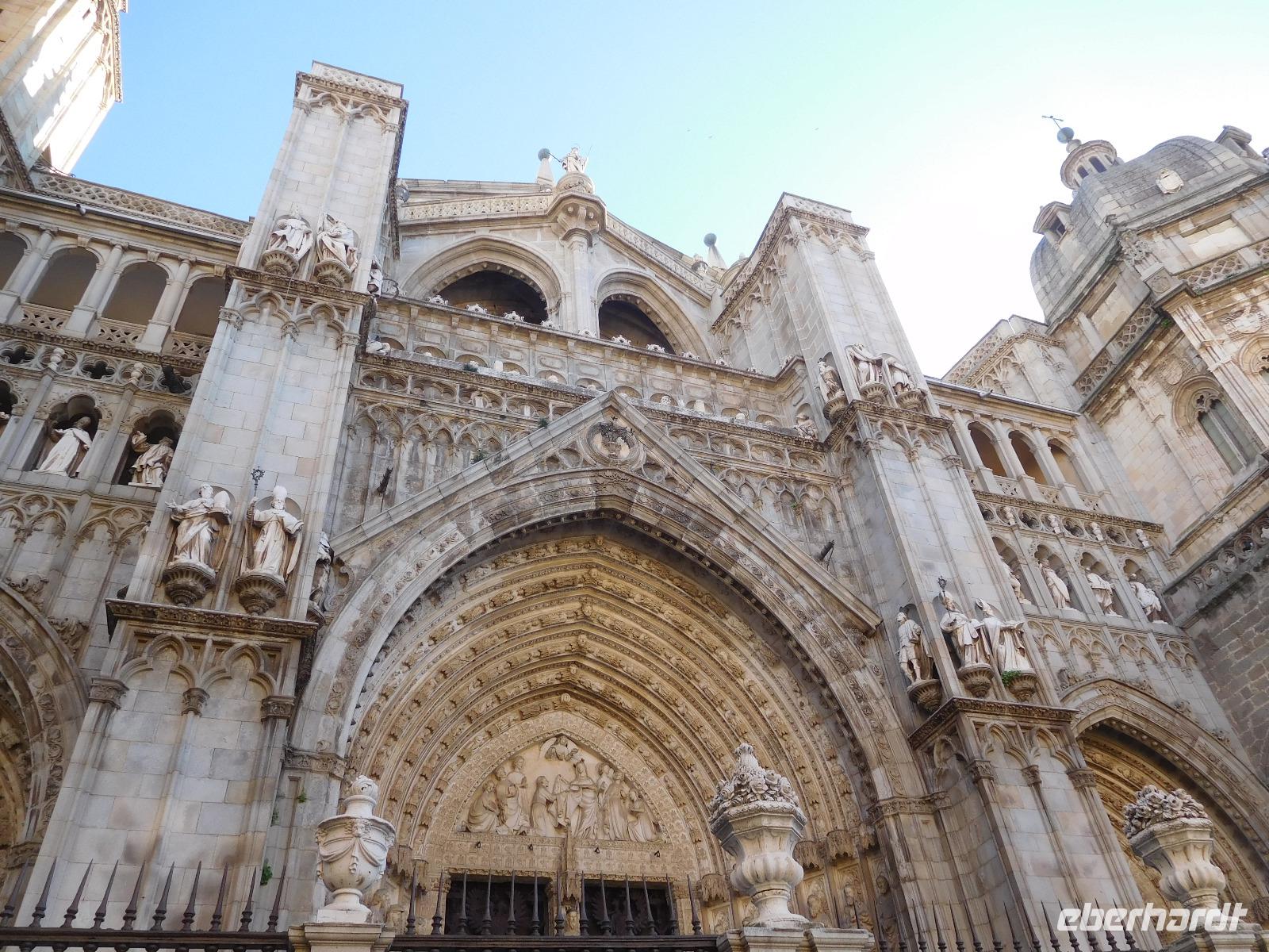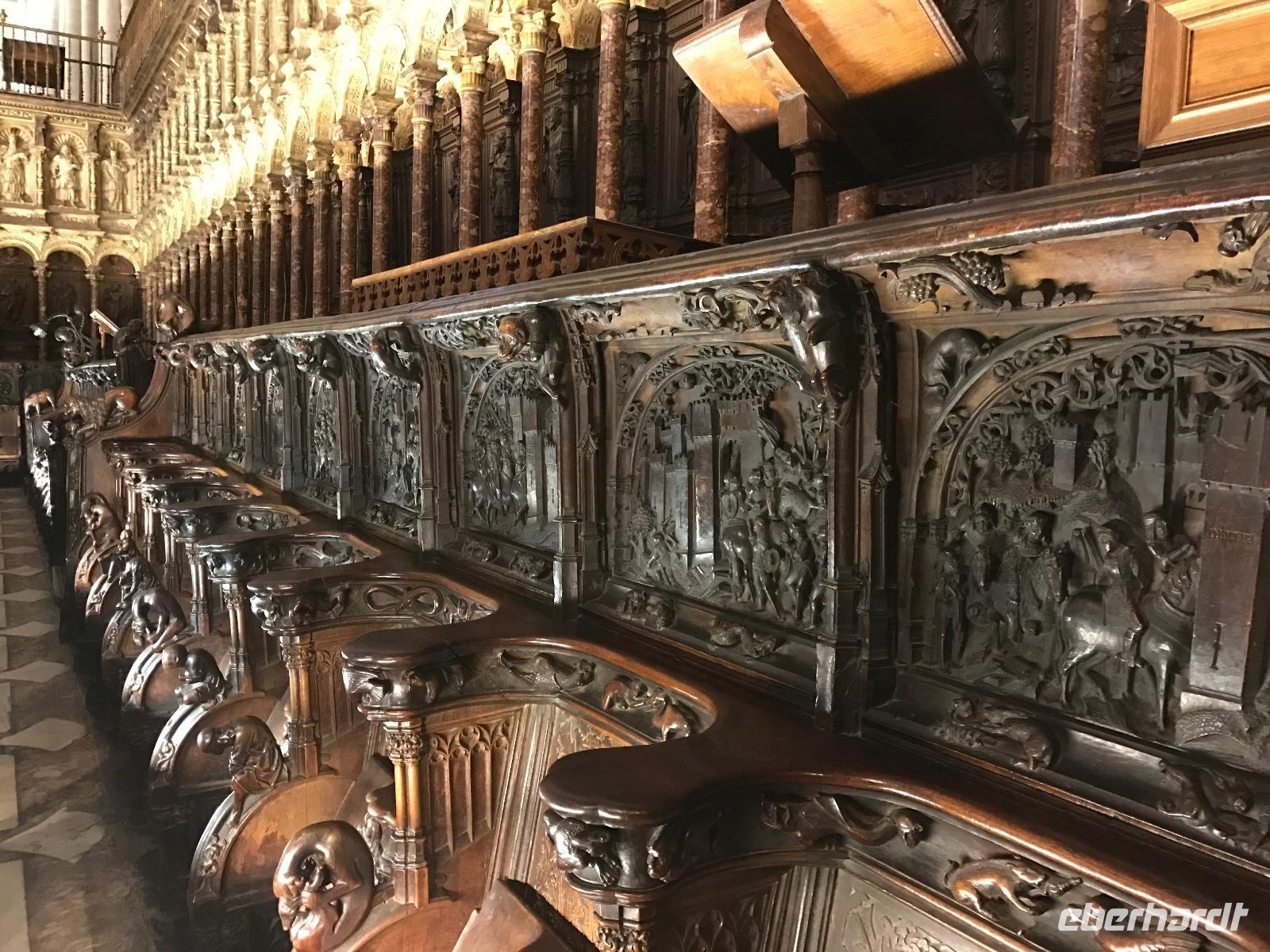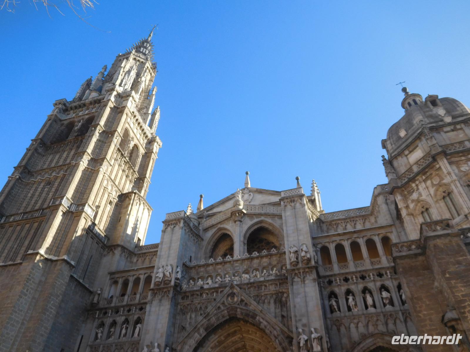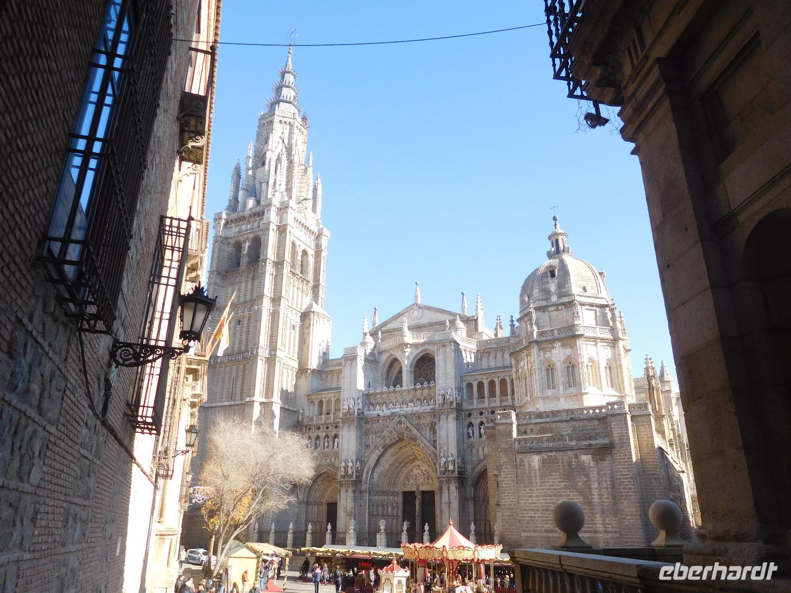 Seitdem die Altstadt von Toledo UNESCO Weltkulturerbe ist, dürfen Reisebusse nicht mehr hinein fahren, was ein schöneres Stadtbild auf unseren Fotos versprach, aber auch einen mühsamen Aufstieg bedeuten konnte. Doch weit gefehlt: Christine führte uns zu Rolltreppen, die die ebenso einfallsreichen wie touristenfreundlichen Spanier gebaut haben, um Besucher der Stadt bequem hinauf in die Altstadt zu befördern. Oben angekommen, lernten wir den Marktplatz und die Kathedrale kennen, in der der Altar von dem Selbstbewusstsein eines Bischofs und der Chor vom Streit zweier Künstler zeugte. Hier, in dieser prunkvollen Kirche, zeigte sich die Kunstfertigkeit des Barock an jeder Ecke in seiner ganzen Pracht. Christine führte uns auch zu den Gemälden von Michelangelo Merisi da Caravaggio und El Greco - und zur goldenen Monstranz, auf der sich über 260 fein ausgearbeitete Figuren befinden!