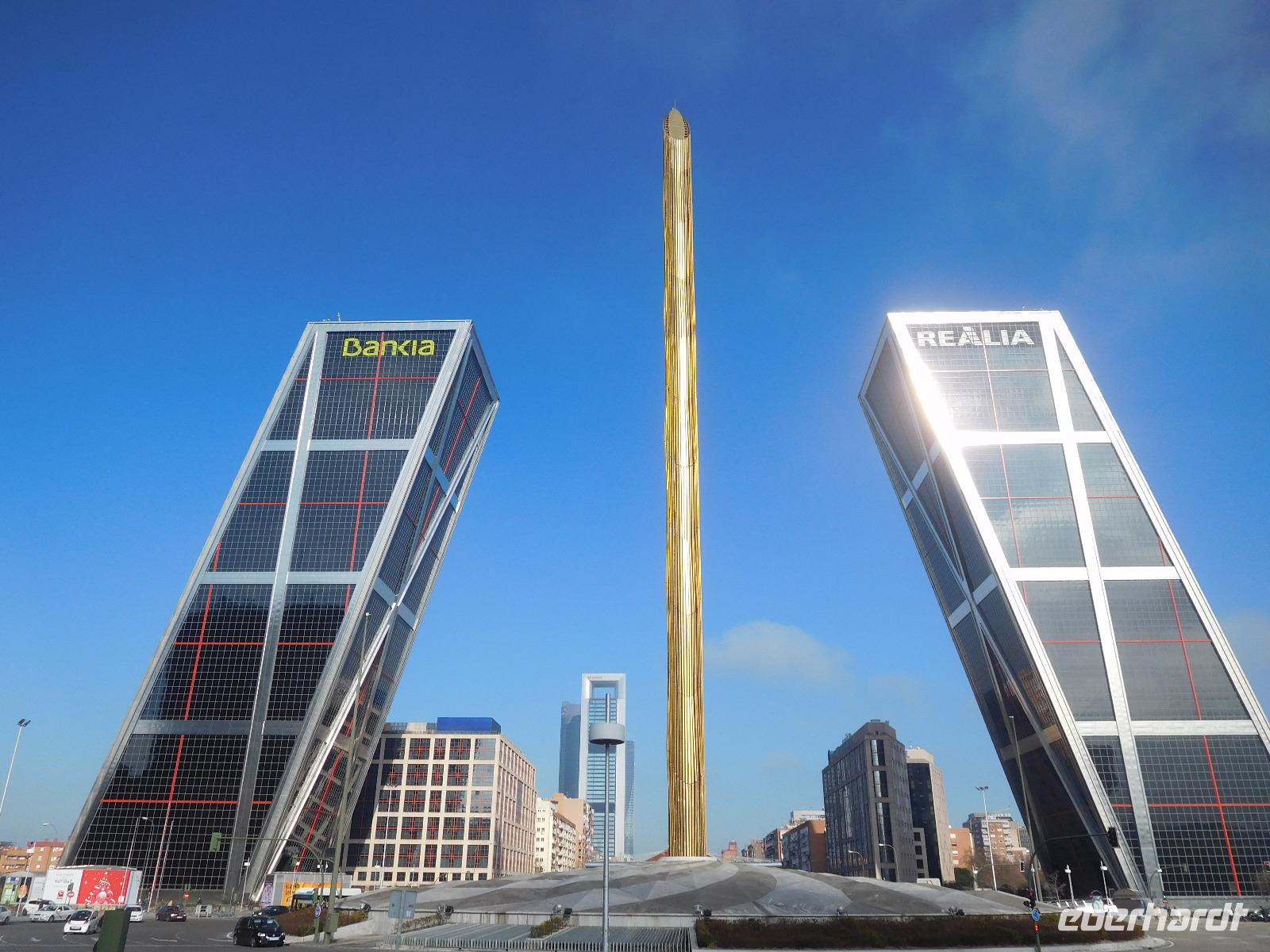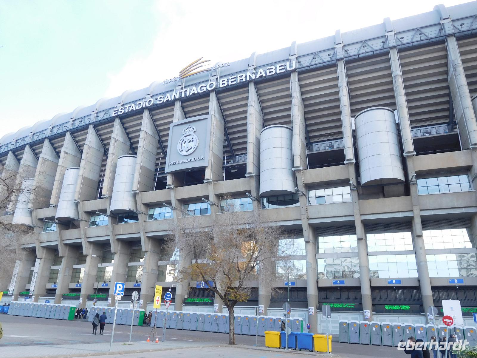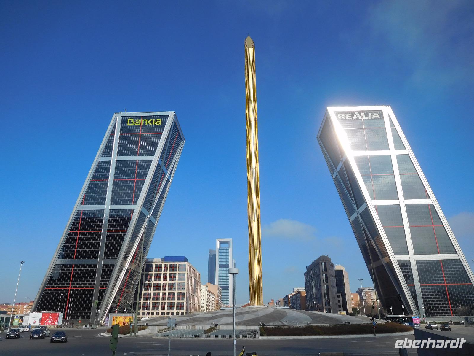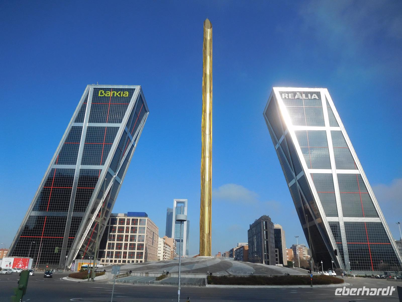 Nach so vielem Spazierengehen war es nun Zeit für eine wärmende Panorama-Busfahrt durch Madrid zu weiter entfernten Sehenswürdigkeiten, wie dem Bernabeu-Stadion des Fußball-Vereins Real Madrid, den markanten schrägen Bankia-Hochhäusern an der sogenannten Puerta de Europa oder den neu entstehenden fünf Hochhäusern.