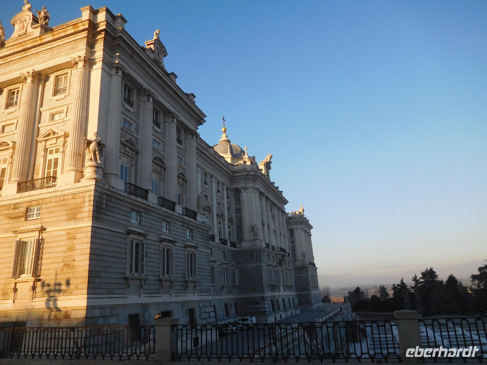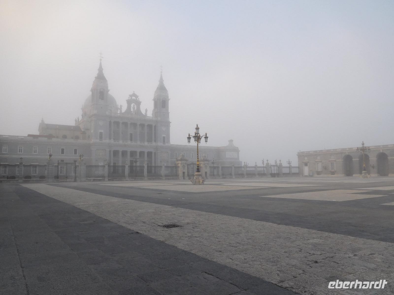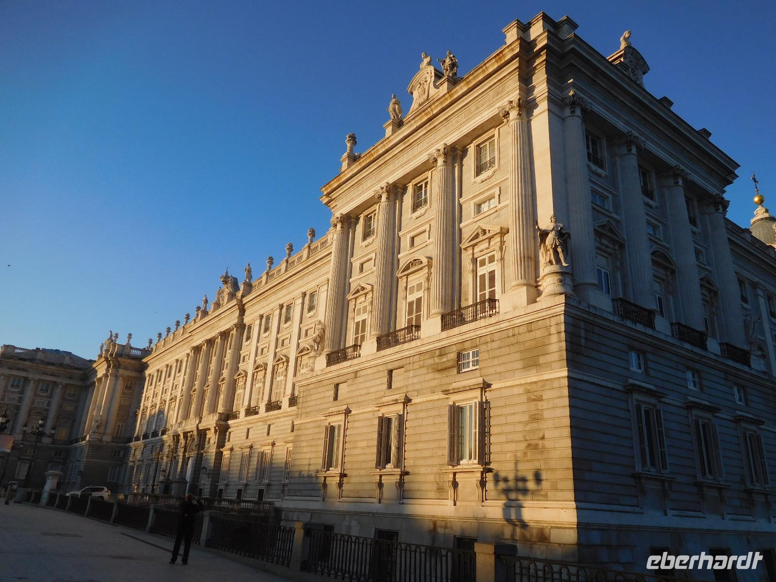 Nicht in die Umgebung, sondern direkt ins Herz der spanischen Hauptstadt Madrid führte uns heute Reiseleiterin Christine. Nach einem kurzen Stopp am Plaza de Espana und den mittlerweile historischen Hochhäusern am Platz führte sie uns am runden Senatsgebäude vorbei direkt zum Königspalast. Wir waren hier so zeitig, dass wir den großzügigen Vorplatz nur mit dem dichten Morgennebel teilen mussten. Niemand sonst war zu sehen. Im Königspalast selbst sahen wir die kunstfertige Pracht von Jahrhunderten, die jeden Raum mit Liebe zum kleinsten Detail und jeden Raum auch völlig anders ausfüllte. Wir staunten in den Räumen - und auch, als wir den Palast wieder verließen, hatten sich hier jetzt große Menschenmengen eingefunden, um den Königspalast zu sehen.