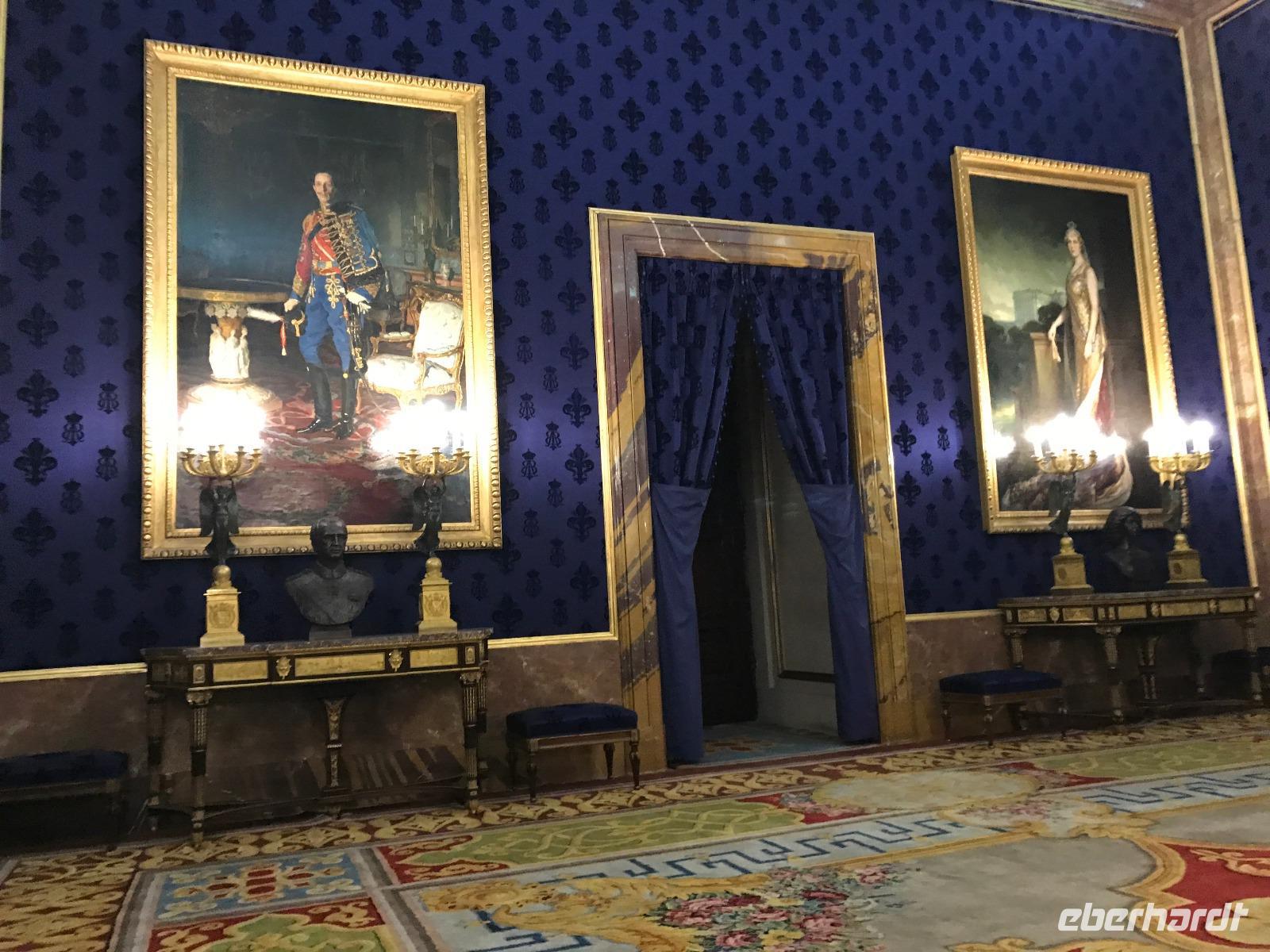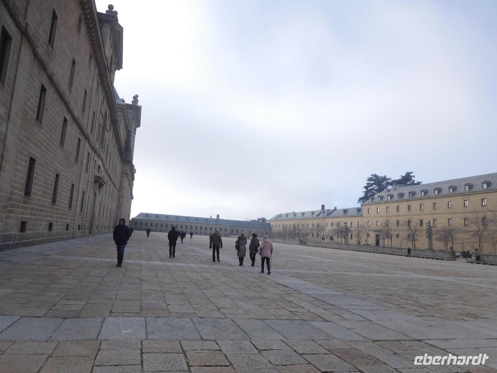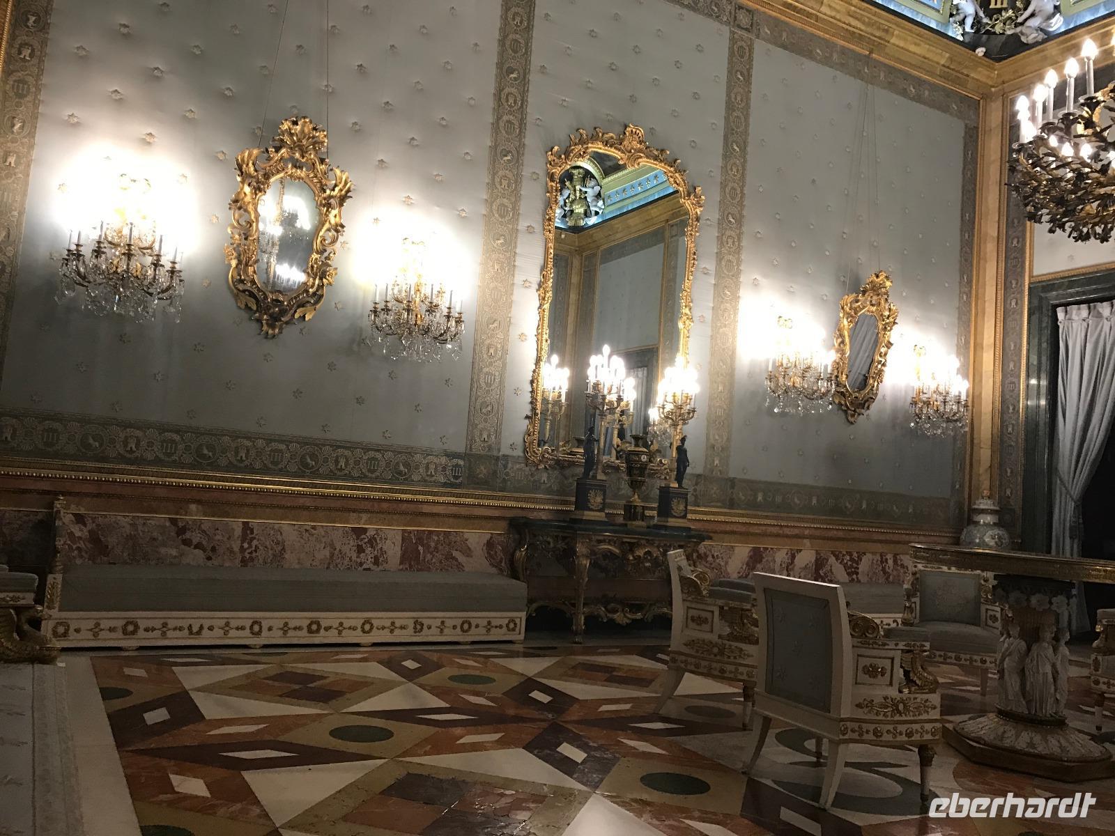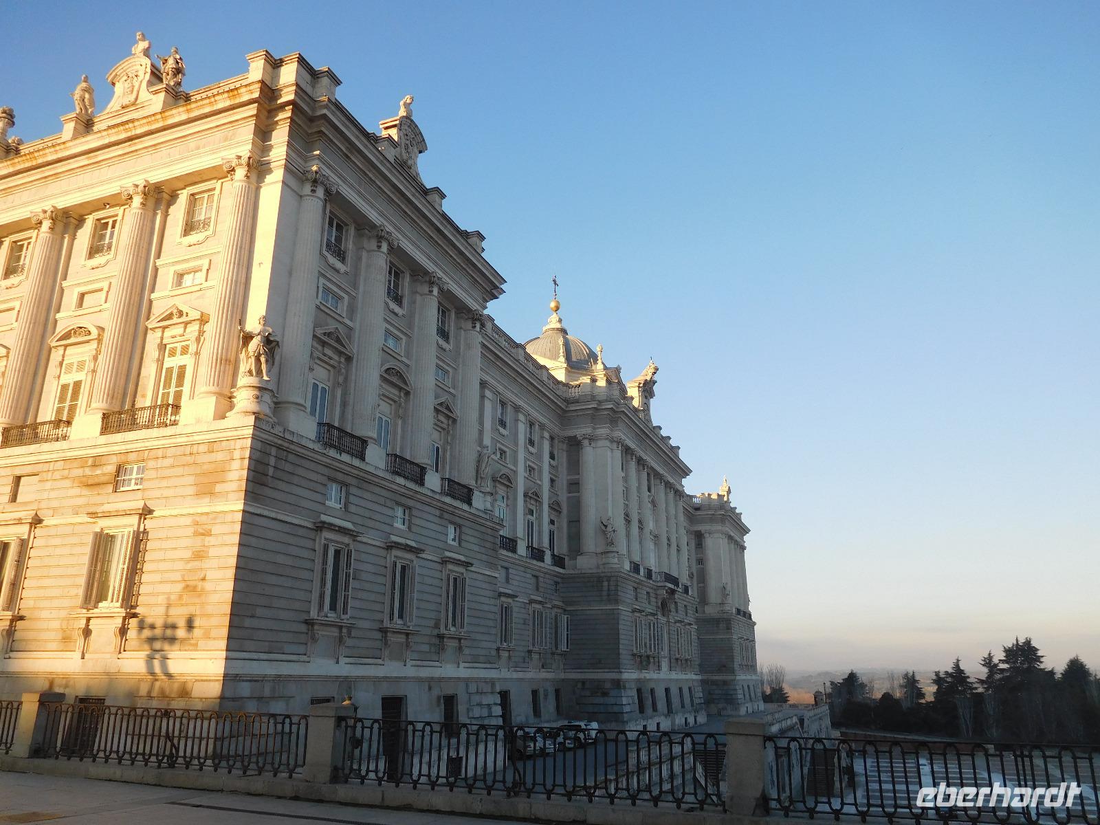 Nicht in die Umgebung, sondern direkt ins Herz der spanischen Hauptstadt Madrid führte uns heute Reiseleiterin Christine. Nach einem kurzen Stopp am Plaza de Espana und den mittlerweile historischen Hochhäusern am Platz führte sie uns am runden Senatsgebäude vorbei direkt zum Königspalast. Wir waren hier so zeitig, dass wir den großzügigen Vorplatz nur mit dem dichten Morgennebel teilen mussten. Niemand sonst war zu sehen. Im Königspalast selbst sahen wir die kunstfertige Pracht von Jahrhunderten, die jeden Raum mit Liebe zum kleinsten Detail und jeden Raum auch völlig anders ausfüllte. Wir staunten in den Räumen - und auch, als wir den Palast wieder verließen, hatten sich hier jetzt große Menschenmengen eingefunden, um den Königspalast zu sehen.
