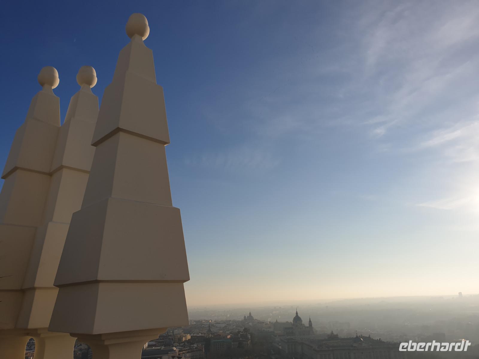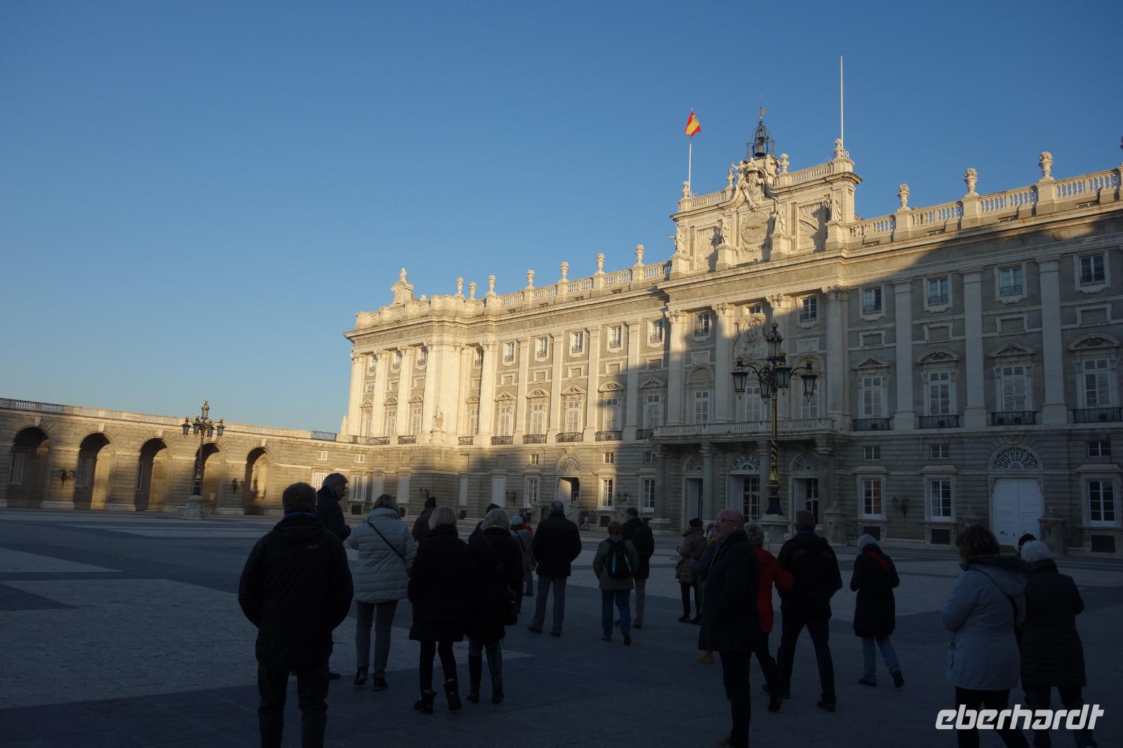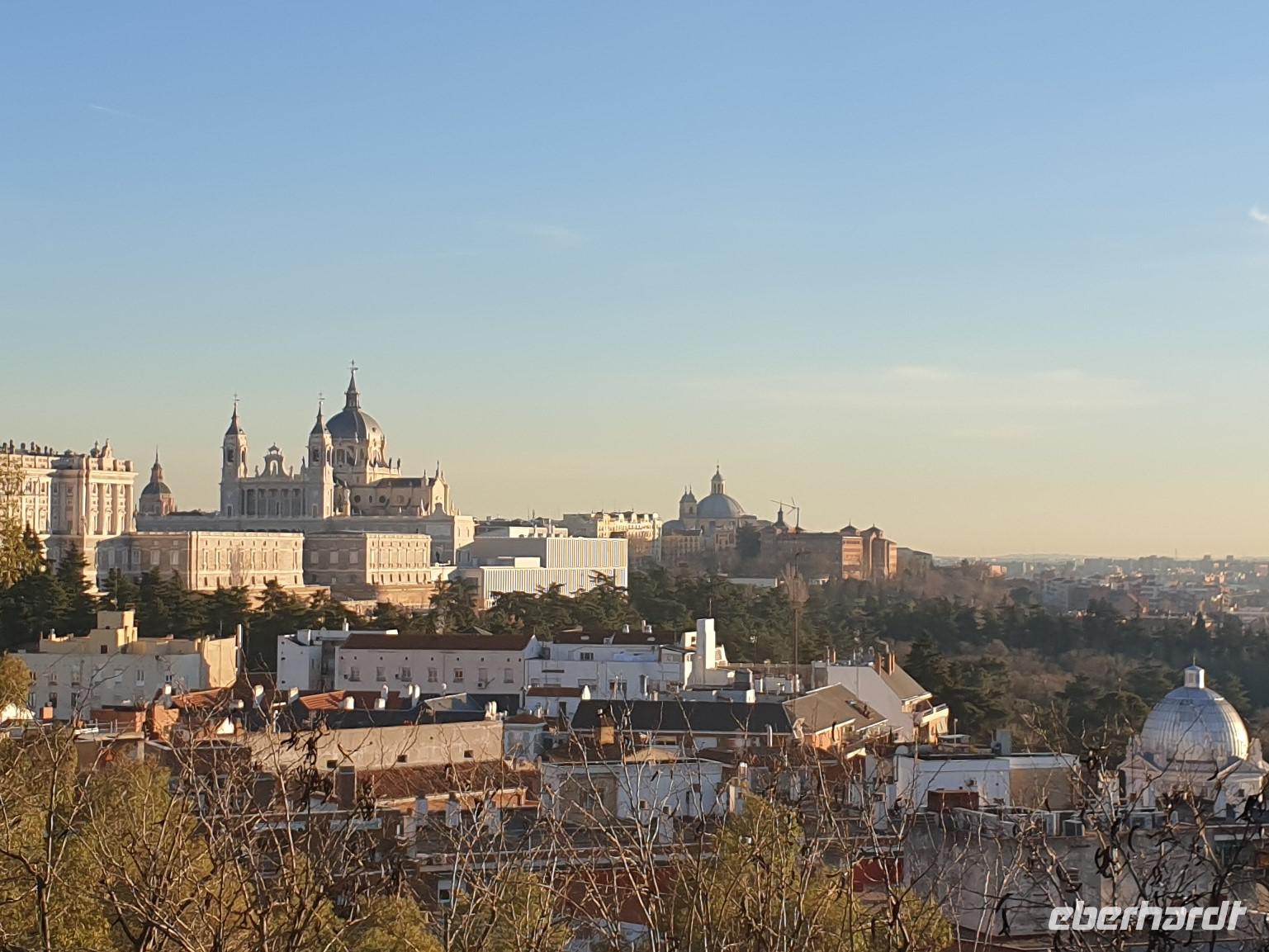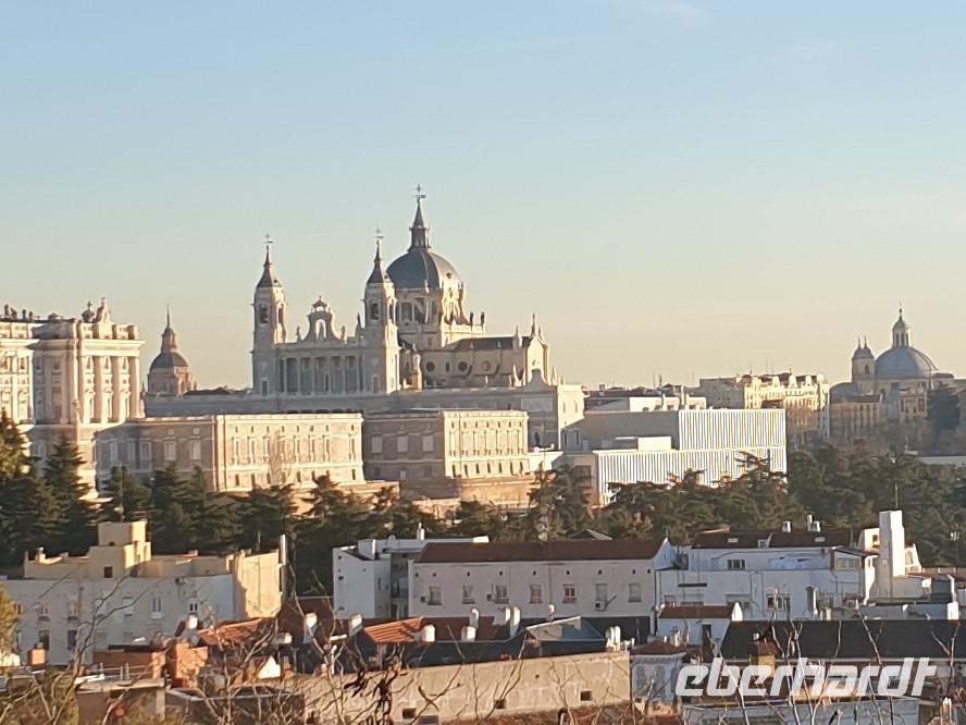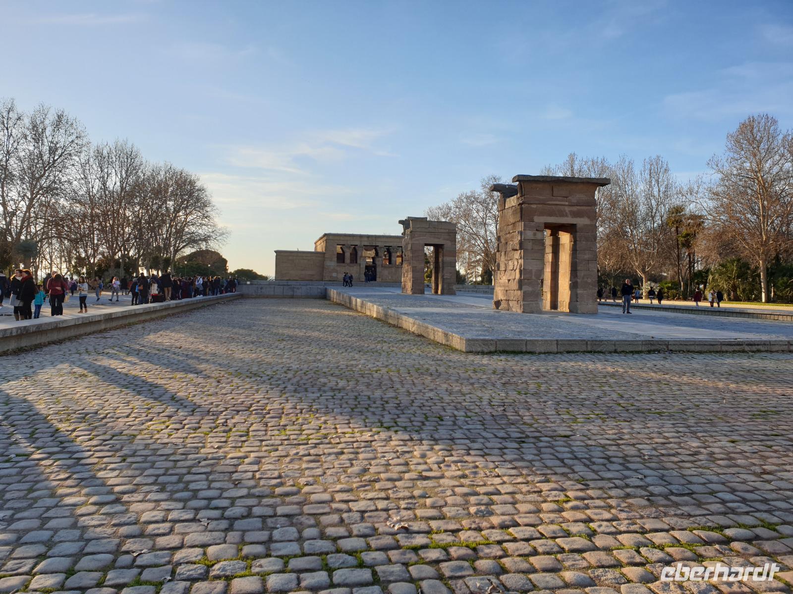 Anschließend gingen wir zu der berühmte „Templo de Debod", dem kleinen altägyptischen Tempel und ältesten Bauwerk Madrids. Es war ein Geschenk der ägyptischen Regierung an Spanien zum Dank für die Hilfe der spanischen Archäologen bei der Rettung Abu Simbels während des Baus des Asusanstaudamms vor mehr als 50 Jahren. Von hier hat man einen der besten Ausblicke von Madrid bis zu den Gebirgsketten voller Schnee über den Königspalast und die Casa de Campo. Wir wollten heute gar nicht viel mehr sehen, da wir noch einen richtigen Stadtrundgang am Mittwoch haben würden, aber einen erste Eindruck von meiner Heimat wollte ich meinen Gästen schon heute geben. Wir hatten riesig Glück mit dem Wetter in diesen Tage, da es immer sonnig war. Man darf nicht vergessen, dass sich Madrid in einer Höhe von 665 Metern befindet. Wenn die Sonne scheint, ist es sehr angenehm, aber am Abend und in der Nacht kann richtig frisch und kalt sein.