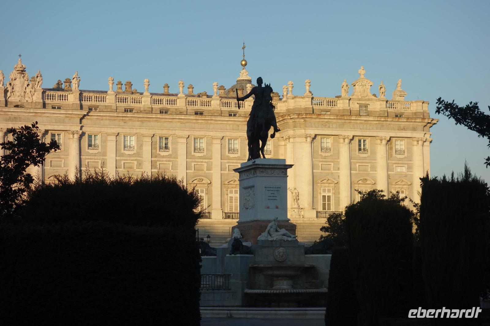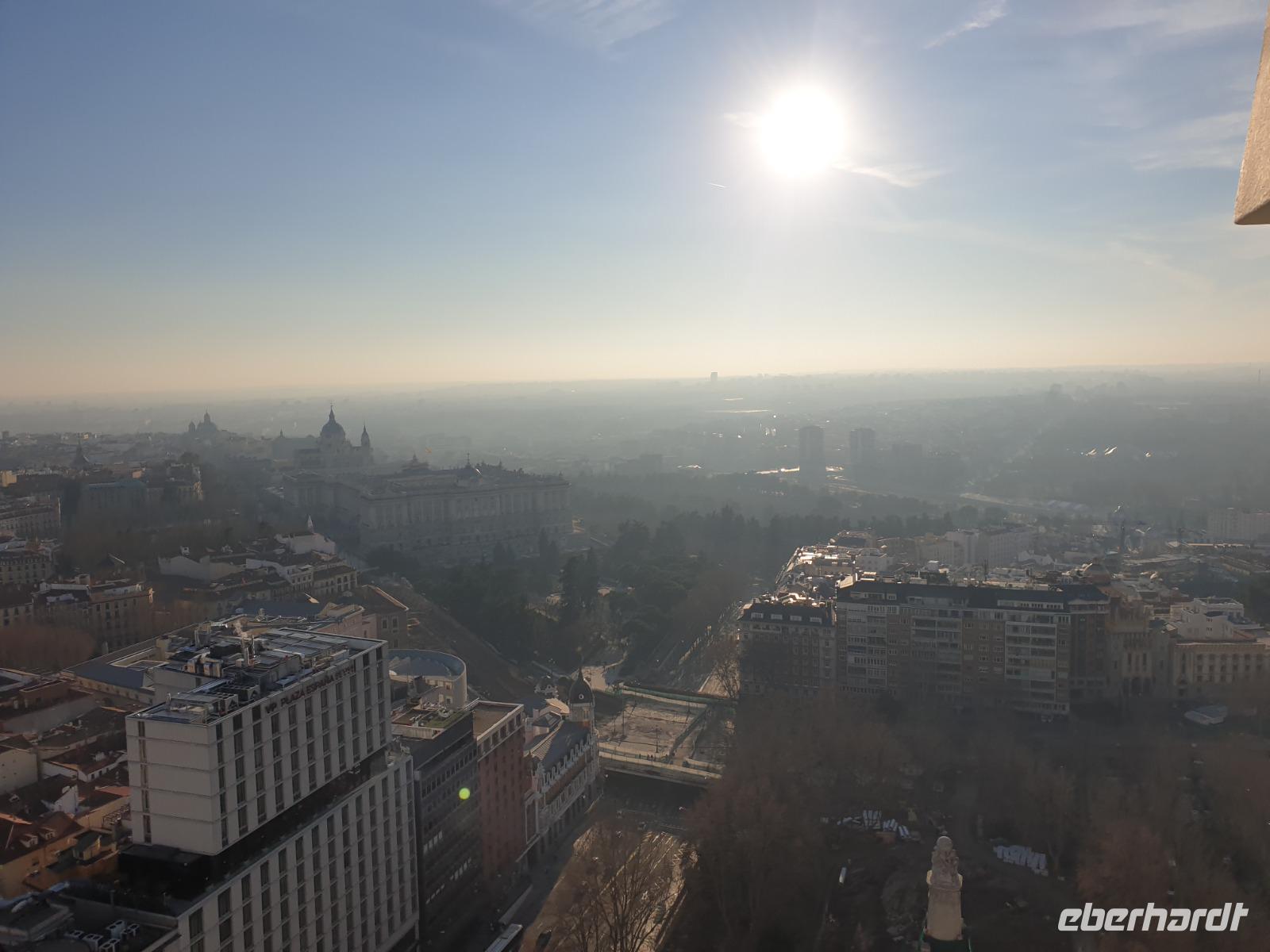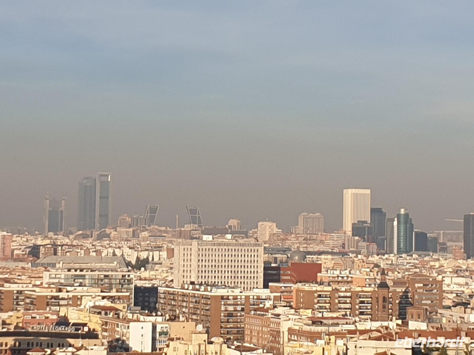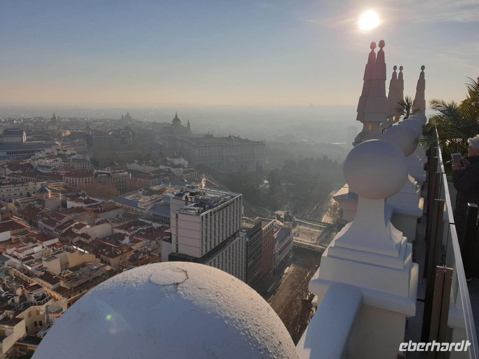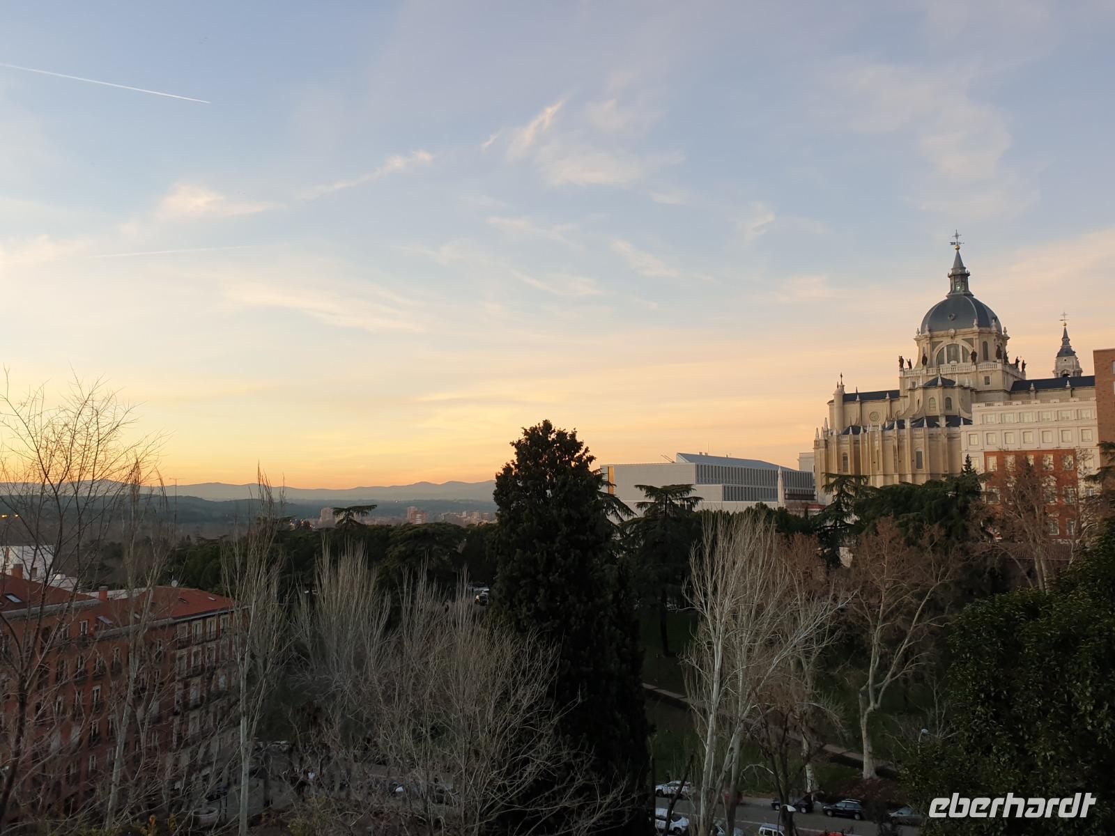 Anschließend gingen wir zu der berühmte „Templo de Debod", dem kleinen altägyptischen Tempel und ältesten Bauwerk Madrids. Es war ein Geschenk der ägyptischen Regierung an Spanien zum Dank für die Hilfe der spanischen Archäologen bei der Rettung Abu Simbels während des Baus des Asusanstaudamms vor mehr als 50 Jahren. Von hier hat man einen der besten Ausblicke von Madrid bis zu den Gebirgsketten voller Schnee über den Königspalast und die Casa de Campo. Wir wollten heute gar nicht viel mehr sehen, da wir noch einen richtigen Stadtrundgang am Mittwoch haben würden, aber einen erste Eindruck von meiner Heimat wollte ich meinen Gästen schon heute geben. Wir hatten riesig Glück mit dem Wetter in diesen Tage, da es immer sonnig war. Man darf nicht vergessen, dass sich Madrid in einer Höhe von 665 Metern befindet. Wenn die Sonne scheint, ist es sehr angenehm, aber am Abend und in der Nacht kann richtig frisch und kalt sein.
