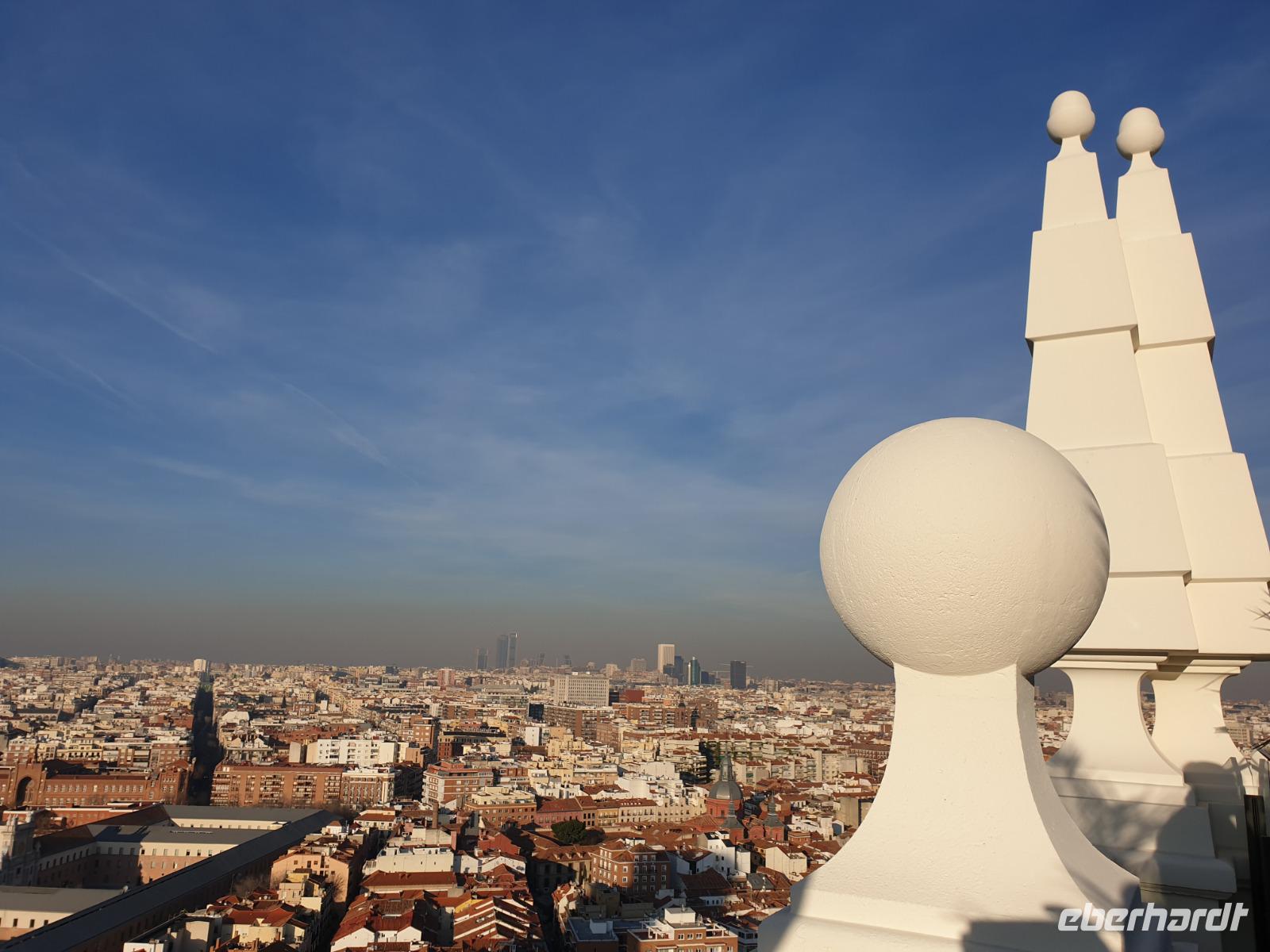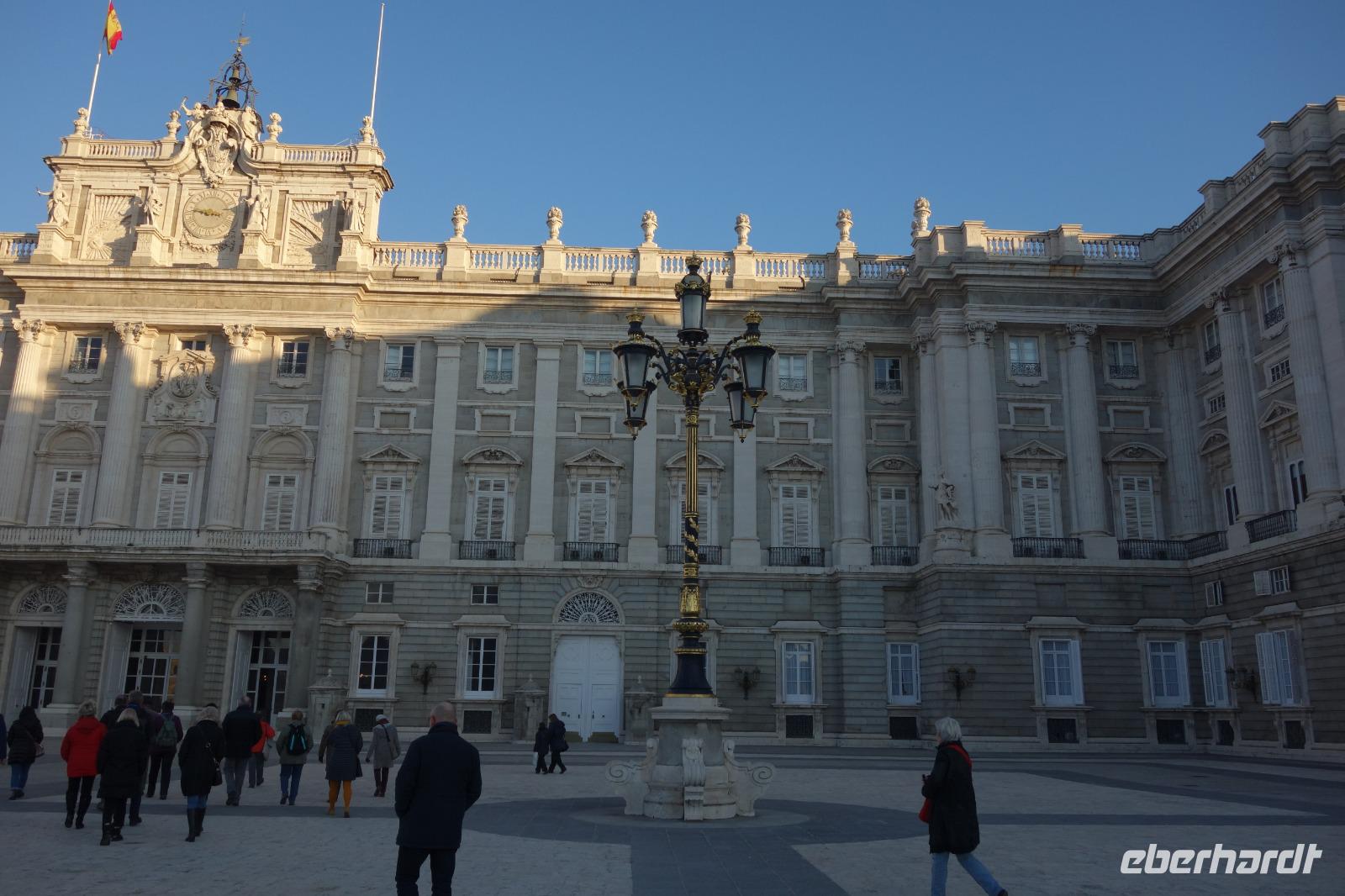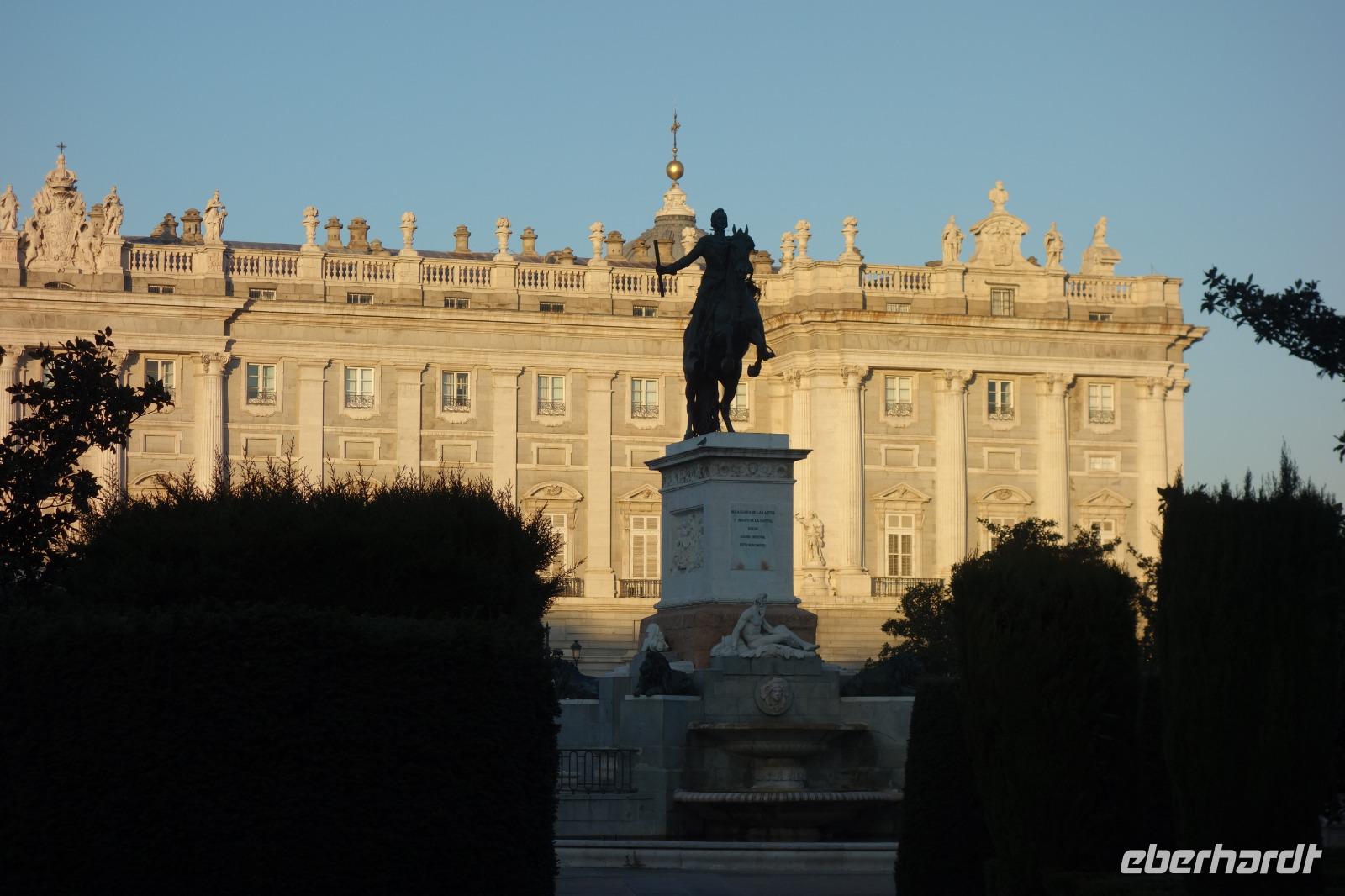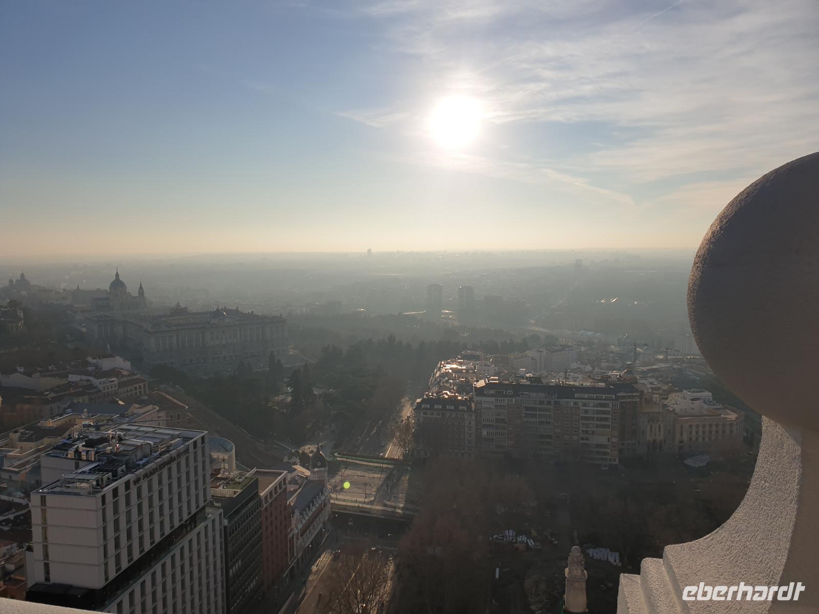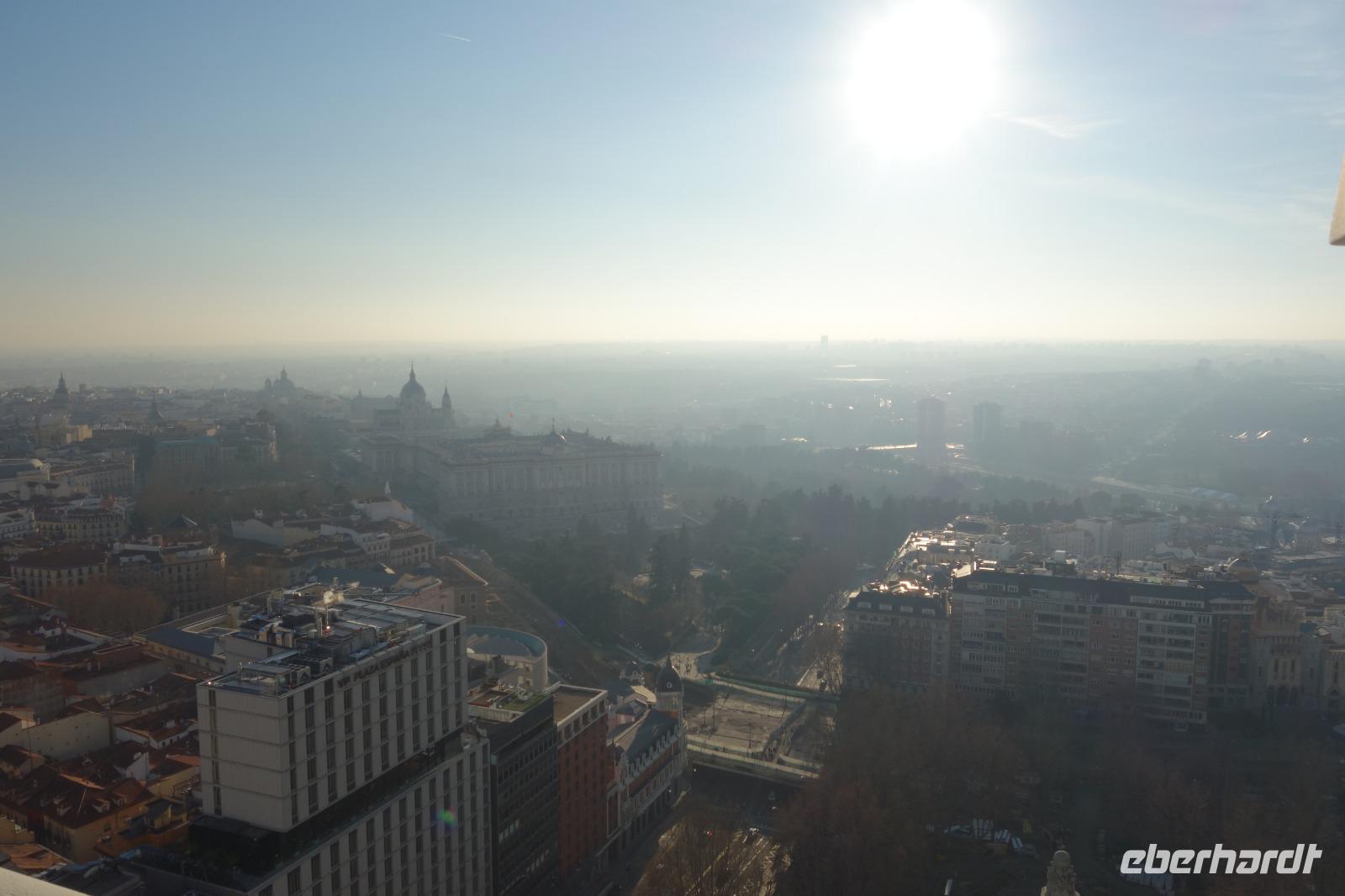 Anschließend gingen wir zu der berühmte „Templo de Debod", dem kleinen altägyptischen Tempel und ältesten Bauwerk Madrids. Es war ein Geschenk der ägyptischen Regierung an Spanien zum Dank für die Hilfe der spanischen Archäologen bei der Rettung Abu Simbels während des Baus des Asusanstaudamms vor mehr als 50 Jahren. Von hier hat man einen der besten Ausblicke von Madrid bis zu den Gebirgsketten voller Schnee über den Königspalast und die Casa de Campo. Wir wollten heute gar nicht viel mehr sehen, da wir noch einen richtigen Stadtrundgang am Mittwoch haben würden, aber einen erste Eindruck von meiner Heimat wollte ich meinen Gästen schon heute geben. Wir hatten riesig Glück mit dem Wetter in diesen Tage, da es immer sonnig war. Man darf nicht vergessen, dass sich Madrid in einer Höhe von 665 Metern befindet. Wenn die Sonne scheint, ist es sehr angenehm, aber am Abend und in der Nacht kann richtig frisch und kalt sein.