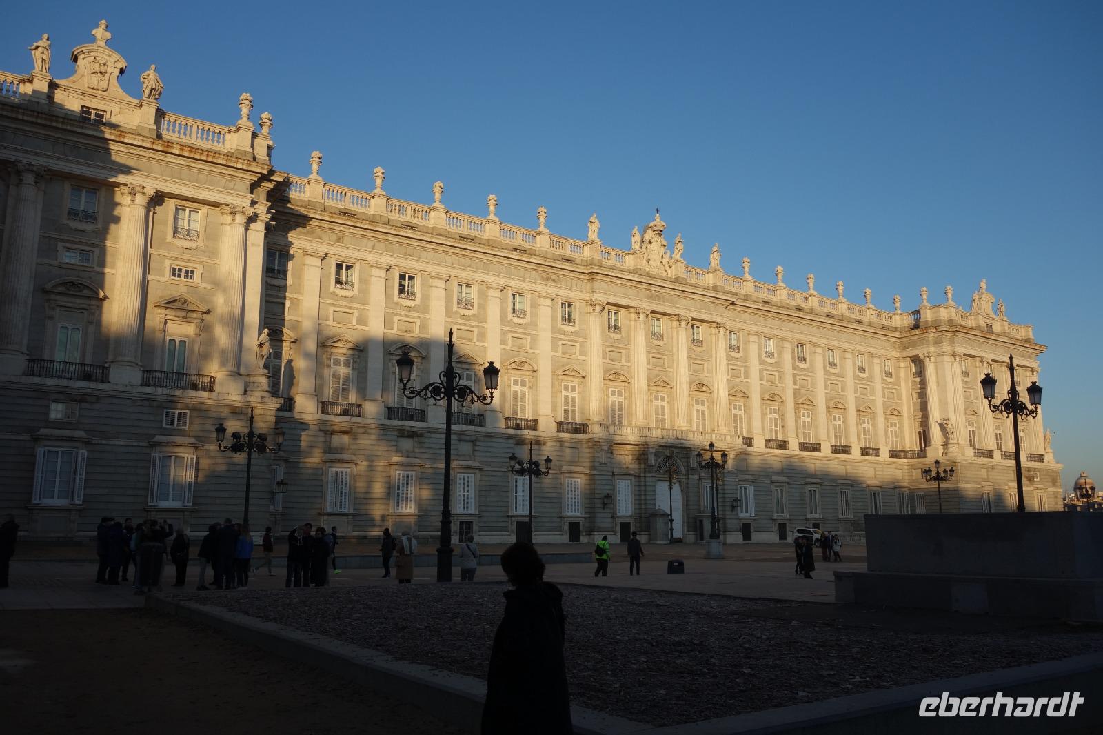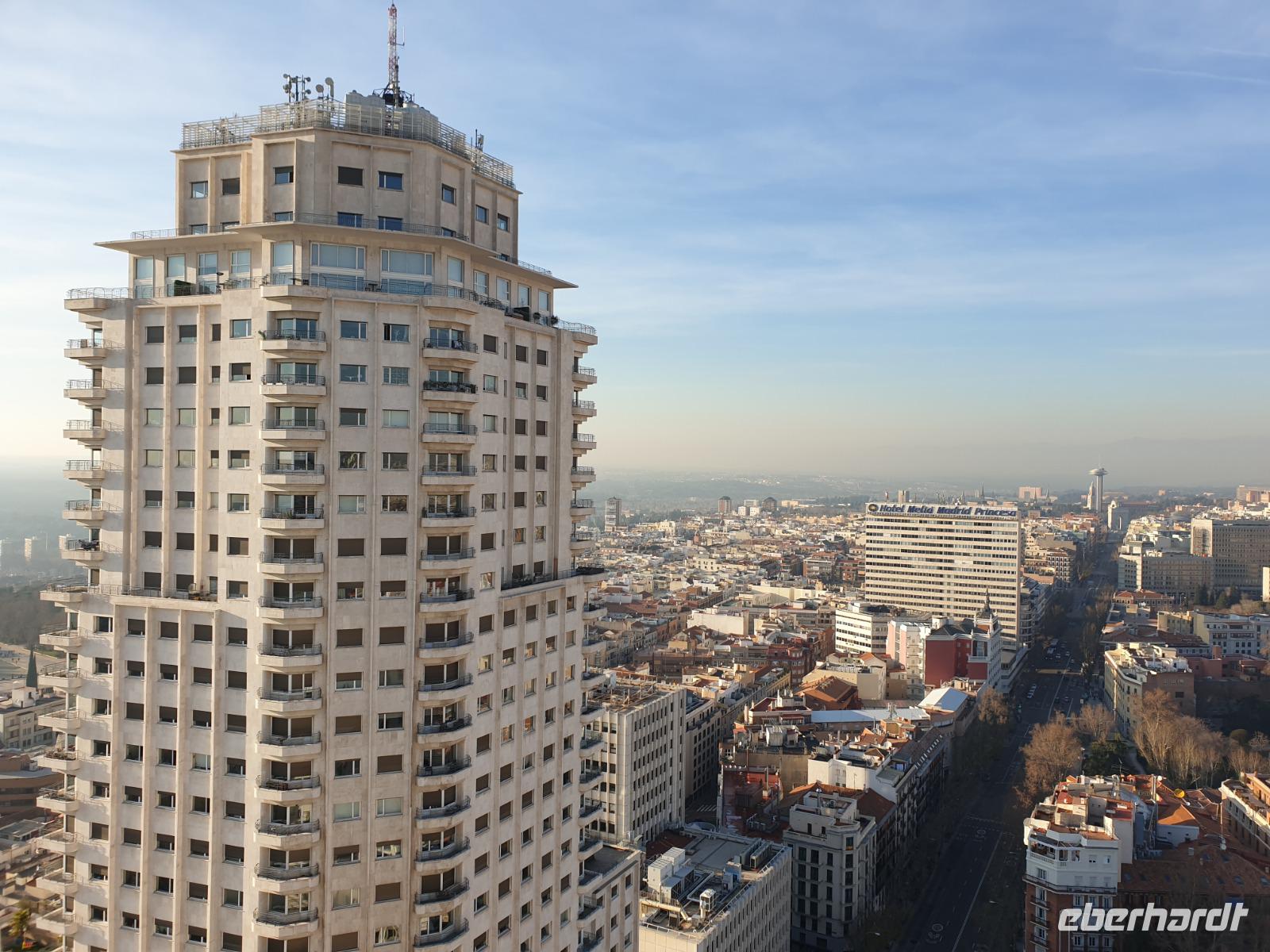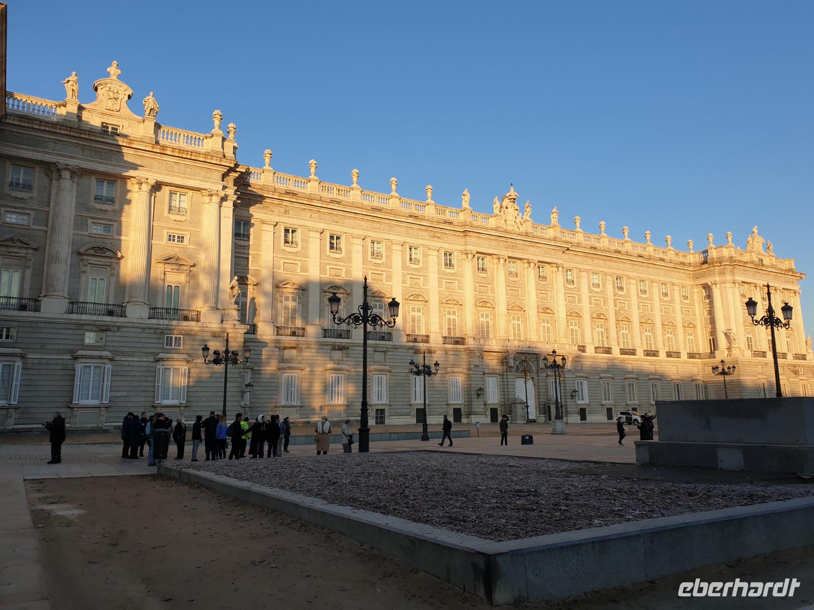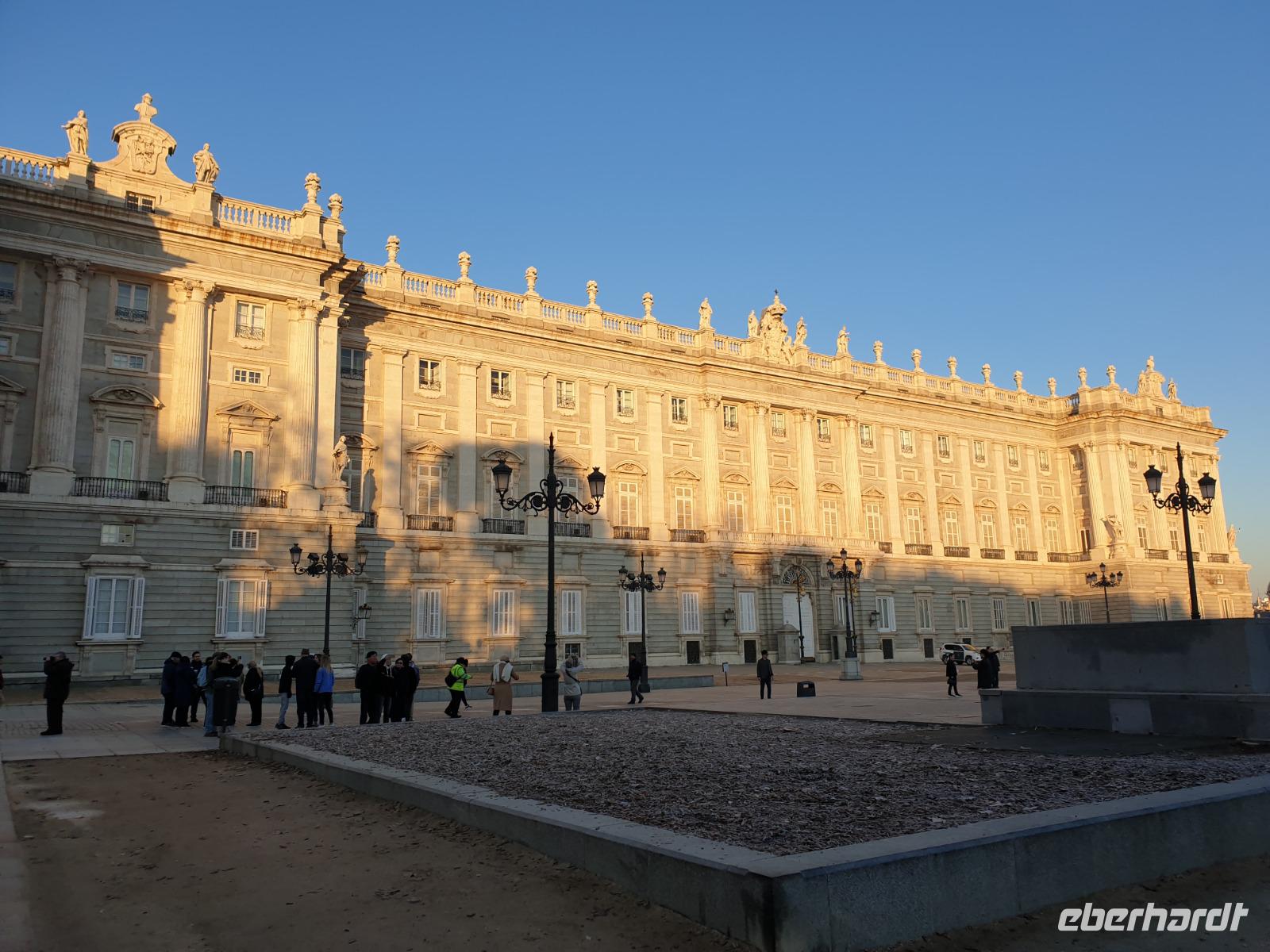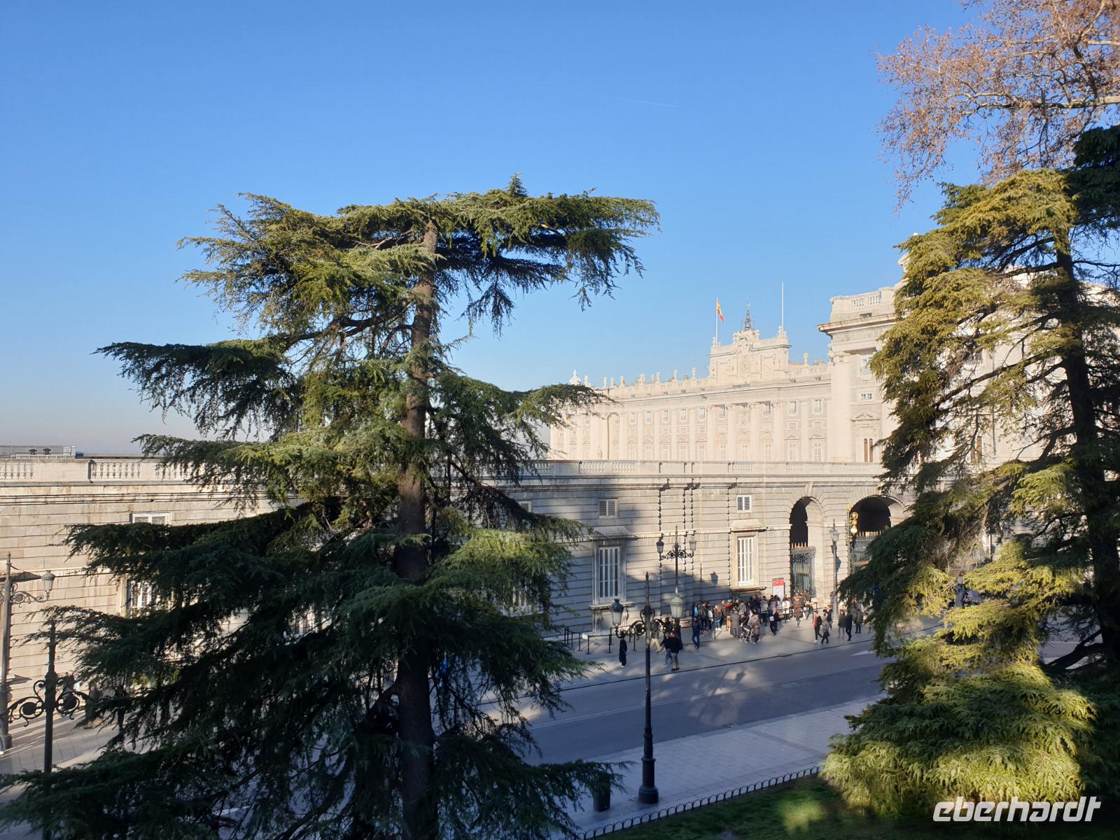 Anschließend gingen wir zu der berühmte „Templo de Debod", dem kleinen altägyptischen Tempel und ältesten Bauwerk Madrids. Es war ein Geschenk der ägyptischen Regierung an Spanien zum Dank für die Hilfe der spanischen Archäologen bei der Rettung Abu Simbels während des Baus des Asusanstaudamms vor mehr als 50 Jahren. Von hier hat man einen der besten Ausblicke von Madrid bis zu den Gebirgsketten voller Schnee über den Königspalast und die Casa de Campo. Wir wollten heute gar nicht viel mehr sehen, da wir noch einen richtigen Stadtrundgang am Mittwoch haben würden, aber einen erste Eindruck von meiner Heimat wollte ich meinen Gästen schon heute geben. Wir hatten riesig Glück mit dem Wetter in diesen Tage, da es immer sonnig war. Man darf nicht vergessen, dass sich Madrid in einer Höhe von 665 Metern befindet. Wenn die Sonne scheint, ist es sehr angenehm, aber am Abend und in der Nacht kann richtig frisch und kalt sein.