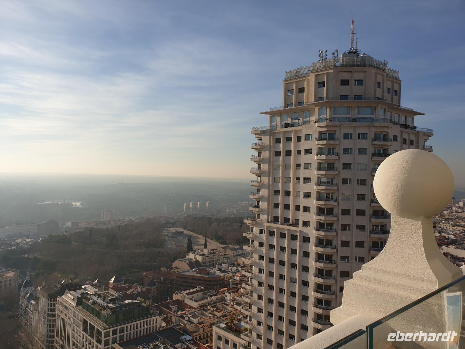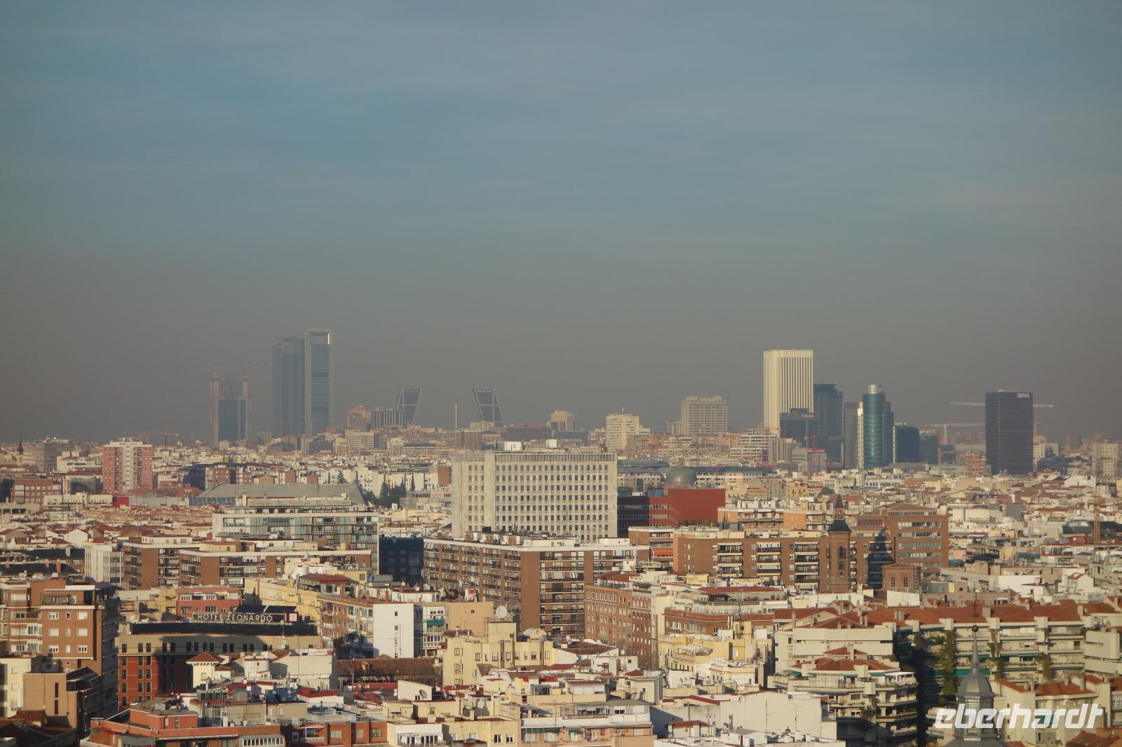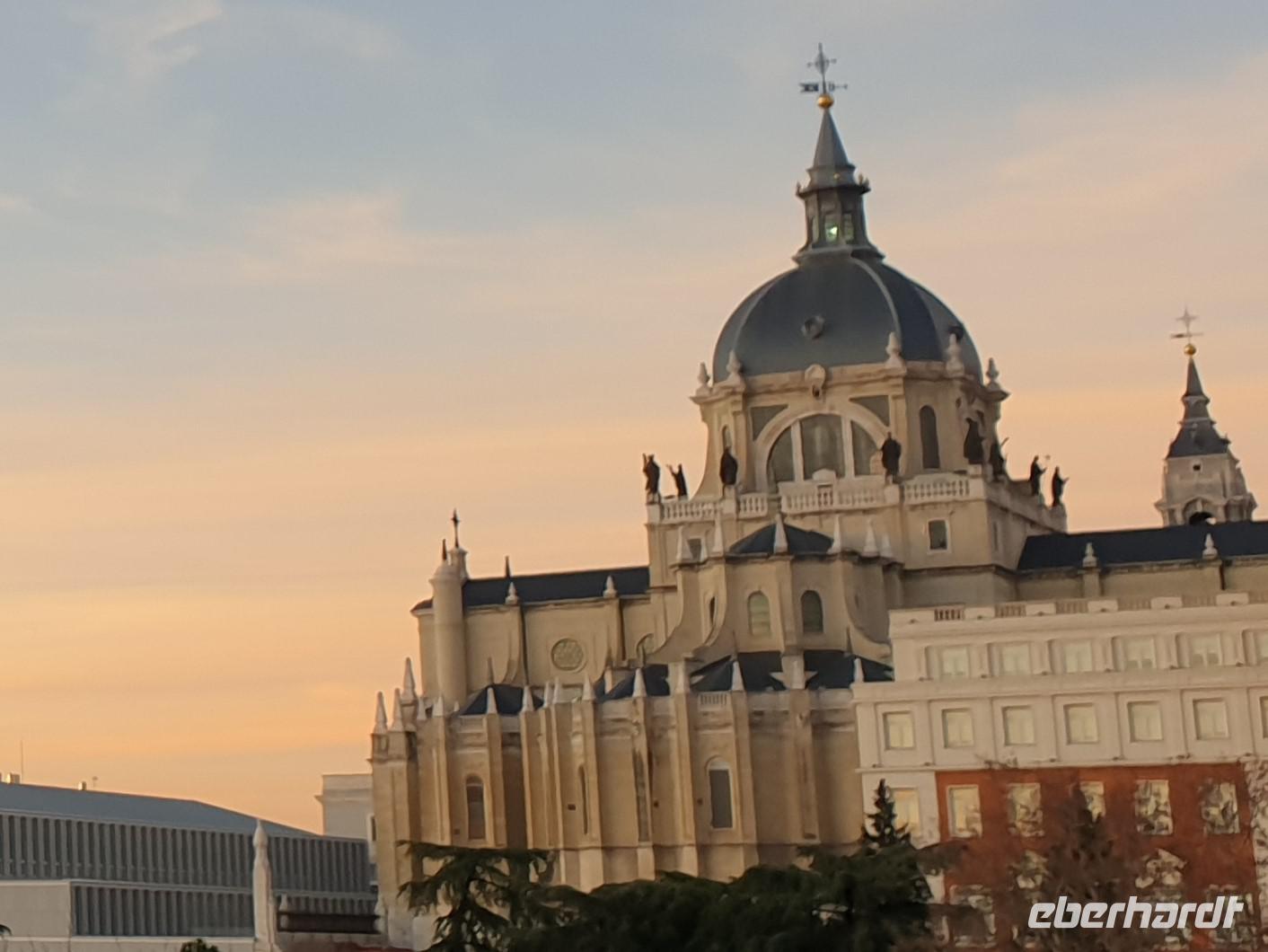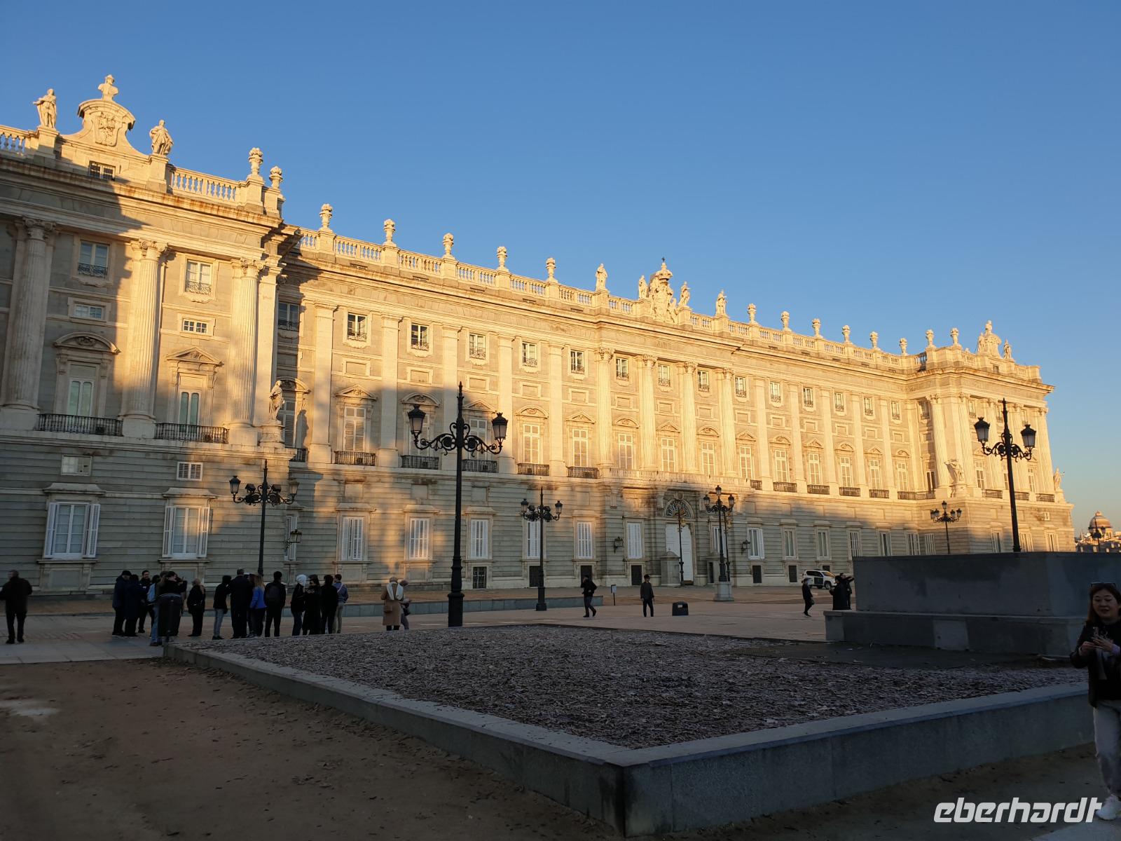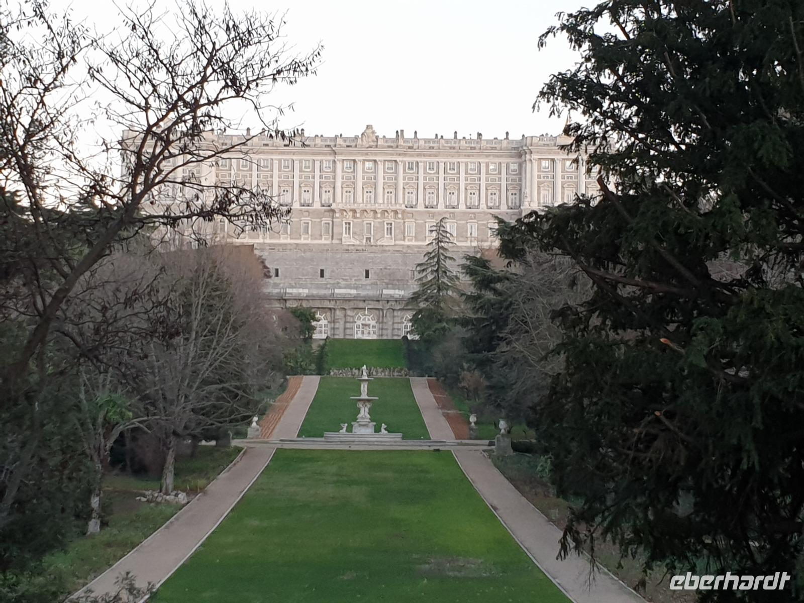 Anschließend gingen wir zu der berühmte „Templo de Debod", dem kleinen altägyptischen Tempel und ältesten Bauwerk Madrids. Es war ein Geschenk der ägyptischen Regierung an Spanien zum Dank für die Hilfe der spanischen Archäologen bei der Rettung Abu Simbels während des Baus des Asusanstaudamms vor mehr als 50 Jahren. Von hier hat man einen der besten Ausblicke von Madrid bis zu den Gebirgsketten voller Schnee über den Königspalast und die Casa de Campo. Wir wollten heute gar nicht viel mehr sehen, da wir noch einen richtigen Stadtrundgang am Mittwoch haben würden, aber einen erste Eindruck von meiner Heimat wollte ich meinen Gästen schon heute geben. Wir hatten riesig Glück mit dem Wetter in diesen Tage, da es immer sonnig war. Man darf nicht vergessen, dass sich Madrid in einer Höhe von 665 Metern befindet. Wenn die Sonne scheint, ist es sehr angenehm, aber am Abend und in der Nacht kann richtig frisch und kalt sein.