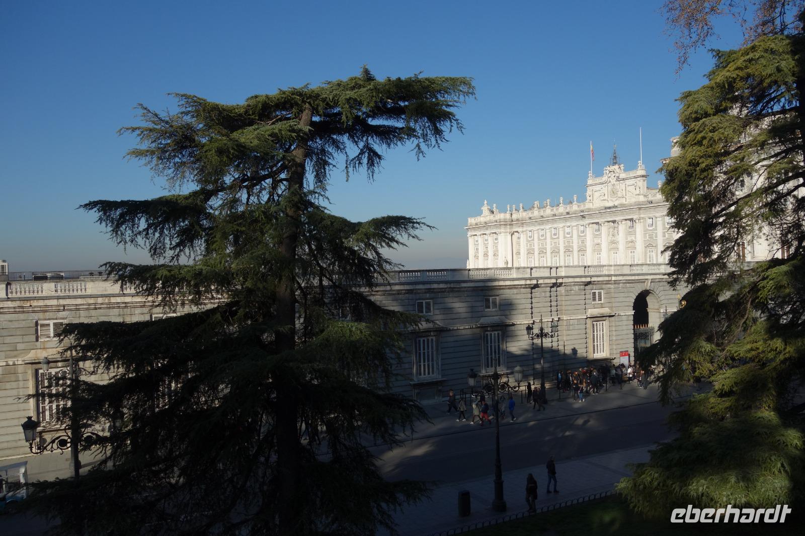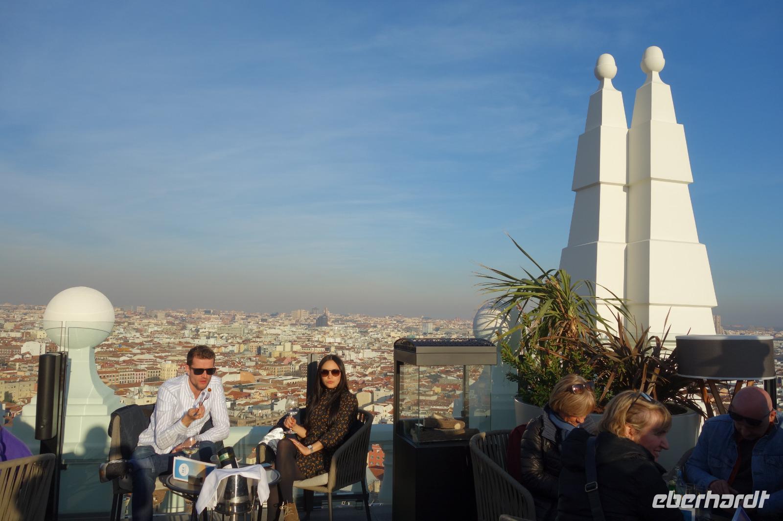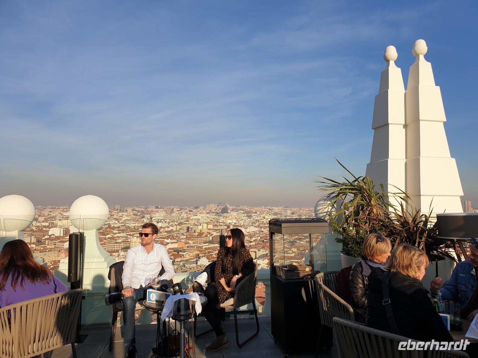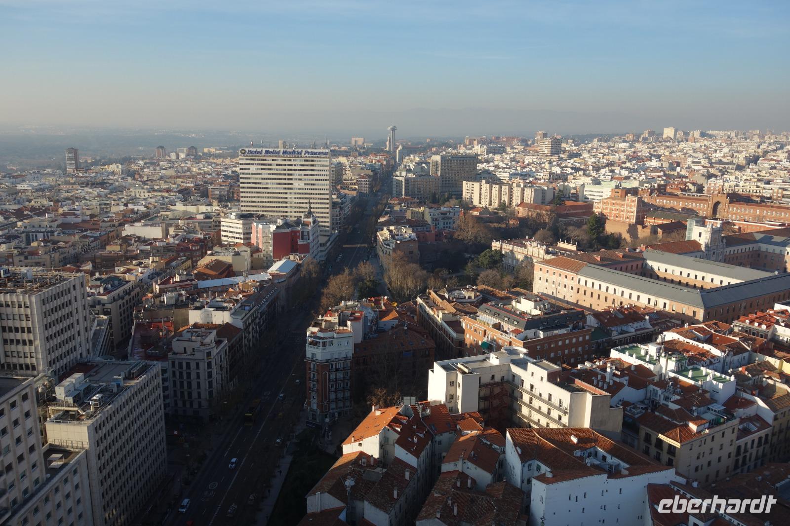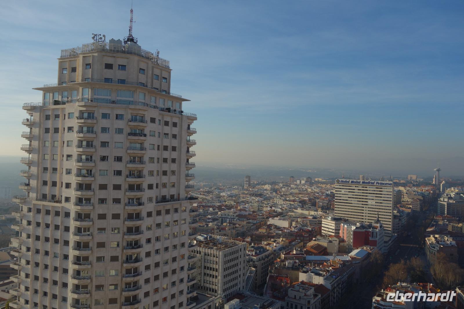 Anschließend gingen wir zu der berühmte „Templo de Debod", dem kleinen altägyptischen Tempel und ältesten Bauwerk Madrids. Es war ein Geschenk der ägyptischen Regierung an Spanien zum Dank für die Hilfe der spanischen Archäologen bei der Rettung Abu Simbels während des Baus des Asusanstaudamms vor mehr als 50 Jahren. Von hier hat man einen der besten Ausblicke von Madrid bis zu den Gebirgsketten voller Schnee über den Königspalast und die Casa de Campo. Wir wollten heute gar nicht viel mehr sehen, da wir noch einen richtigen Stadtrundgang am Mittwoch haben würden, aber einen erste Eindruck von meiner Heimat wollte ich meinen Gästen schon heute geben. Wir hatten riesig Glück mit dem Wetter in diesen Tage, da es immer sonnig war. Man darf nicht vergessen, dass sich Madrid in einer Höhe von 665 Metern befindet. Wenn die Sonne scheint, ist es sehr angenehm, aber am Abend und in der Nacht kann richtig frisch und kalt sein.