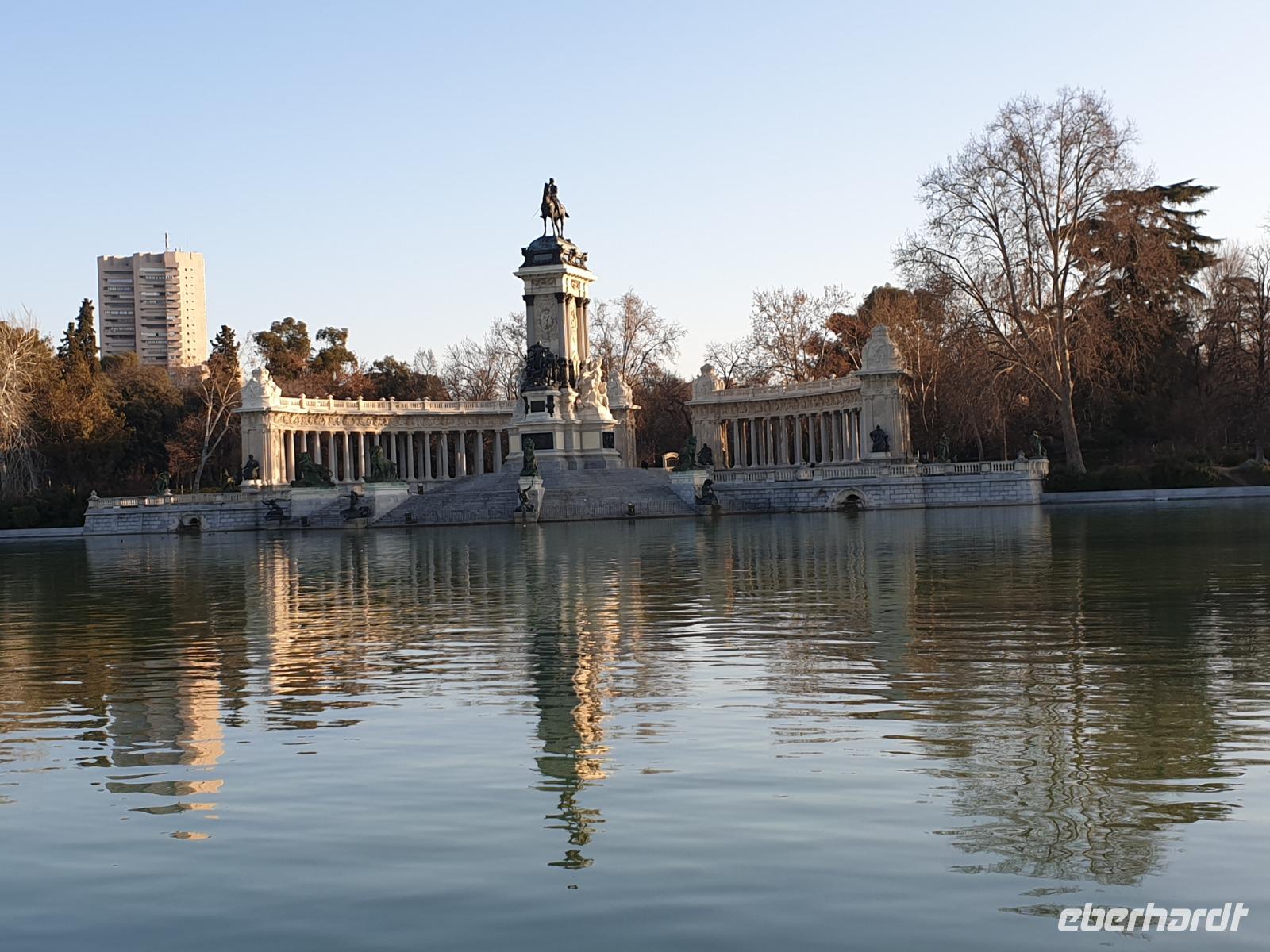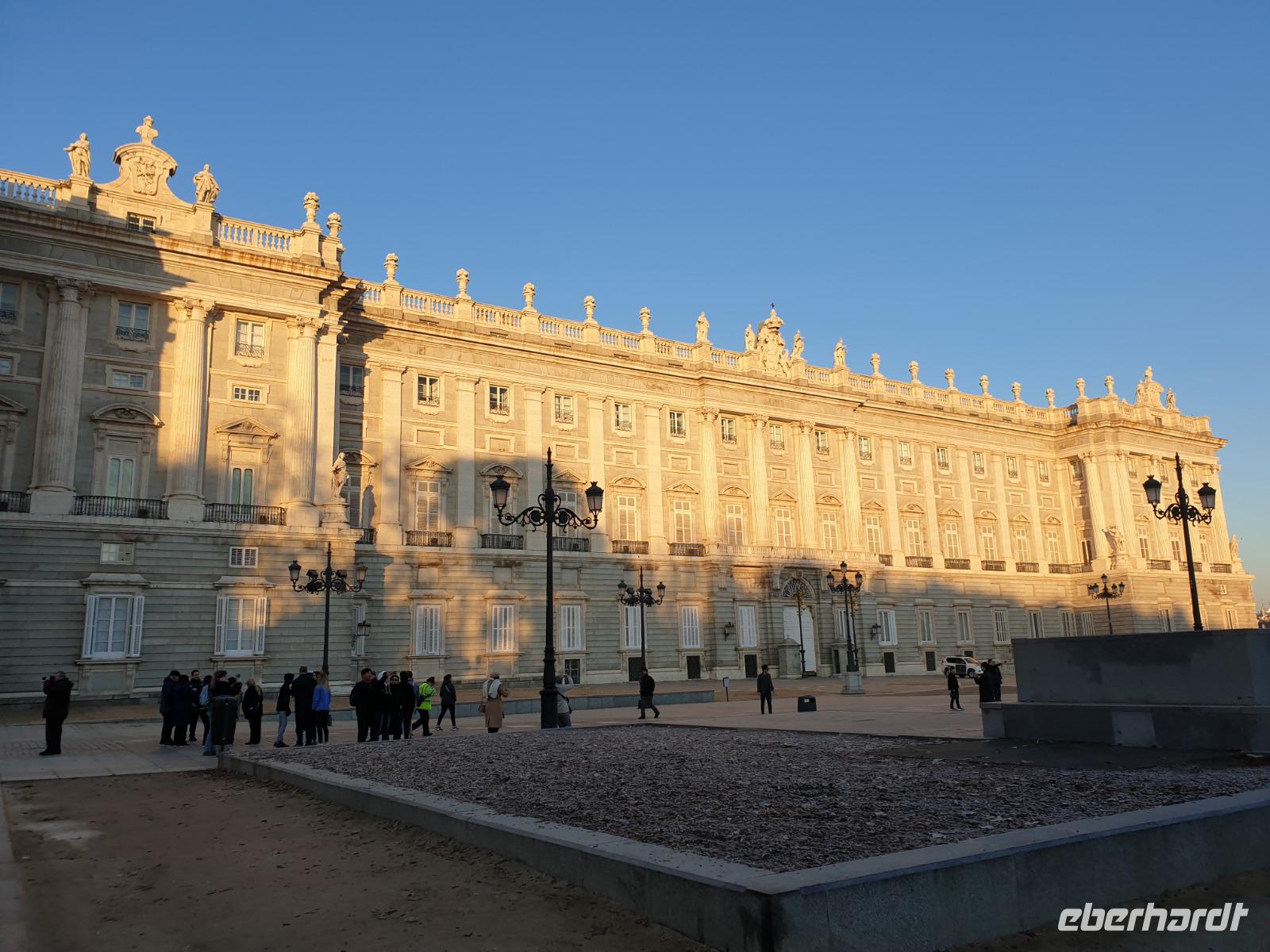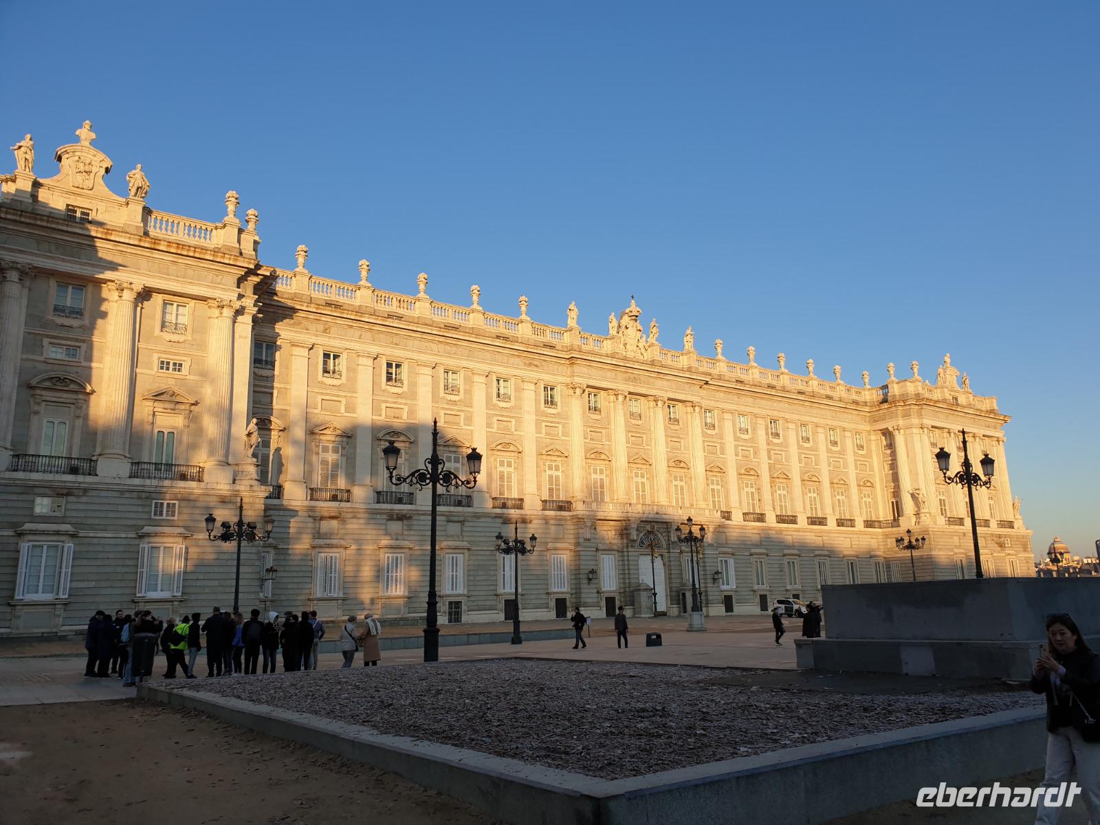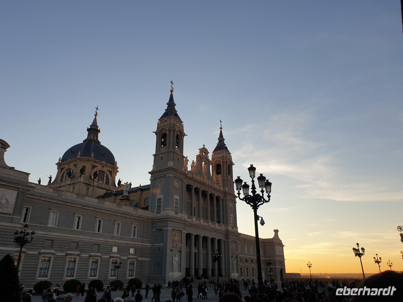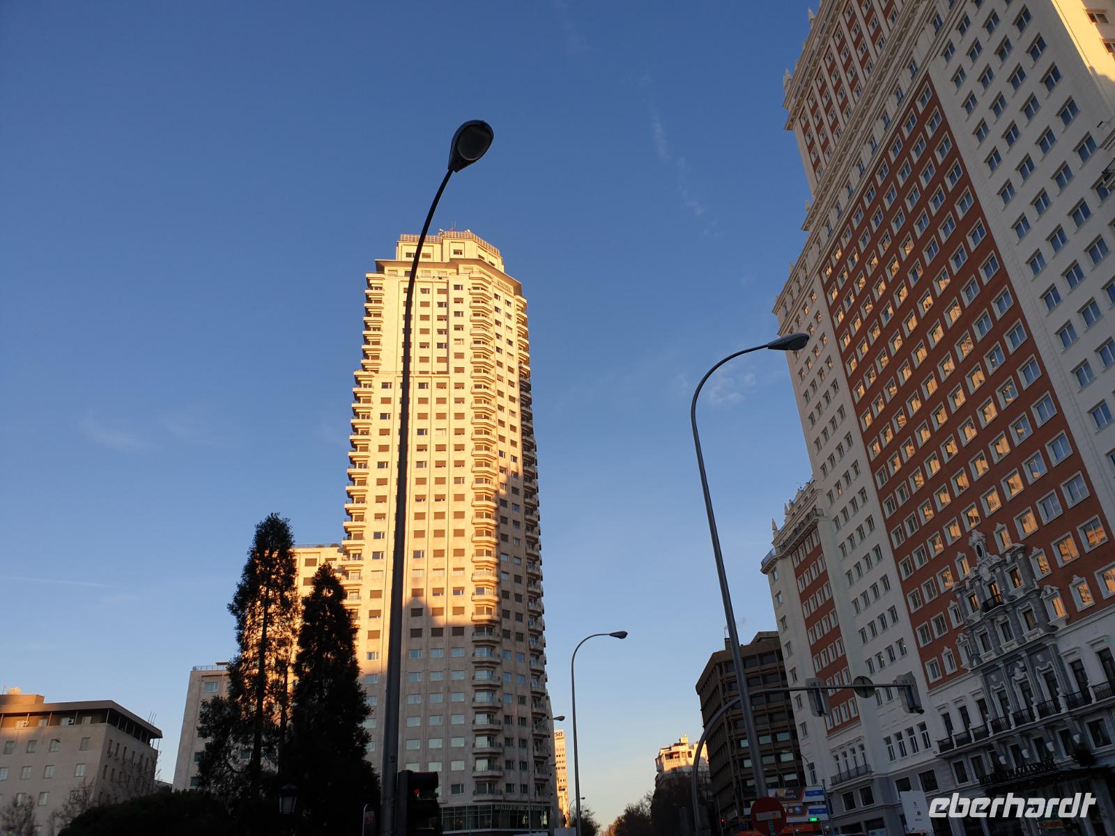 Anschließend gingen wir zu der berühmte „Templo de Debod", dem kleinen altägyptischen Tempel und ältesten Bauwerk Madrids. Es war ein Geschenk der ägyptischen Regierung an Spanien zum Dank für die Hilfe der spanischen Archäologen bei der Rettung Abu Simbels während des Baus des Asusanstaudamms vor mehr als 50 Jahren. Von hier hat man einen der besten Ausblicke von Madrid bis zu den Gebirgsketten voller Schnee über den Königspalast und die Casa de Campo. Wir wollten heute gar nicht viel mehr sehen, da wir noch einen richtigen Stadtrundgang am Mittwoch haben würden, aber einen erste Eindruck von meiner Heimat wollte ich meinen Gästen schon heute geben. Wir hatten riesig Glück mit dem Wetter in diesen Tage, da es immer sonnig war. Man darf nicht vergessen, dass sich Madrid in einer Höhe von 665 Metern befindet. Wenn die Sonne scheint, ist es sehr angenehm, aber am Abend und in der Nacht kann richtig frisch und kalt sein.