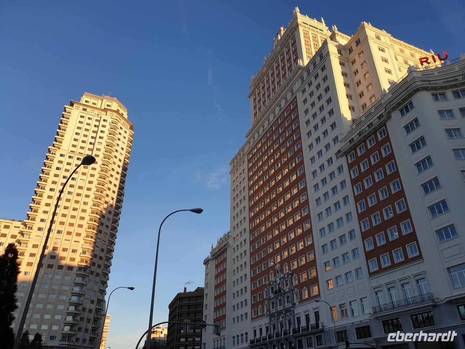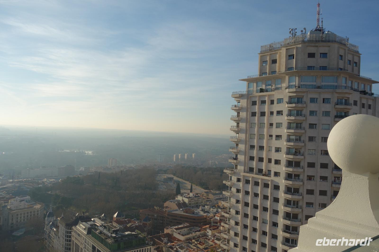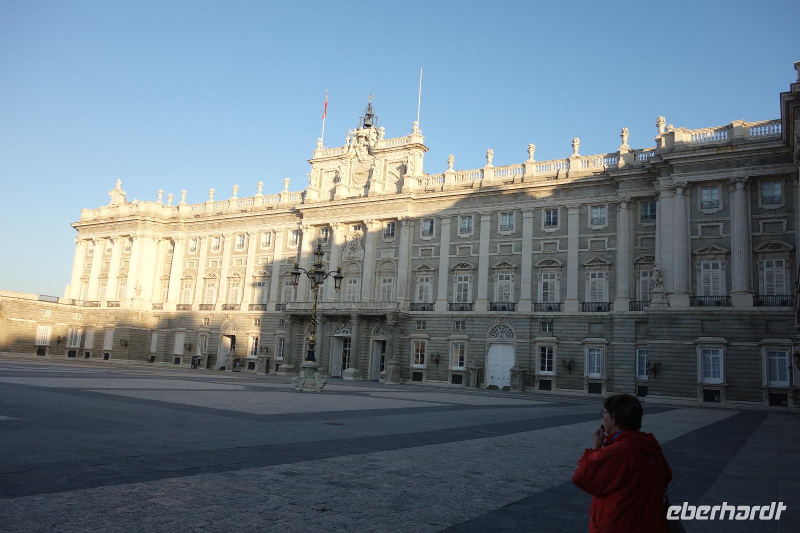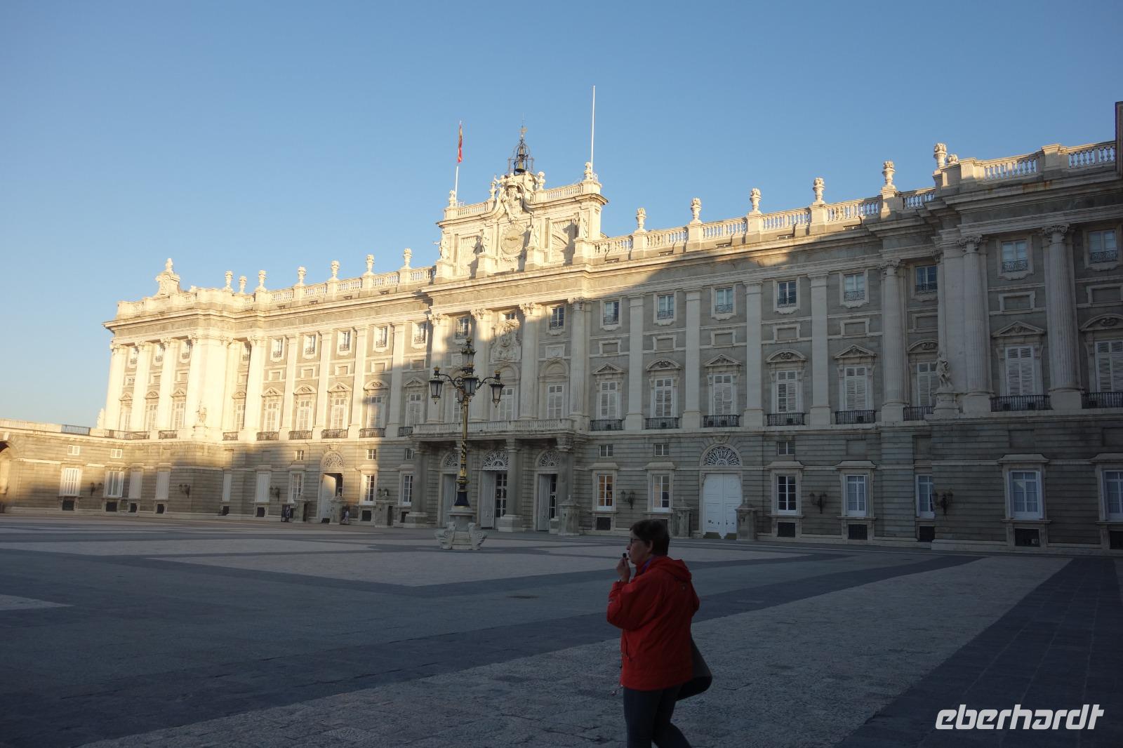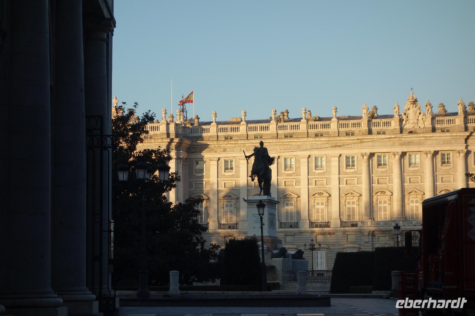 Anschließend gingen wir zu der berühmte „Templo de Debod", dem kleinen altägyptischen Tempel und ältesten Bauwerk Madrids. Es war ein Geschenk der ägyptischen Regierung an Spanien zum Dank für die Hilfe der spanischen Archäologen bei der Rettung Abu Simbels während des Baus des Asusanstaudamms vor mehr als 50 Jahren. Von hier hat man einen der besten Ausblicke von Madrid bis zu den Gebirgsketten voller Schnee über den Königspalast und die Casa de Campo. Wir wollten heute gar nicht viel mehr sehen, da wir noch einen richtigen Stadtrundgang am Mittwoch haben würden, aber einen erste Eindruck von meiner Heimat wollte ich meinen Gästen schon heute geben. Wir hatten riesig Glück mit dem Wetter in diesen Tage, da es immer sonnig war. Man darf nicht vergessen, dass sich Madrid in einer Höhe von 665 Metern befindet. Wenn die Sonne scheint, ist es sehr angenehm, aber am Abend und in der Nacht kann richtig frisch und kalt sein.