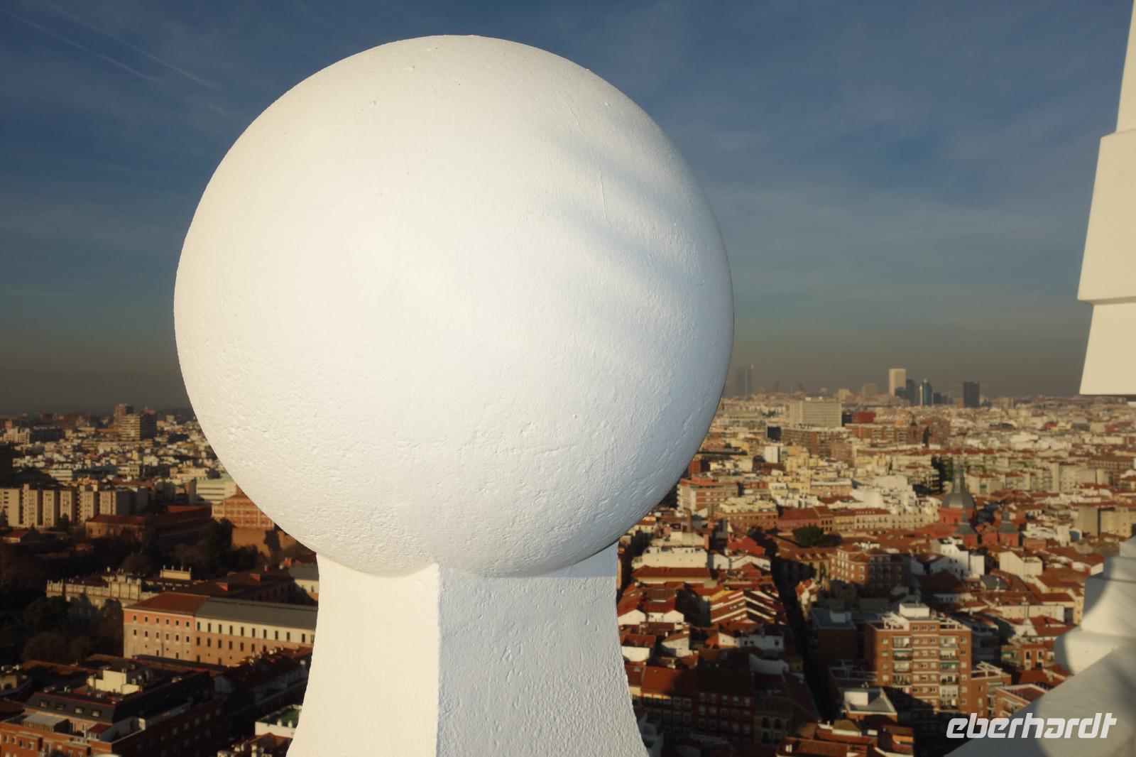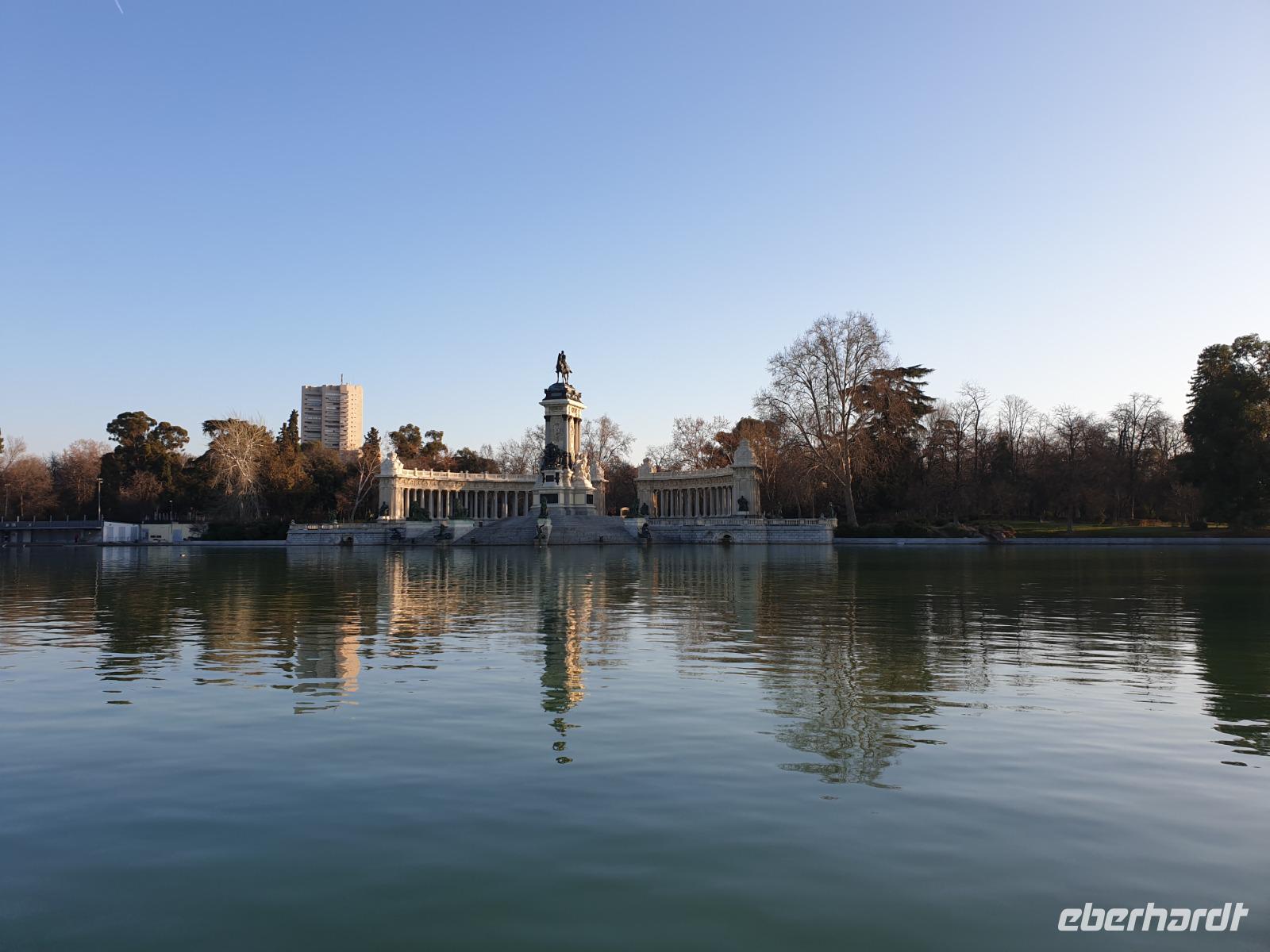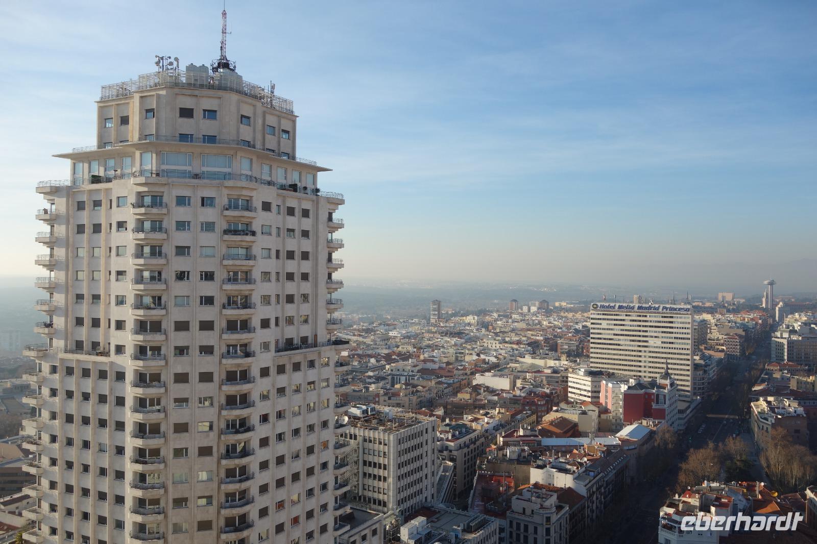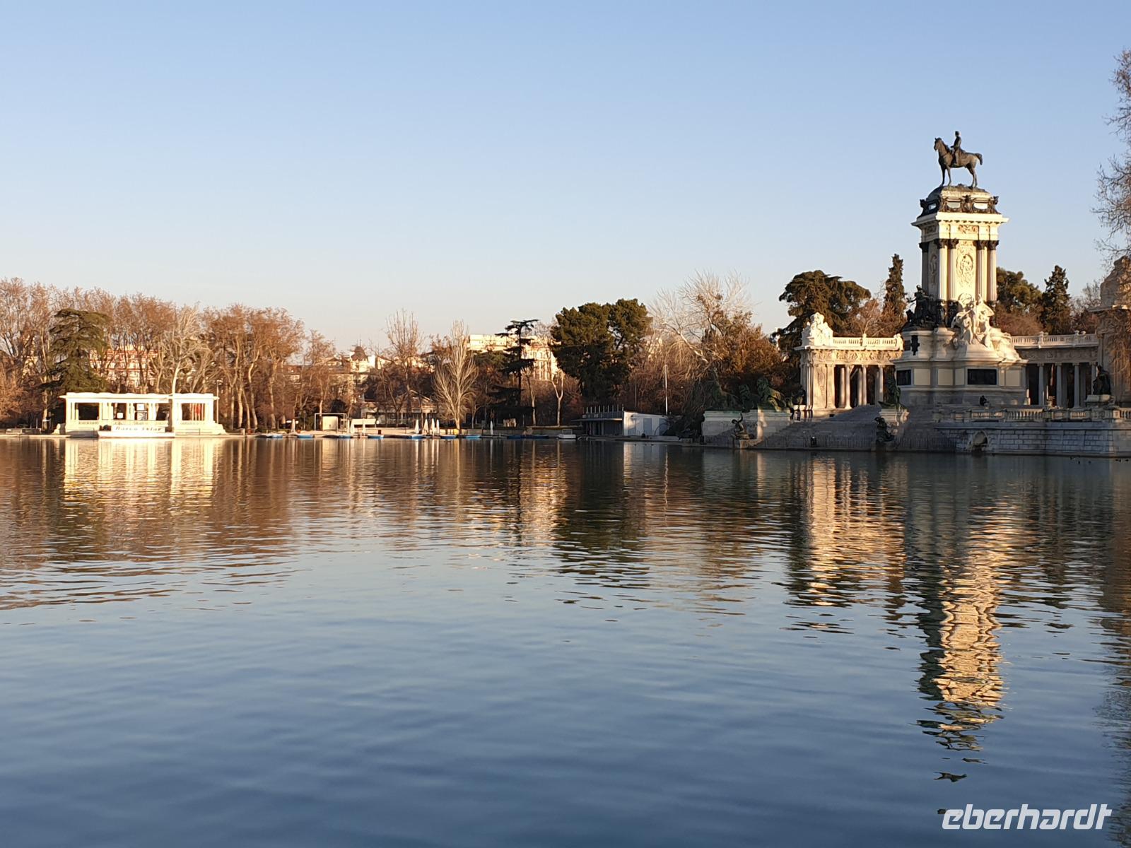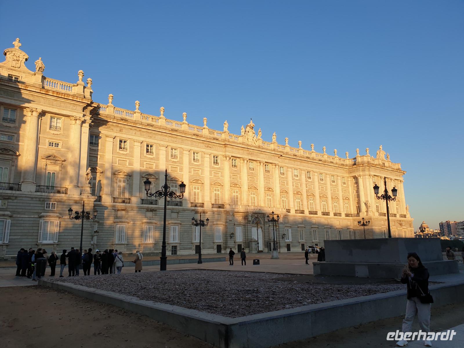 Anschließend gingen wir zu der berühmte „Templo de Debod", dem kleinen altägyptischen Tempel und ältesten Bauwerk Madrids. Es war ein Geschenk der ägyptischen Regierung an Spanien zum Dank für die Hilfe der spanischen Archäologen bei der Rettung Abu Simbels während des Baus des Asusanstaudamms vor mehr als 50 Jahren. Von hier hat man einen der besten Ausblicke von Madrid bis zu den Gebirgsketten voller Schnee über den Königspalast und die Casa de Campo. Wir wollten heute gar nicht viel mehr sehen, da wir noch einen richtigen Stadtrundgang am Mittwoch haben würden, aber einen erste Eindruck von meiner Heimat wollte ich meinen Gästen schon heute geben. Wir hatten riesig Glück mit dem Wetter in diesen Tage, da es immer sonnig war. Man darf nicht vergessen, dass sich Madrid in einer Höhe von 665 Metern befindet. Wenn die Sonne scheint, ist es sehr angenehm, aber am Abend und in der Nacht kann richtig frisch und kalt sein.