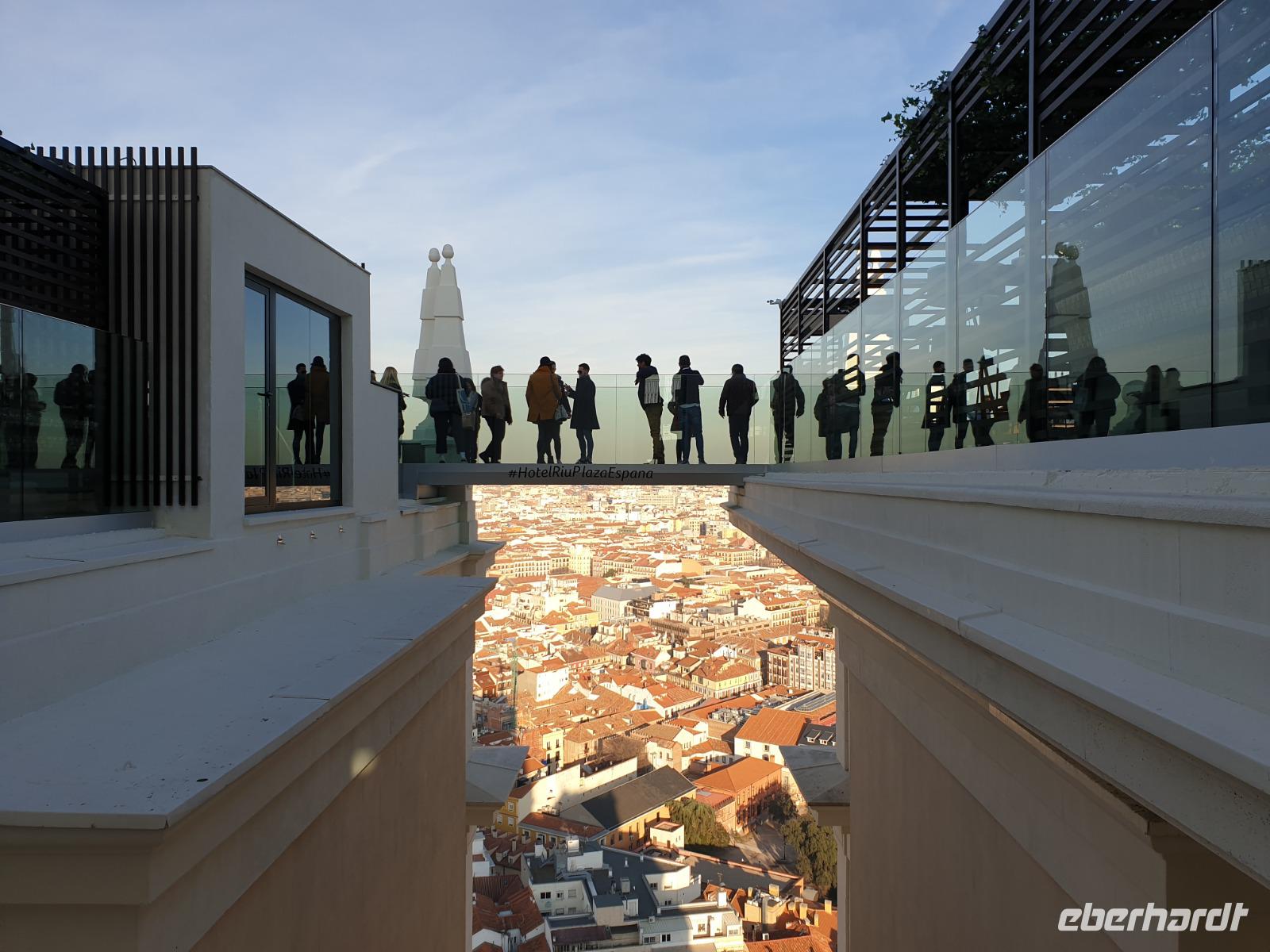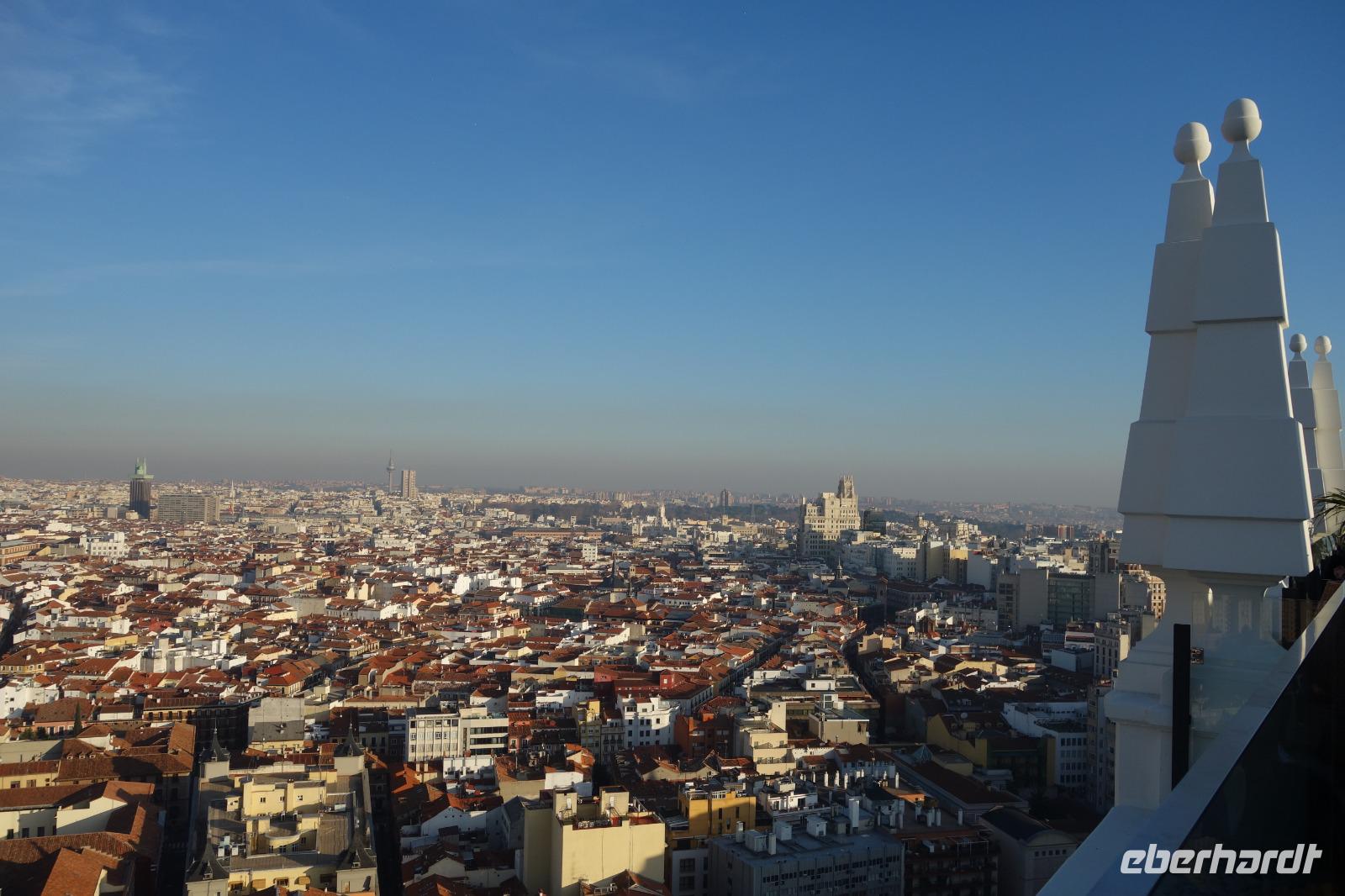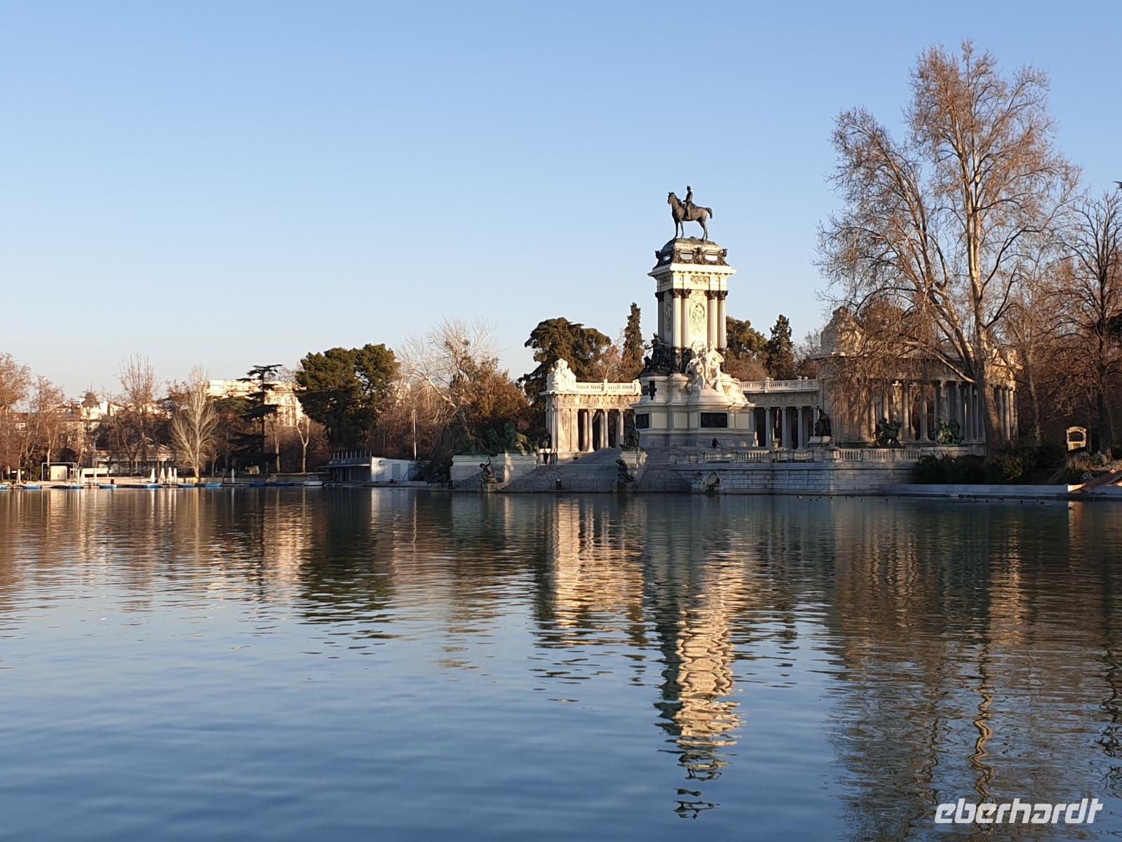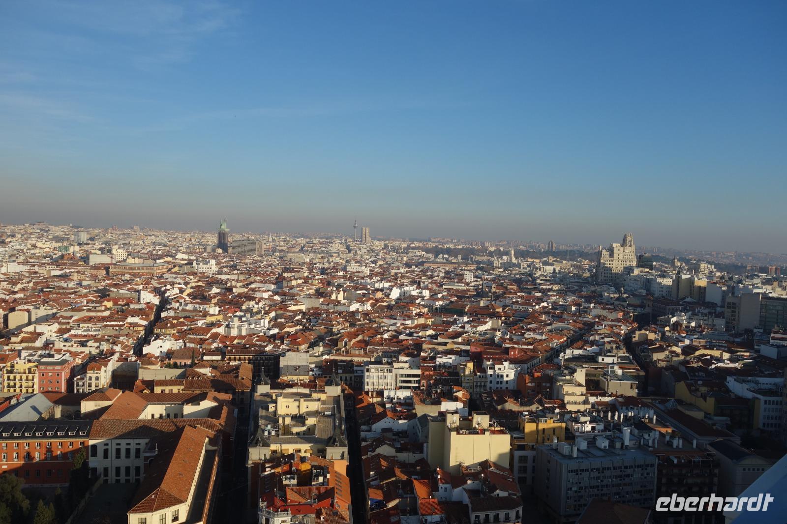 Anschließend gingen wir zu der berühmte „Templo de Debod", dem kleinen altägyptischen Tempel und ältesten Bauwerk Madrids. Es war ein Geschenk der ägyptischen Regierung an Spanien zum Dank für die Hilfe der spanischen Archäologen bei der Rettung Abu Simbels während des Baus des Asusanstaudamms vor mehr als 50 Jahren. Von hier hat man einen der besten Ausblicke von Madrid bis zu den Gebirgsketten voller Schnee über den Königspalast und die Casa de Campo. Wir wollten heute gar nicht viel mehr sehen, da wir noch einen richtigen Stadtrundgang am Mittwoch haben würden, aber einen erste Eindruck von meiner Heimat wollte ich meinen Gästen schon heute geben. Wir hatten riesig Glück mit dem Wetter in diesen Tage, da es immer sonnig war. Man darf nicht vergessen, dass sich Madrid in einer Höhe von 665 Metern befindet. Wenn die Sonne scheint, ist es sehr angenehm, aber am Abend und in der Nacht kann richtig frisch und kalt sein.