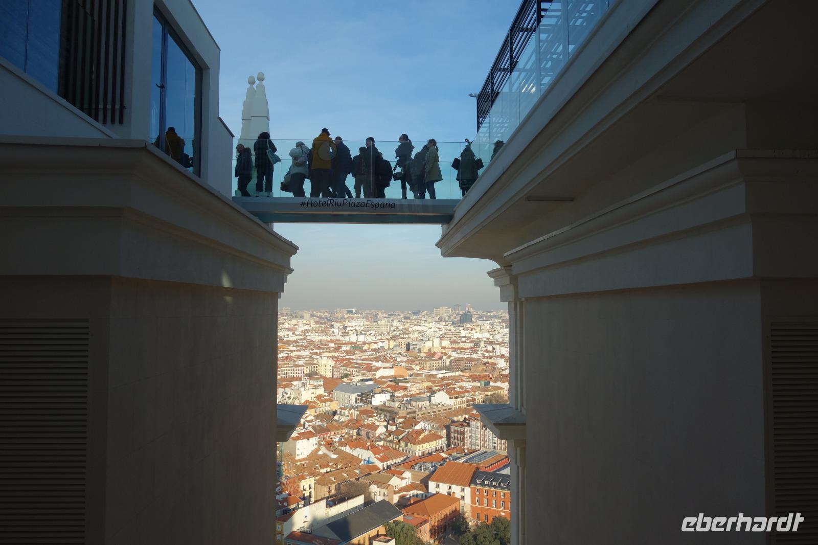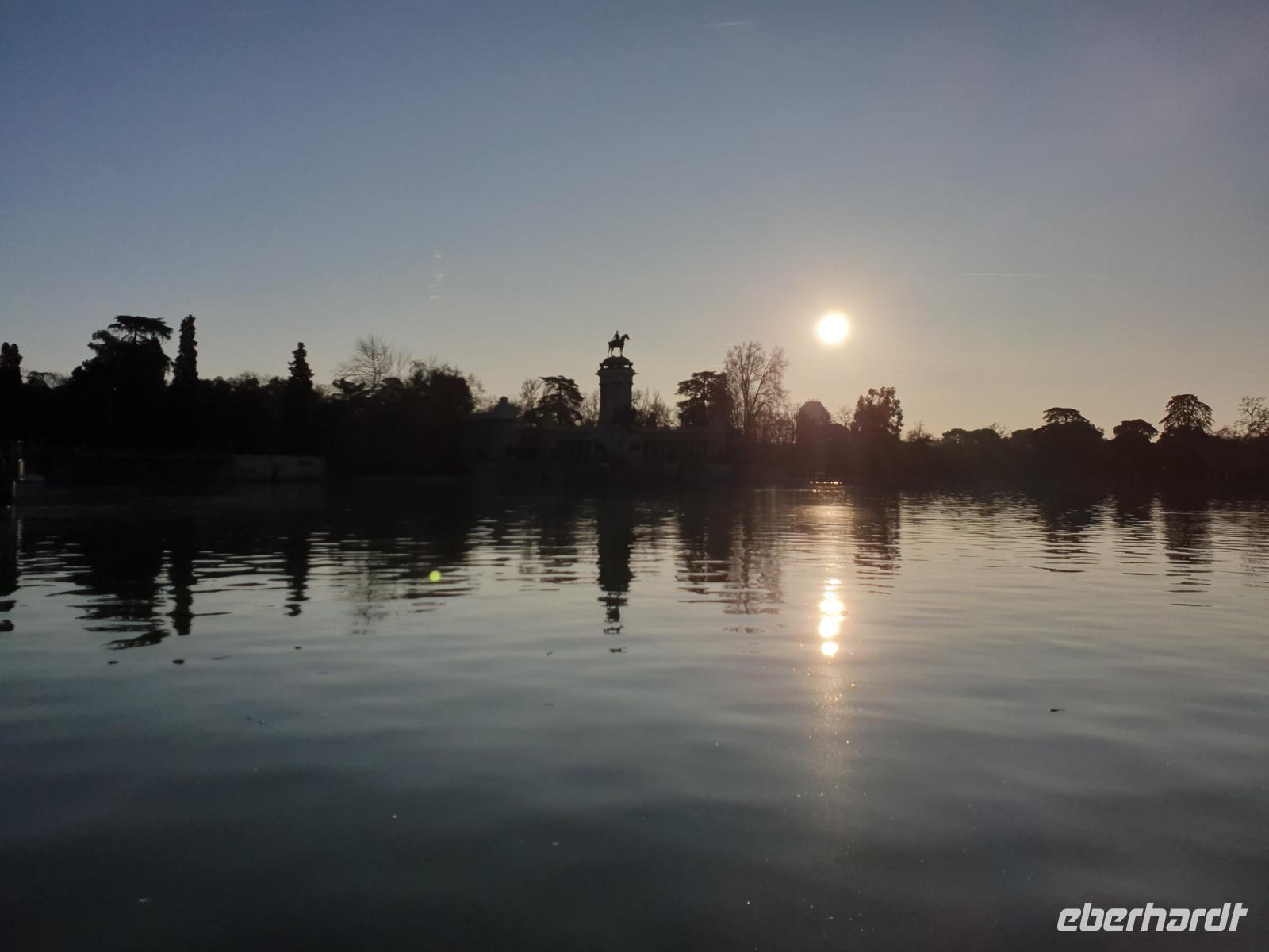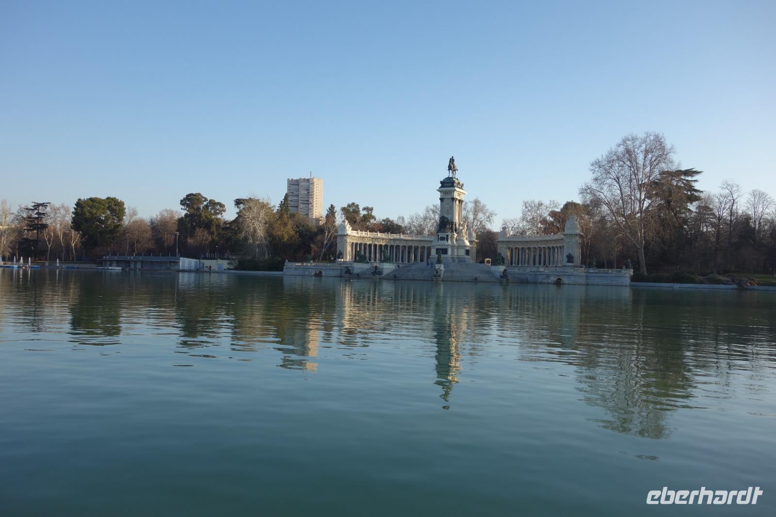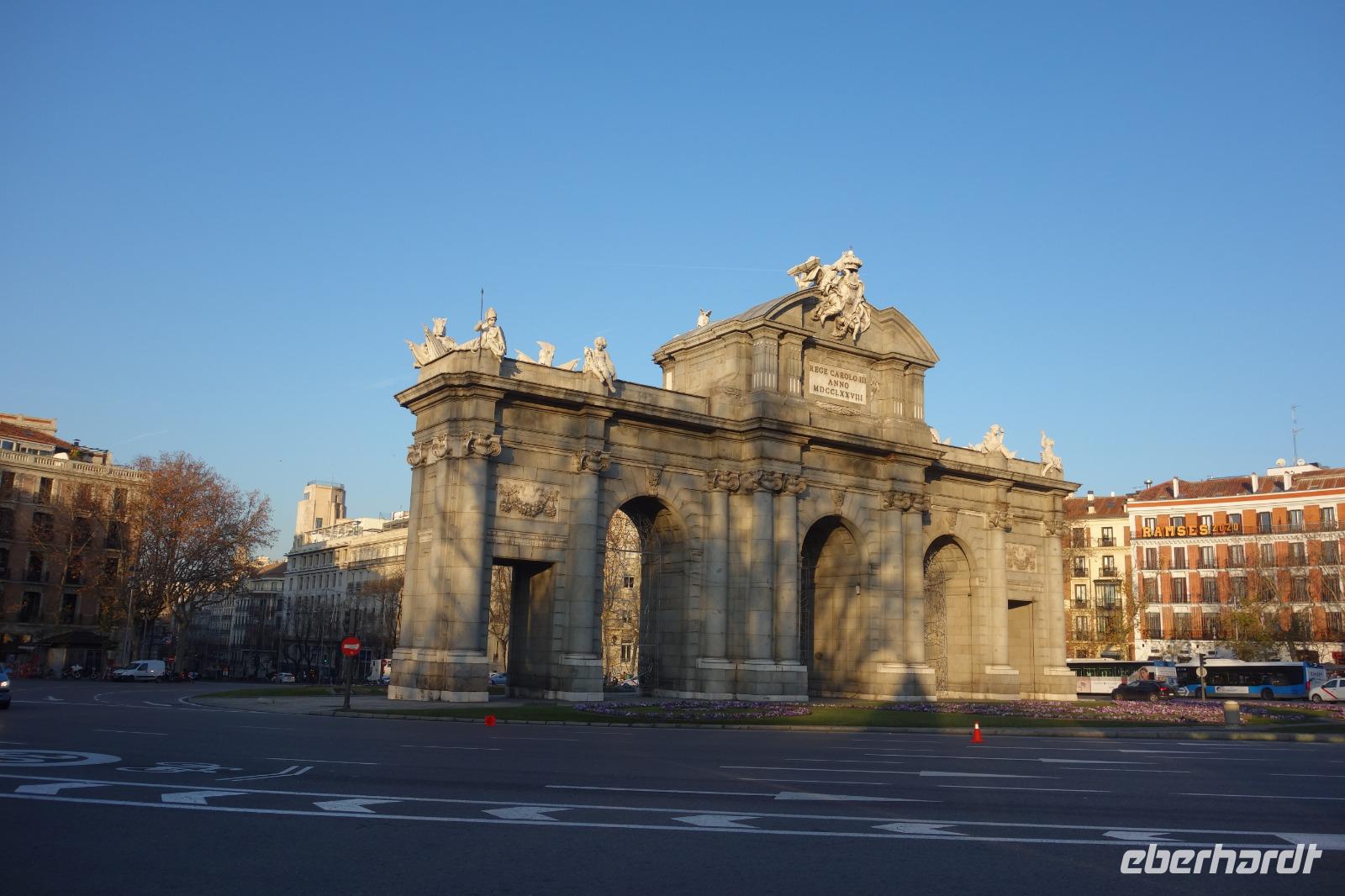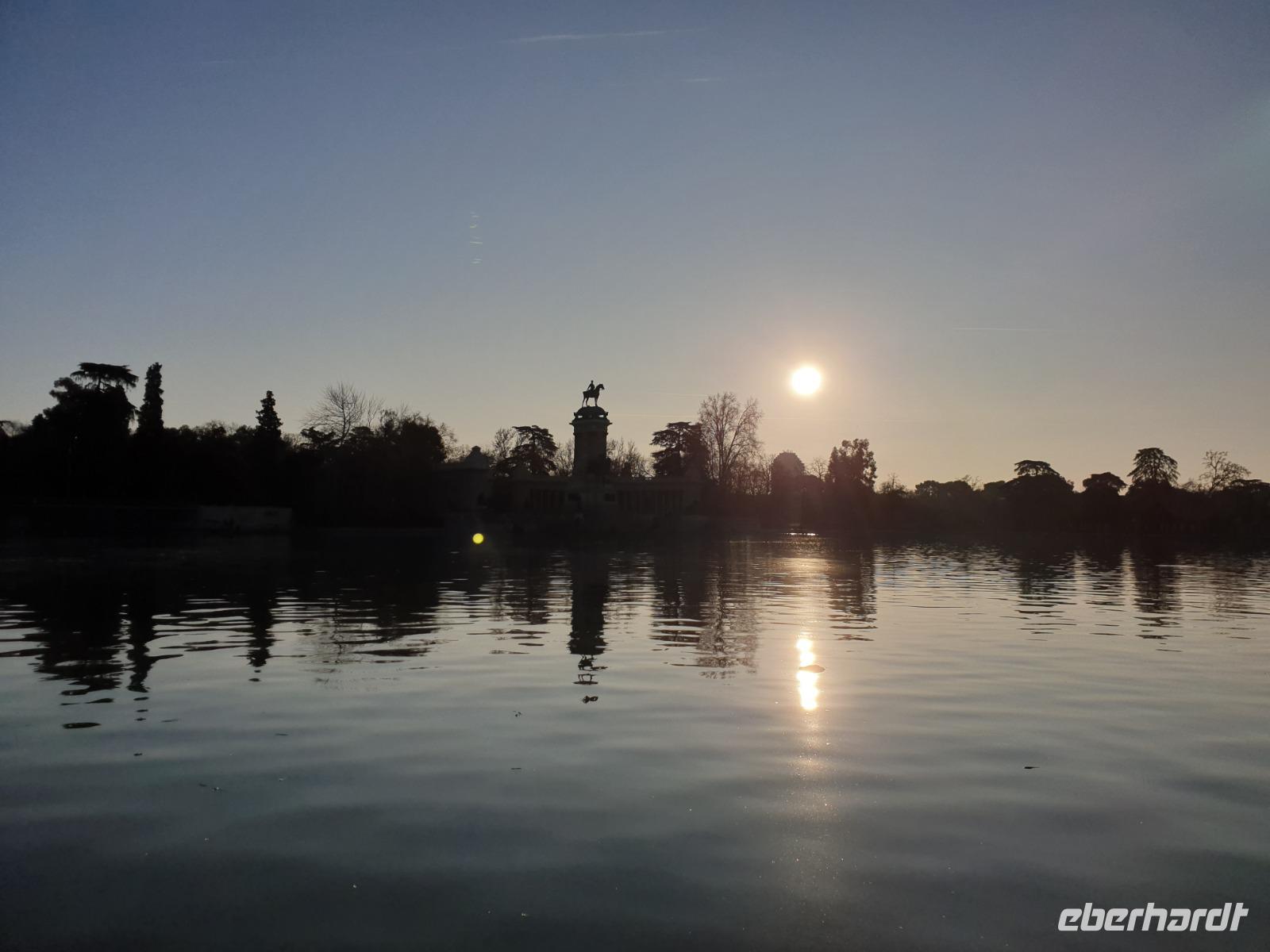 Anschließend gingen wir zu der berühmte „Templo de Debod", dem kleinen altägyptischen Tempel und ältesten Bauwerk Madrids. Es war ein Geschenk der ägyptischen Regierung an Spanien zum Dank für die Hilfe der spanischen Archäologen bei der Rettung Abu Simbels während des Baus des Asusanstaudamms vor mehr als 50 Jahren. Von hier hat man einen der besten Ausblicke von Madrid bis zu den Gebirgsketten voller Schnee über den Königspalast und die Casa de Campo. Wir wollten heute gar nicht viel mehr sehen, da wir noch einen richtigen Stadtrundgang am Mittwoch haben würden, aber einen erste Eindruck von meiner Heimat wollte ich meinen Gästen schon heute geben. Wir hatten riesig Glück mit dem Wetter in diesen Tage, da es immer sonnig war. Man darf nicht vergessen, dass sich Madrid in einer Höhe von 665 Metern befindet. Wenn die Sonne scheint, ist es sehr angenehm, aber am Abend und in der Nacht kann richtig frisch und kalt sein.
