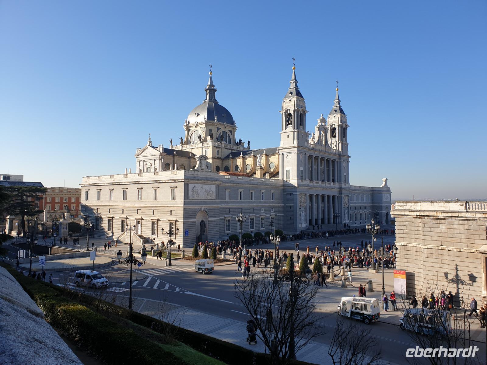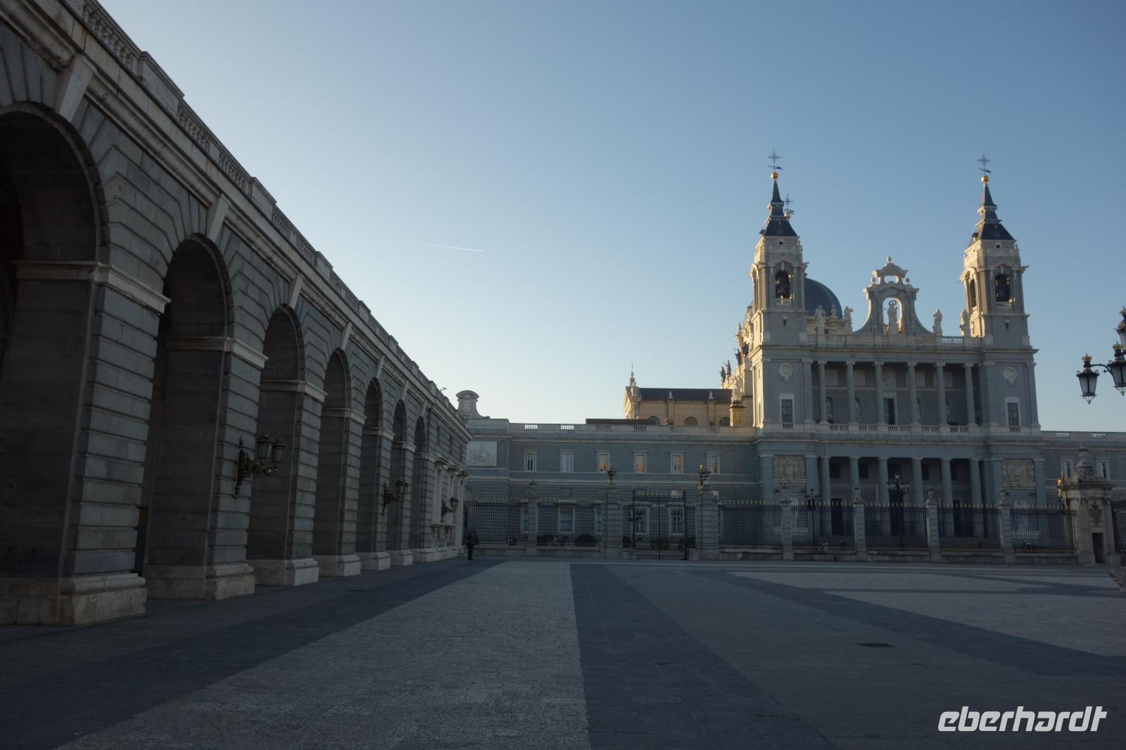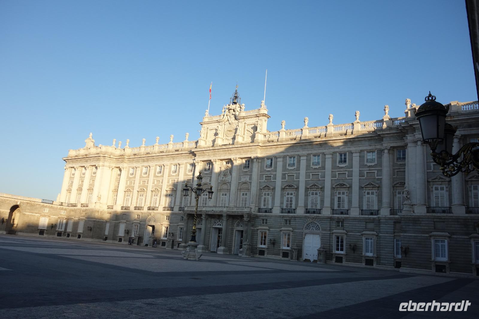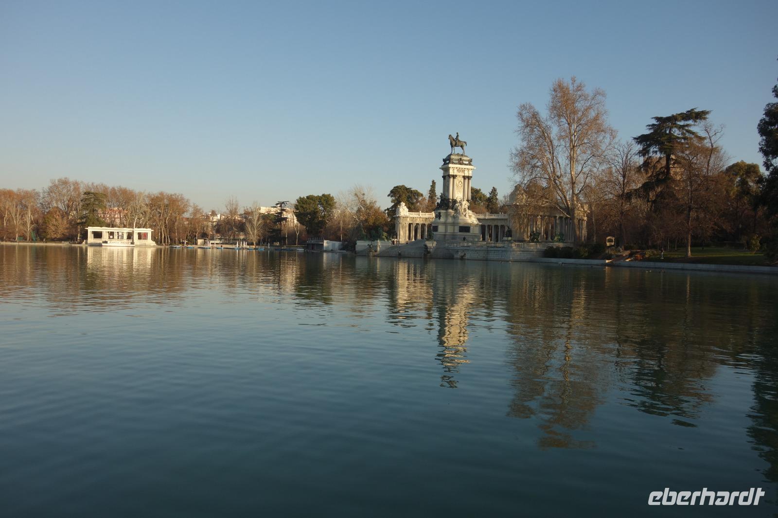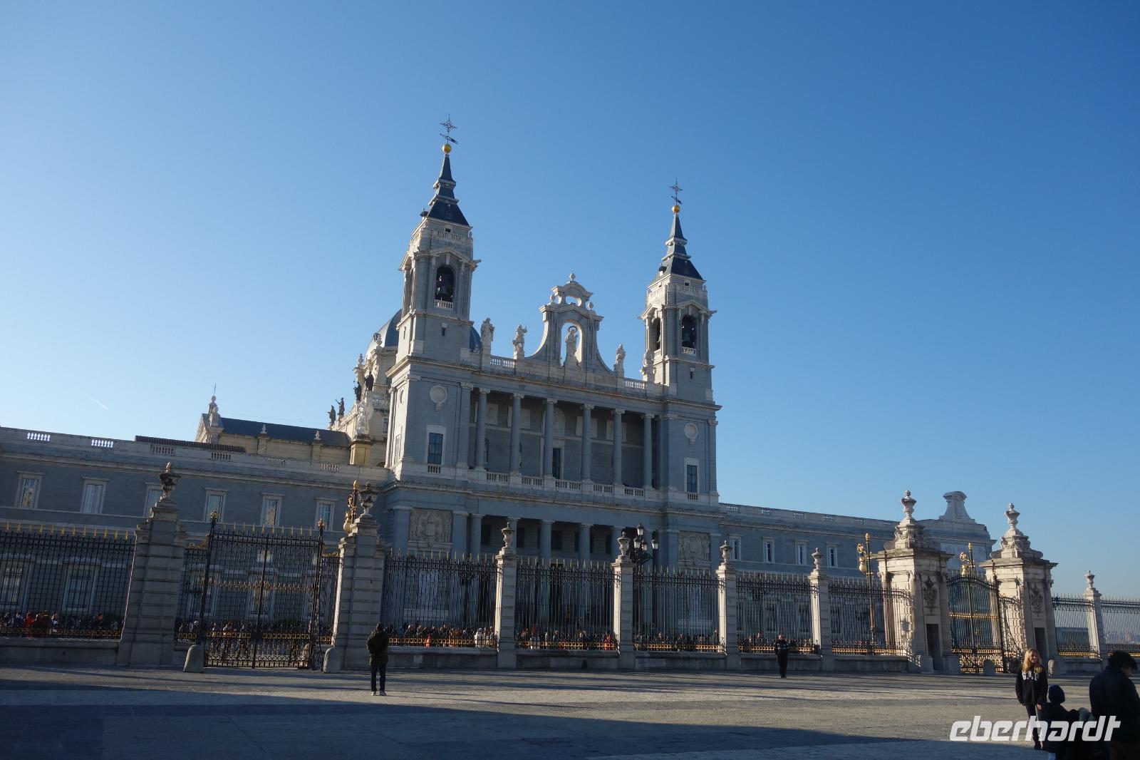 Anschließend gingen wir zu der berühmte „Templo de Debod", dem kleinen altägyptischen Tempel und ältesten Bauwerk Madrids. Es war ein Geschenk der ägyptischen Regierung an Spanien zum Dank für die Hilfe der spanischen Archäologen bei der Rettung Abu Simbels während des Baus des Asusanstaudamms vor mehr als 50 Jahren. Von hier hat man einen der besten Ausblicke von Madrid bis zu den Gebirgsketten voller Schnee über den Königspalast und die Casa de Campo. Wir wollten heute gar nicht viel mehr sehen, da wir noch einen richtigen Stadtrundgang am Mittwoch haben würden, aber einen erste Eindruck von meiner Heimat wollte ich meinen Gästen schon heute geben. Wir hatten riesig Glück mit dem Wetter in diesen Tage, da es immer sonnig war. Man darf nicht vergessen, dass sich Madrid in einer Höhe von 665 Metern befindet. Wenn die Sonne scheint, ist es sehr angenehm, aber am Abend und in der Nacht kann richtig frisch und kalt sein.