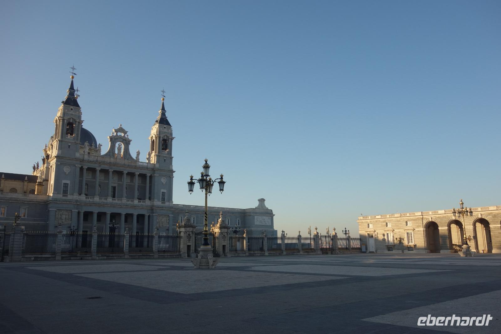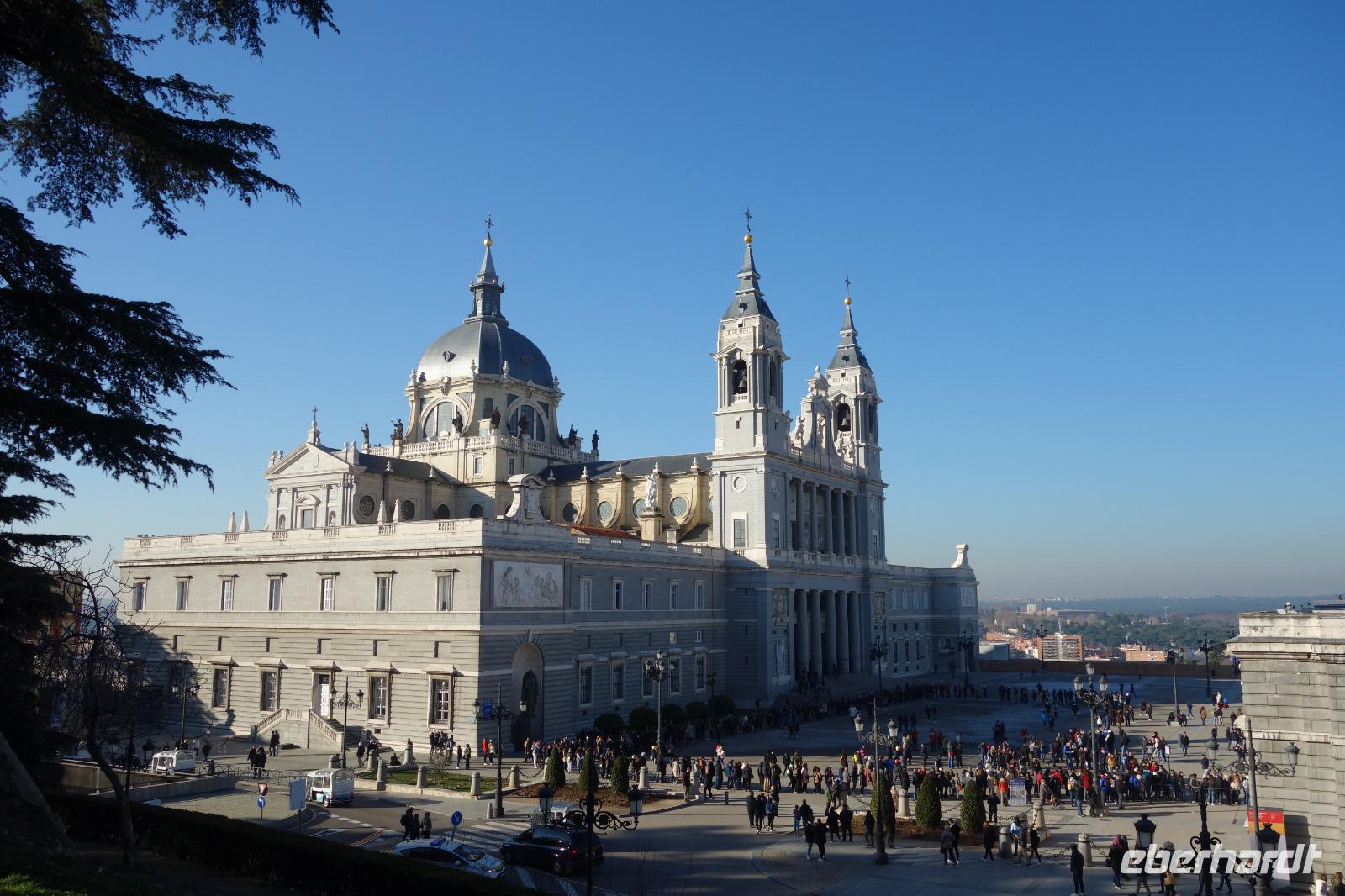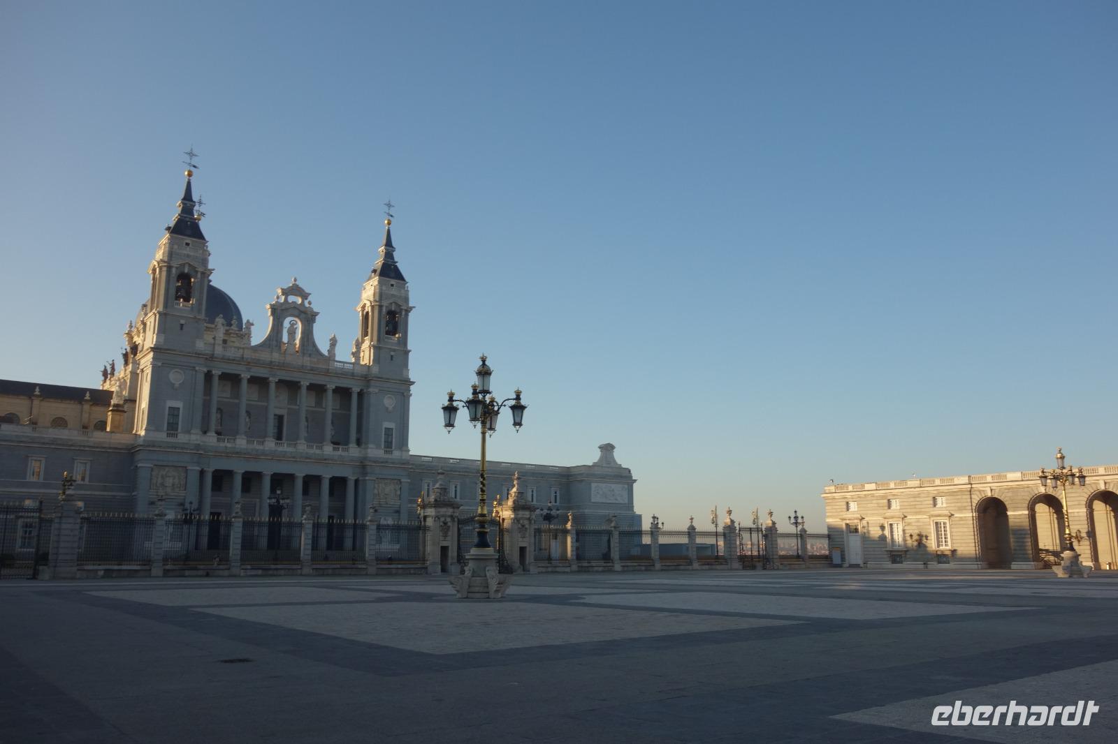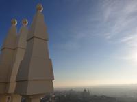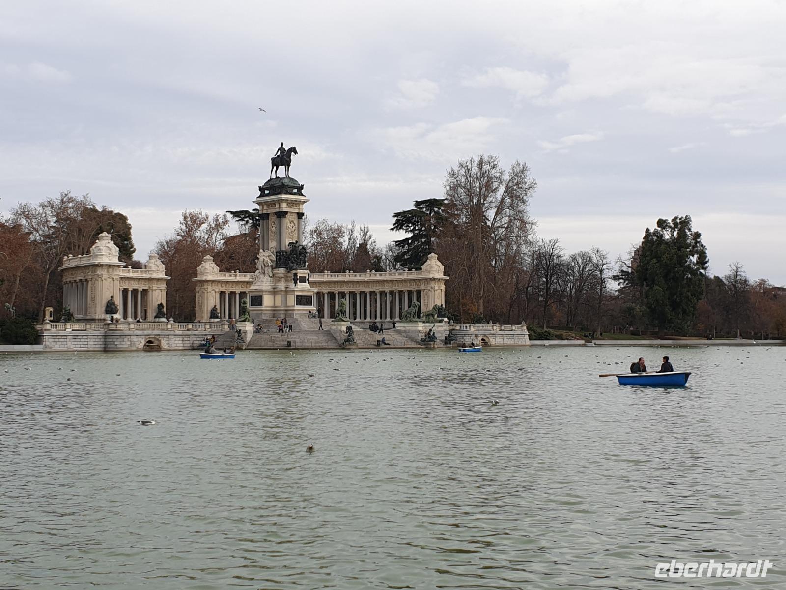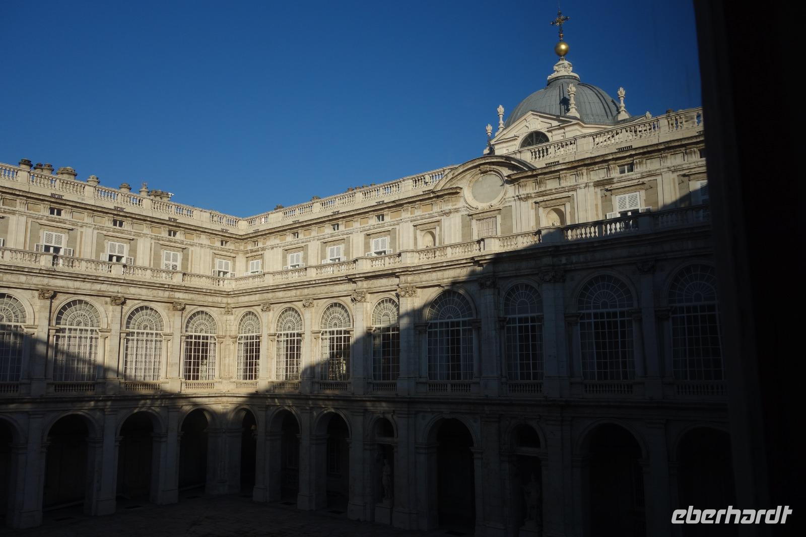 Anschließend gingen wir zu der berühmte „Templo de Debod", dem kleinen altägyptischen Tempel und ältesten Bauwerk Madrids. Es war ein Geschenk der ägyptischen Regierung an Spanien zum Dank für die Hilfe der spanischen Archäologen bei der Rettung Abu Simbels während des Baus des Asusanstaudamms vor mehr als 50 Jahren. Von hier hat man einen der besten Ausblicke von Madrid bis zu den Gebirgsketten voller Schnee über den Königspalast und die Casa de Campo. Wir wollten heute gar nicht viel mehr sehen, da wir noch einen richtigen Stadtrundgang am Mittwoch haben würden, aber einen erste Eindruck von meiner Heimat wollte ich meinen Gästen schon heute geben. Wir hatten riesig Glück mit dem Wetter in diesen Tage, da es immer sonnig war. Man darf nicht vergessen, dass sich Madrid in einer Höhe von 665 Metern befindet. Wenn die Sonne scheint, ist es sehr angenehm, aber am Abend und in der Nacht kann richtig frisch und kalt sein.