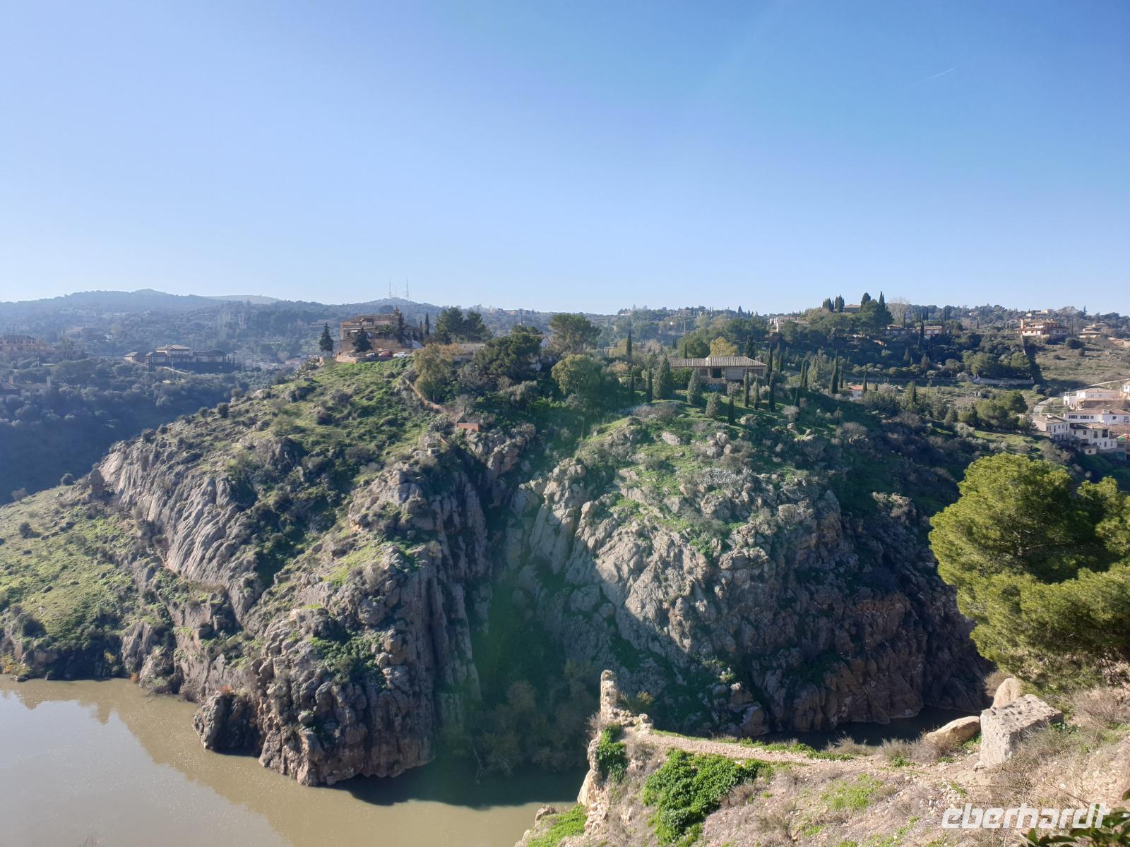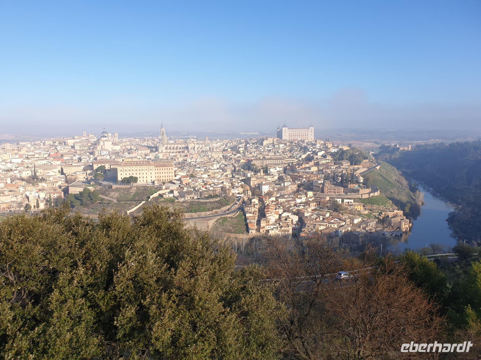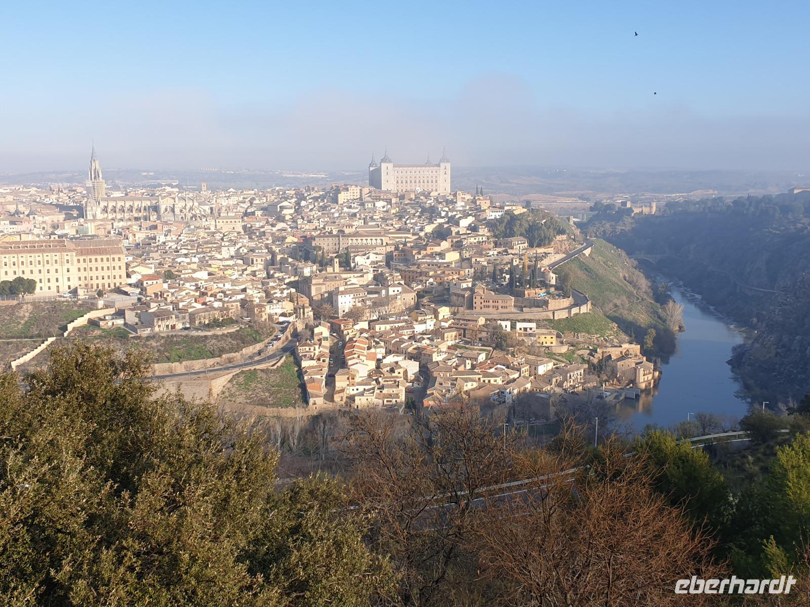 Heute fuhren wir zur eindrucksvollen Stadt Toledo, weniger als 1 Stunde entfernt von Madrid. Wir hatten die beste Reiseleiterin in Madrid, die man haben konnte - Christine, die uns ihre neue Heimat zeigte. Diese prächtige historische Metropole thront hoch über dem Ufer des Tajo, der sich an dieser Stelle tief in das Hochland eingeschnitten hat. Um diesen Blick genauso zu haben, fuhren wir erstmal außerhalb Toledos zu der berühmten Parador Nacional Hotel Terrasse, wo wir diesen Panorama Blick genießen konnten.