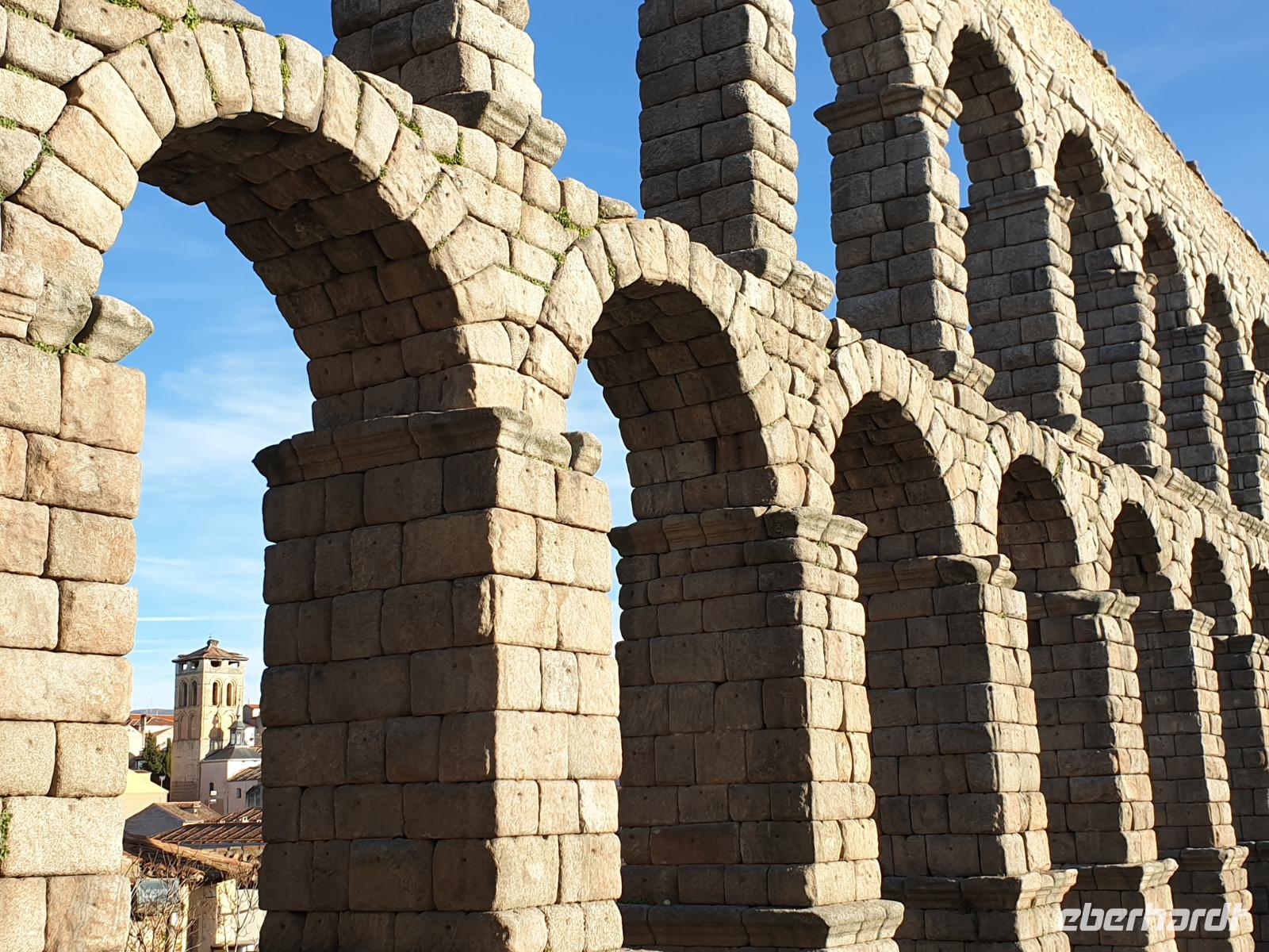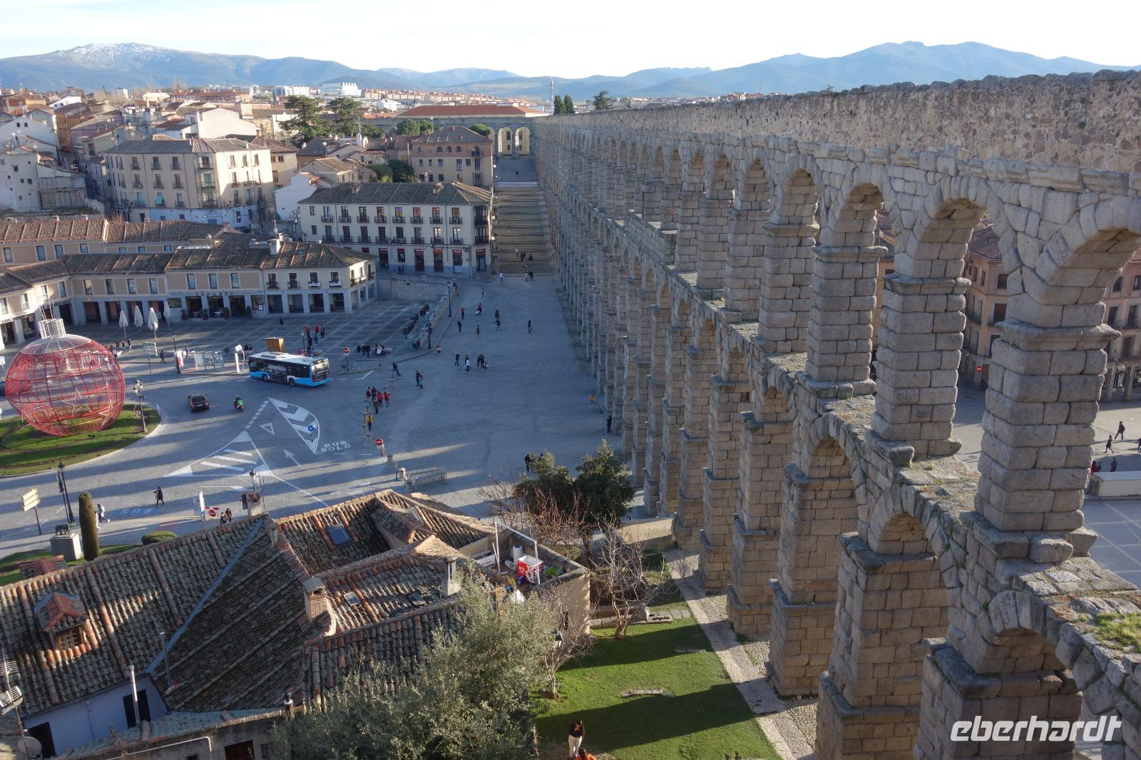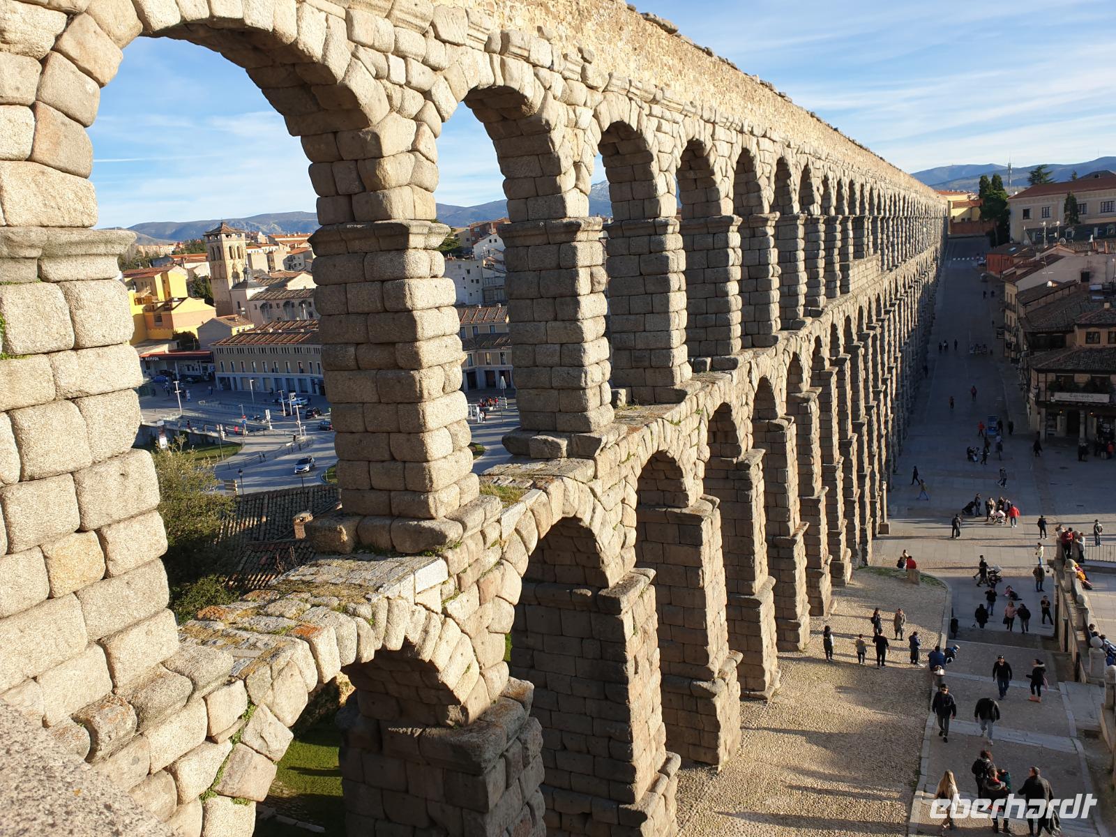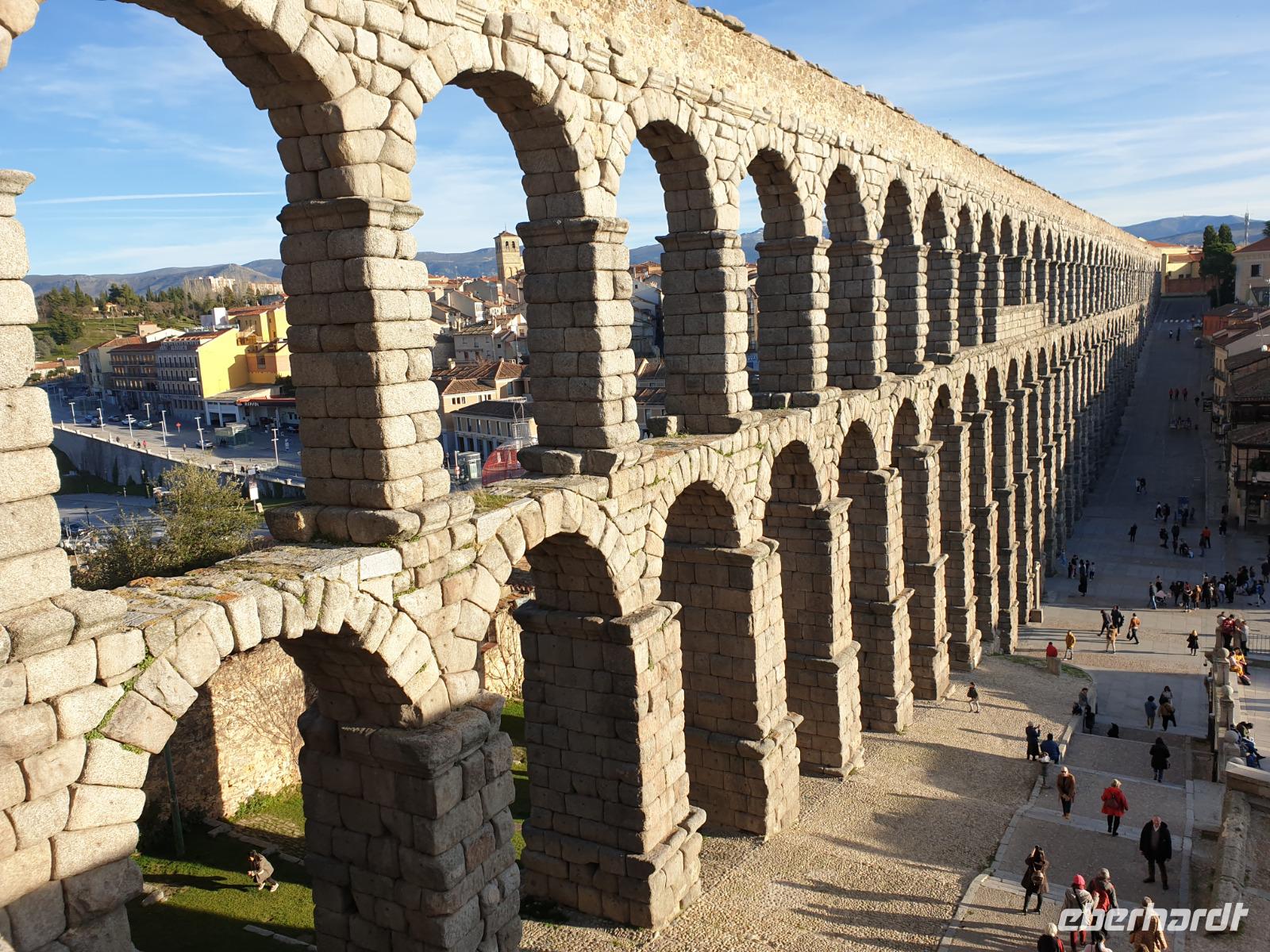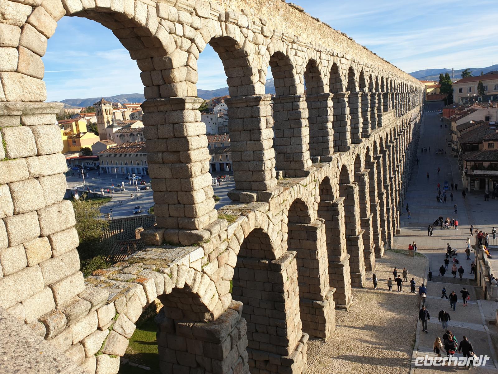 Die ersten Stunden des Vormittags des Neujahrs standen uns zur freien Verfügung. Nach einem späten Frühstück war Segovia das Ziel unseres halbtägigen Ausfluges. Erster Stopp waren die Berge. Wir fuhren über die Berge und über den „Puerto de Navacerrada" Pass in National Park Guadarrama weiter in die Stadt Segovia, die insbesondere für ihre zahlreichen Kirchen aus romanischer Zeit berühmt geworden ist. Oben am Puerto de Navacerrada steigen wir von Bus aus und könnten mit Seilbahn hoch auf die Bola del Mundo Gipfel fahren und über die Schnee bisschen laufen. Es war herrlich. Sonnig. Kein Wind. Man könnte sogar die 4 Türme Hochhäuser von Madrid über die Nebel sehen. Unvergesslich. Um 13 Uhr waren wir schon in Segovia. Als besonderer Höhepunkt gilt das über 28 Meter hohe antike römische Aquädukt. Majestätisch erhebt sich dieser eindrucksvolle Bau in mitten der Stadt und durchläuft diese auf 700 Meter Länge. Nach dem Stadtrundgang mit David hatten wir ab 14.30 genug Zeit zum Mittagessen, um die berühmte Spezialität „Cochinillo" (BabySchwein) zu essen obwohl nach dem großes Silvester Essen von gestern, hatten einige von uns noch keinen richtigen Hunger.