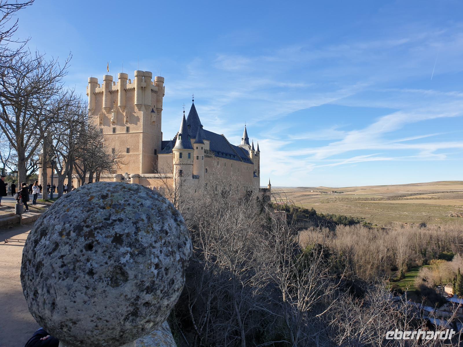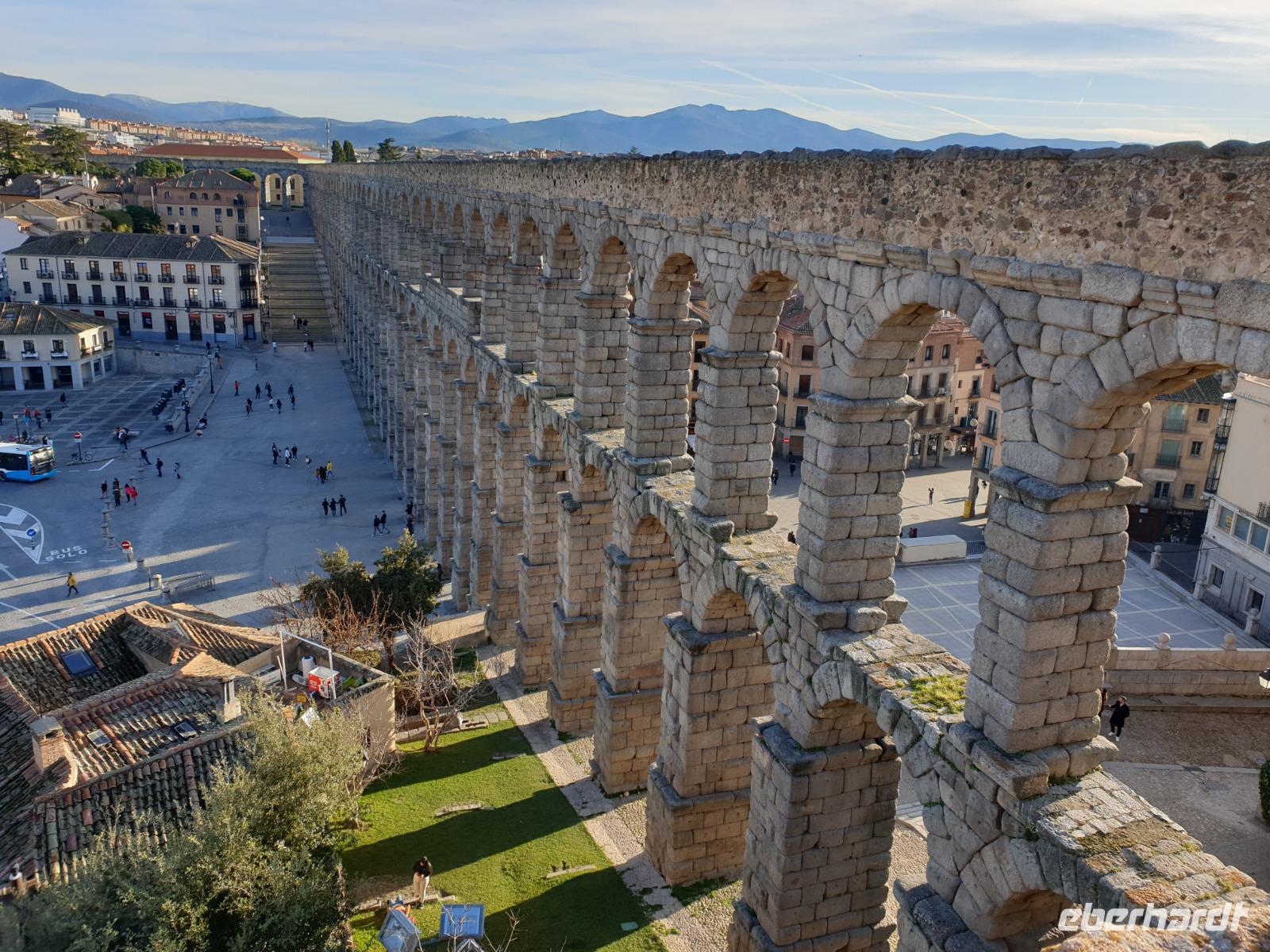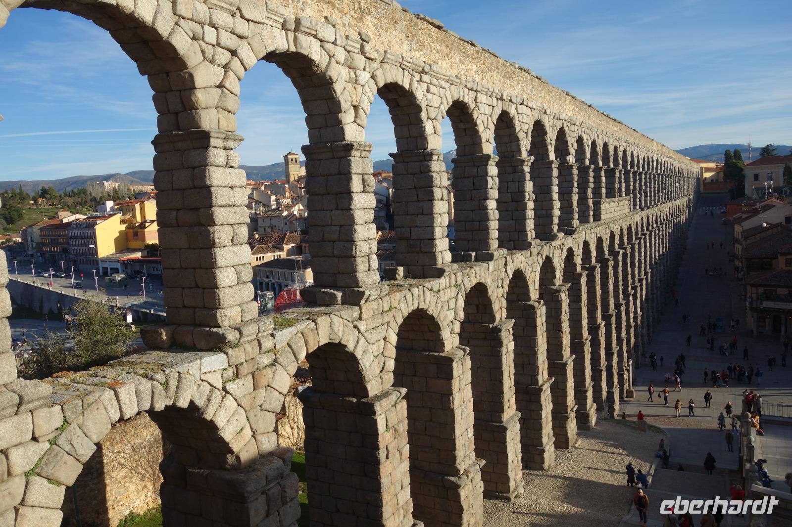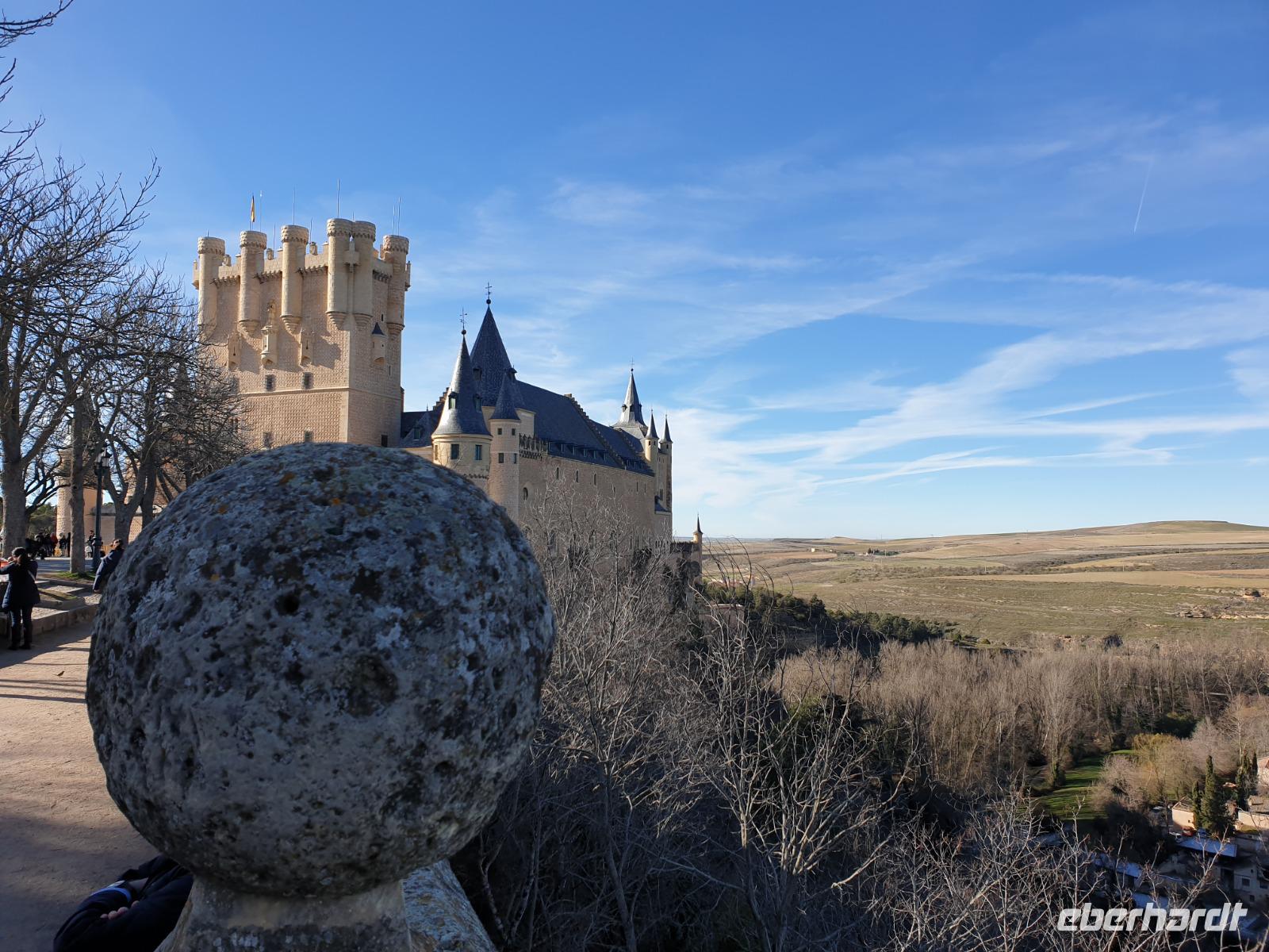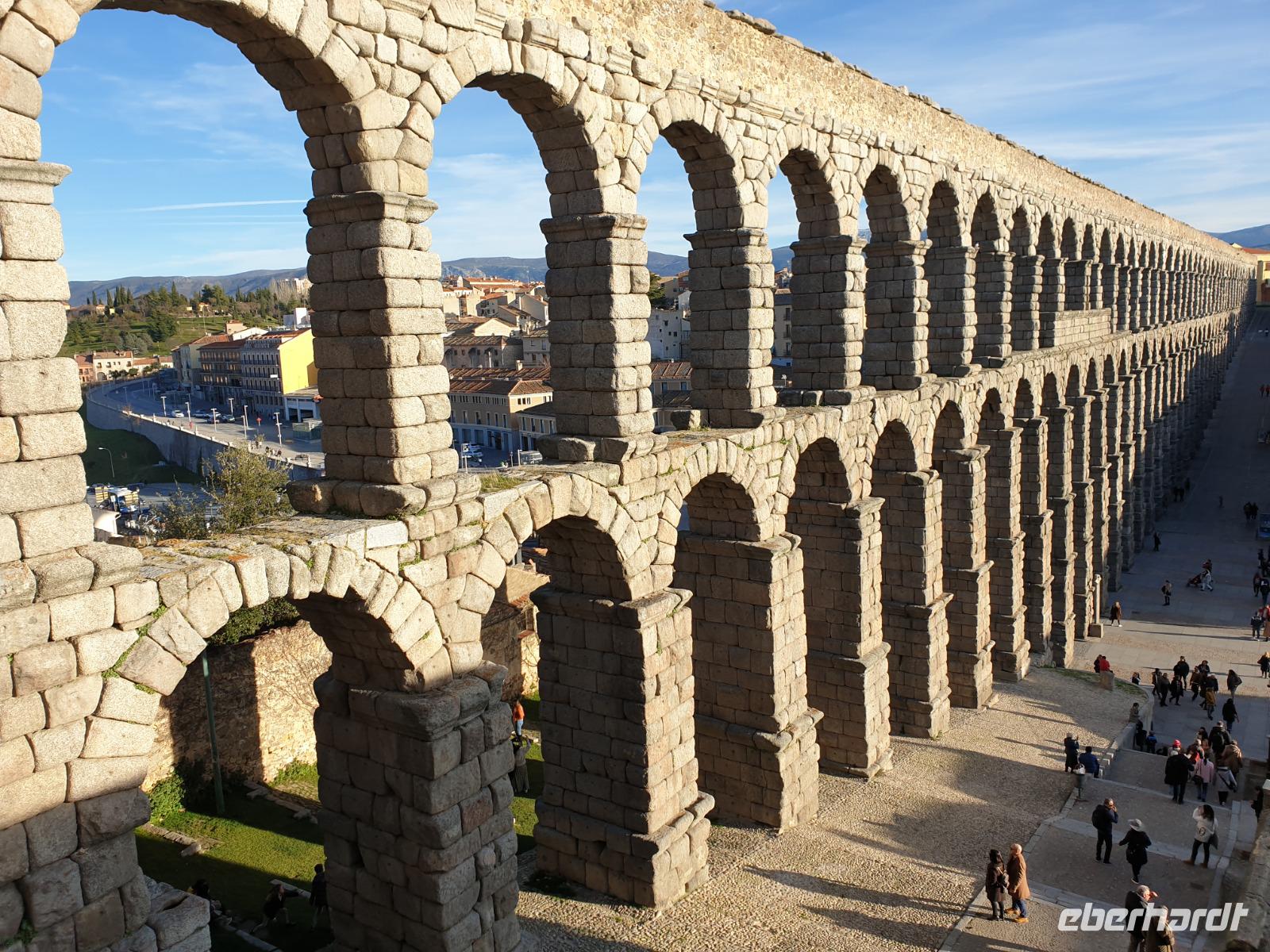 Die ersten Stunden des Vormittags des Neujahrs standen uns zur freien Verfügung. Nach einem späten Frühstück war Segovia das Ziel unseres halbtägigen Ausfluges. Erster Stopp waren die Berge. Wir fuhren über die Berge und über den „Puerto de Navacerrada" Pass in National Park Guadarrama weiter in die Stadt Segovia, die insbesondere für ihre zahlreichen Kirchen aus romanischer Zeit berühmt geworden ist. Oben am Puerto de Navacerrada steigen wir von Bus aus und könnten mit Seilbahn hoch auf die Bola del Mundo Gipfel fahren und über die Schnee bisschen laufen. Es war herrlich. Sonnig. Kein Wind. Man könnte sogar die 4 Türme Hochhäuser von Madrid über die Nebel sehen. Unvergesslich. Um 13 Uhr waren wir schon in Segovia. Als besonderer Höhepunkt gilt das über 28 Meter hohe antike römische Aquädukt. Majestätisch erhebt sich dieser eindrucksvolle Bau in mitten der Stadt und durchläuft diese auf 700 Meter Länge. Nach dem Stadtrundgang mit David hatten wir ab 14.30 genug Zeit zum Mittagessen, um die berühmte Spezialität „Cochinillo" (BabySchwein) zu essen obwohl nach dem großes Silvester Essen von gestern, hatten einige von uns noch keinen richtigen Hunger.