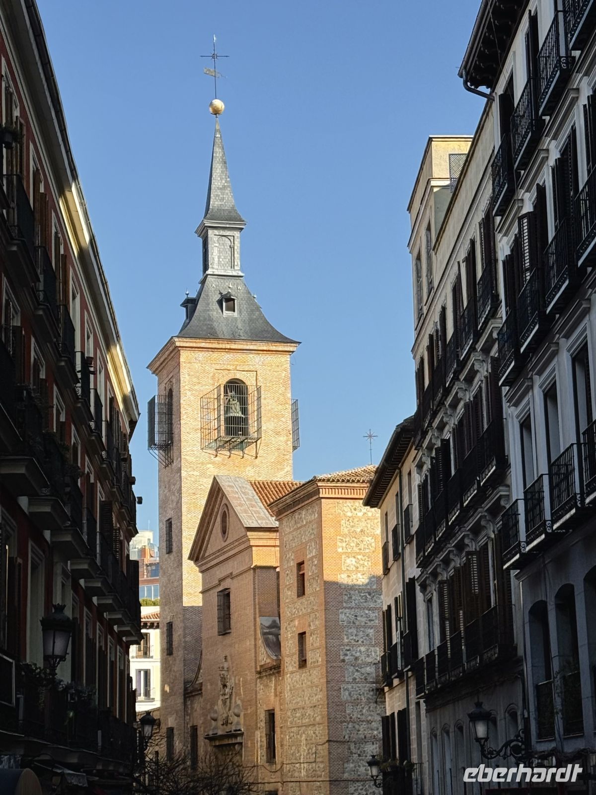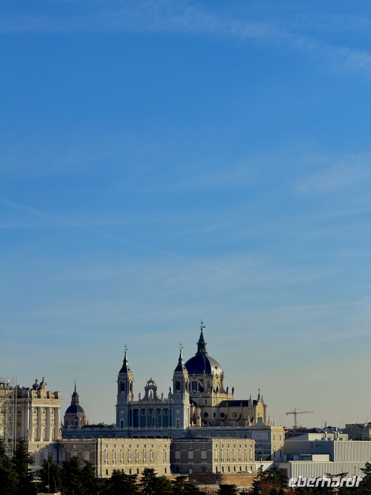 Wenn die Sonne am Vortag gestrahlt hatte, so schien sie an diesem Tag mit doppelter Kraft zu scheinen. Wir brachen morgens auf, bereit, uns die spanische Welt Stück für Stück einzuverleiben, wobei unser Ausgangspunkt das Barrio Latino in Madrid war. Obwohl die spanische Hauptstadt spektakuläre Straßen wie die Gran Vía hat, um nur eine zu nennen, gibt es ein Netz kleiner Gassen voller Geheimnisse, die uns auf unserem Weg offenbart wurden und alles miteinander verbanden. Unser Gang wurde dadurch überraschend, denn plötzlich gelangten wir von einem bekannten Ort zum anderen, ohne eine der populären Straßen benutzt zu haben. Oder nach langem Gehen und dem Gefühl, an einem abgelegenen Ort der Stadt zu sein, tauchten wir fast wie durch Zauberhand nicht weit von einem Ausgangspunkt entfernt wieder auf. Wir bewunderten das Schöne, Imposante und Bekannte der Stadt neben dem Diskreten und für den gewöhnlichen Sterblichen fast Verborgenen, das nicht ohne Schönheit, aber ohne Passanten war, was der Erfahrung noch ein paar Punkte mehr hinzufügte, wie den Besuch des Königspalastes. Der frühe Nachmittag stand zur freien Verfügung. Doch die noch Landschaftshungrigen, denen noch nicht zu viele Kilometer in den Füßen steckten, begleiteten mich zu einem letzten Blick auf den Palast vom Templo de Debod aus.