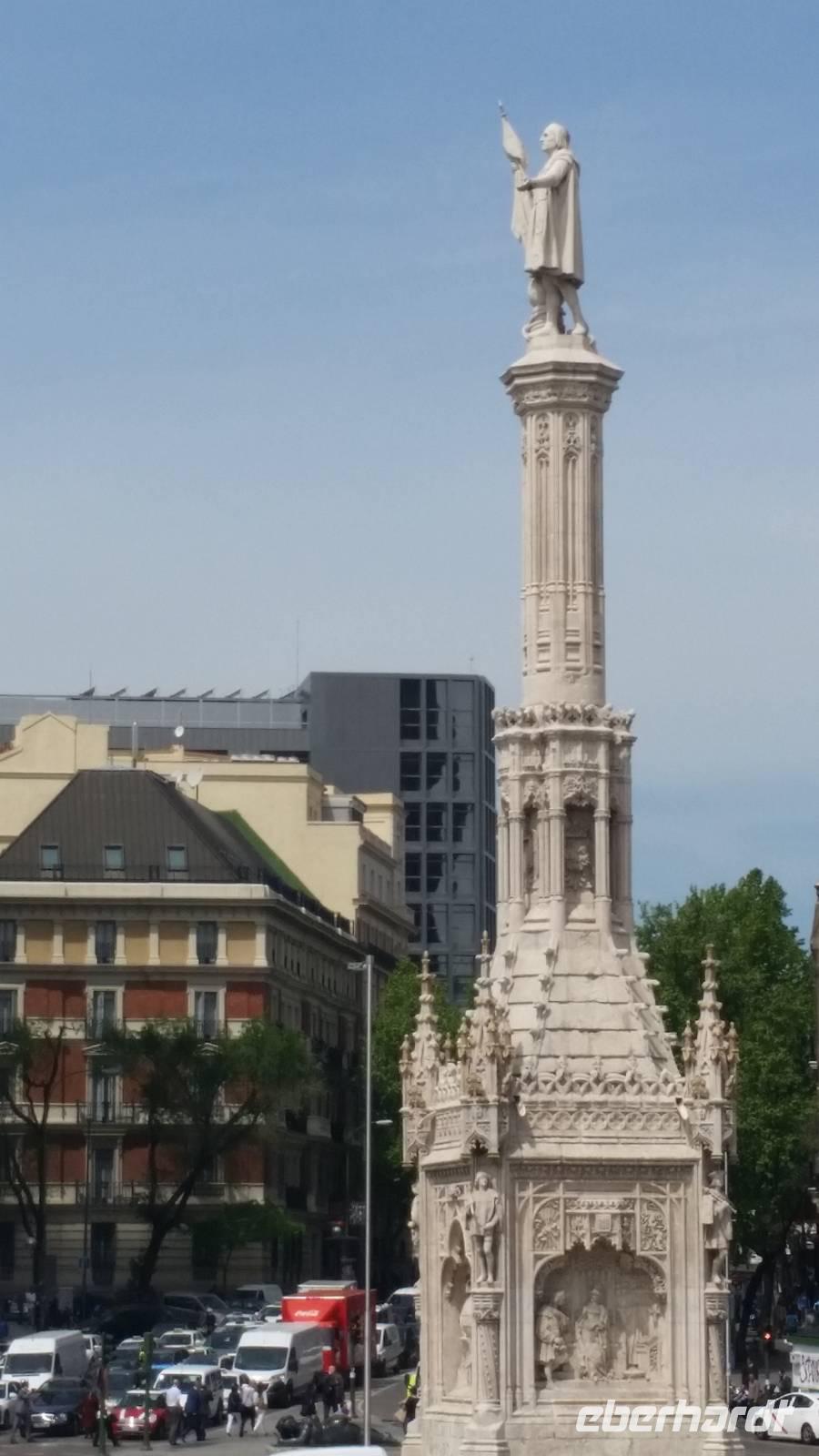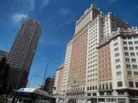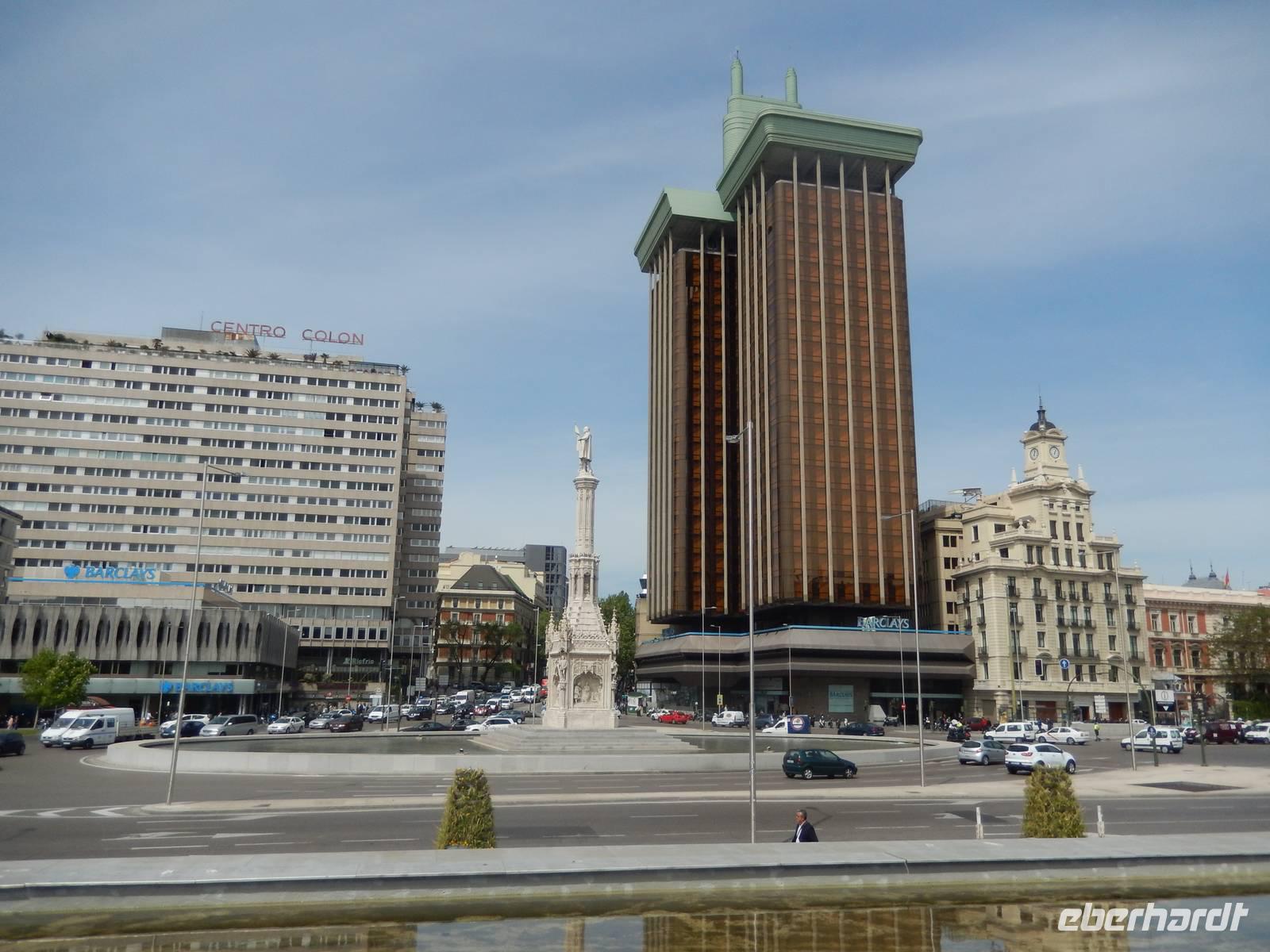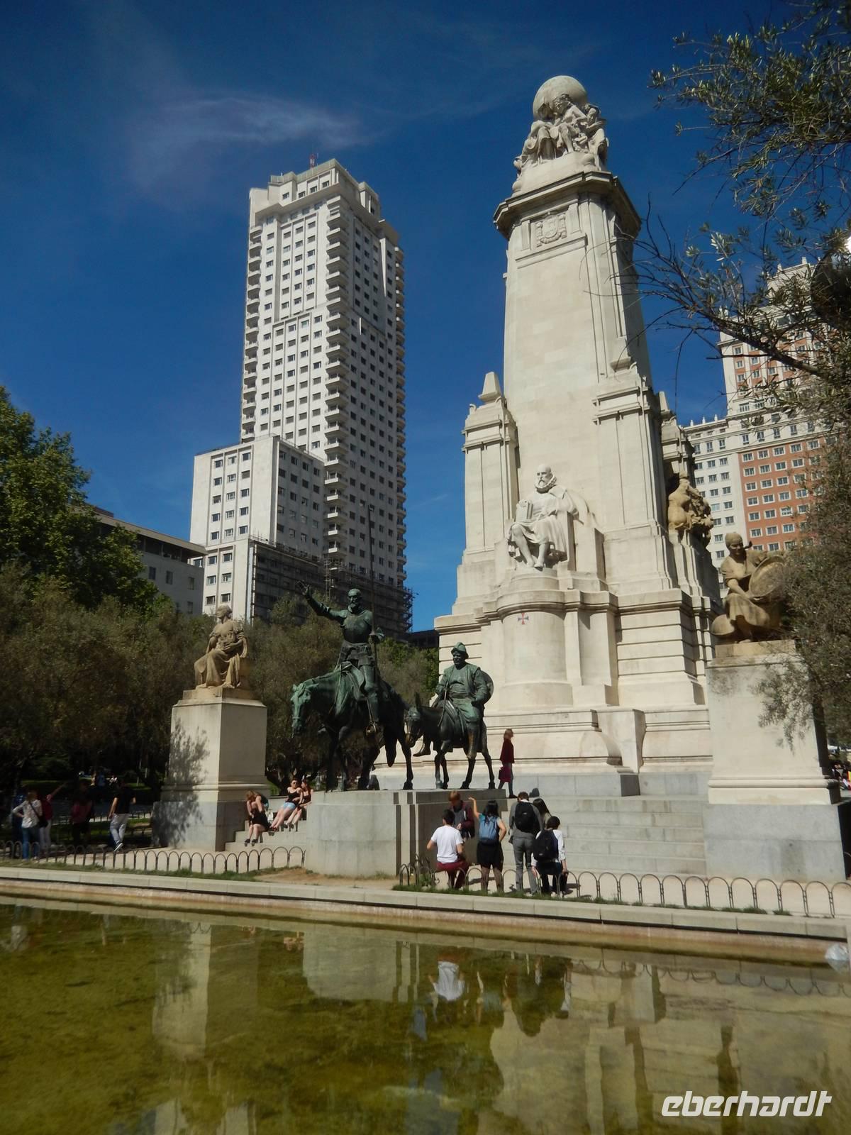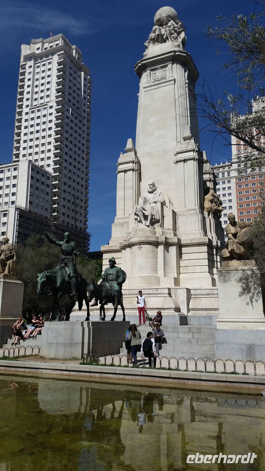 Um erst einmal ein bisschen Orientierung in meiner Heimatstadt zu gewinnen, starteten wir zu einer kleiner Panorama-Stadtrundfahrt auf dem Weg vom Flughafen zum Hotel. Die Fahrt führte uns über die 4 Torres oder Hochhäuser von Madrid, wo wir aussteigen und die gute Frühlingluft genießen konnten. Auf dem Weg fuhren wir auch an dem Columbus Platz vorbei, wo sich die größte spanische Flagge befindet. Wir fuhren über  die ganze Paseo Castellana-Allee mit dem Real Madrid Fussball Stadium und weiter über Puerta de Alcala, und Plaza de Cibeles. Wir lassen uns die Besichtigung der Stierkampfarena für die nächsten Tage. Kurze Zeit später checkten wir in unserem, im Herzen von Madrid gelegenen, 4-Sterne-Hotel Senator Gran Via 70 ein. Nun blieb Zeit, um sich frisch zu machen oder sich bei einem kleinen Nickerchen zu erholen, denn einige von uns waren am Morgen schon kurz nach Mitternacht abgeholt wurden. Um 16:15 Uhr trafen wir uns an der Rezeption vom Hotel. Nun hatten wir die Gelegenheit, erste Eindrücke dieser wunderbar pulsierenden Metropole zu gewinnen und die Umgebung unseres Hotels im Zentrum der Stadt zu erkunden. Gemeinsam unternahmen wir zu Fuß einen Stadtrundgang. Zunächst ging es auf die Plaza de España, wo sich das Denkmal von dem berühmter Schriftsteller Cervantes befindet.