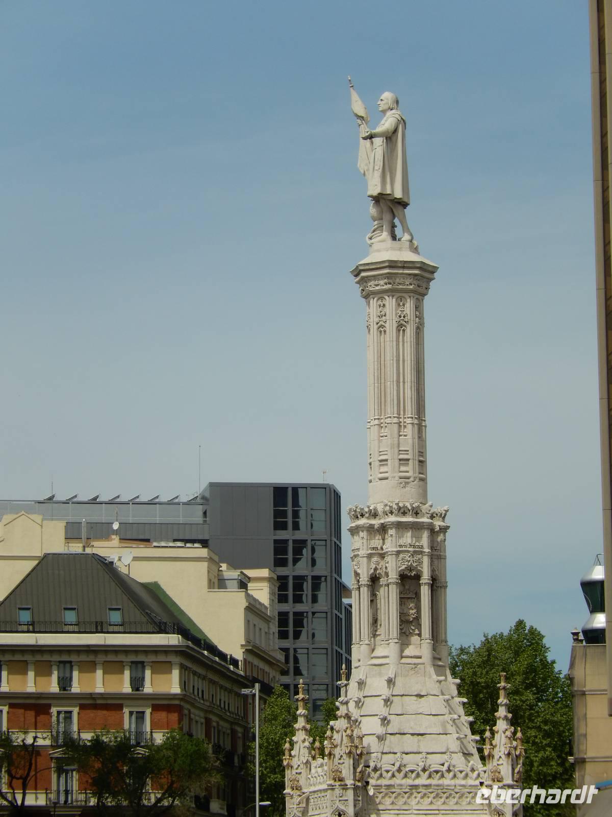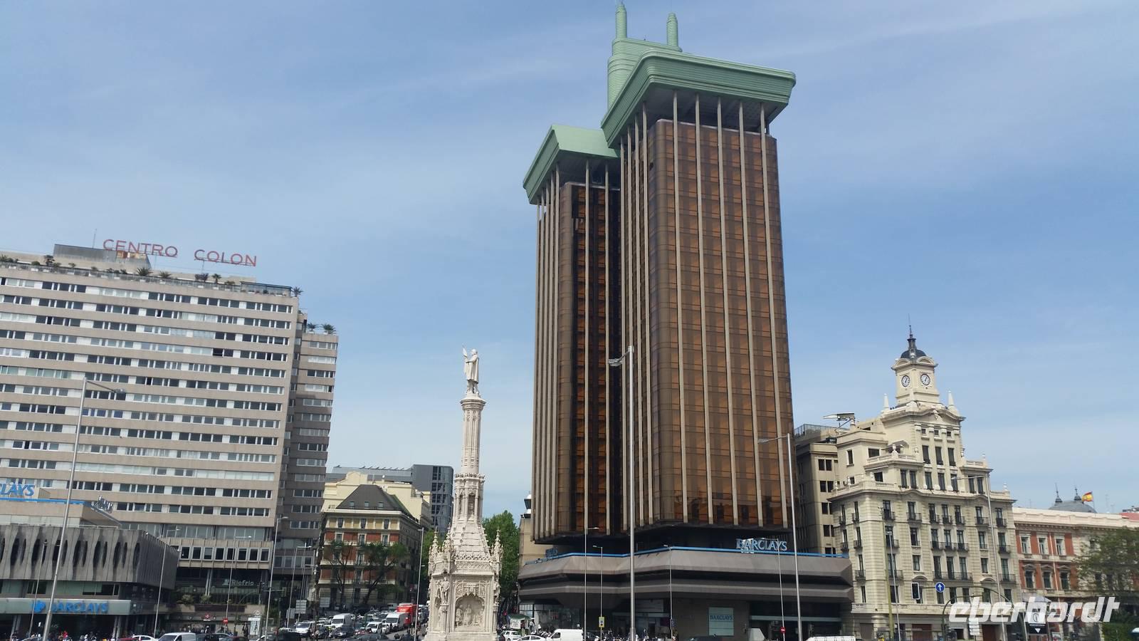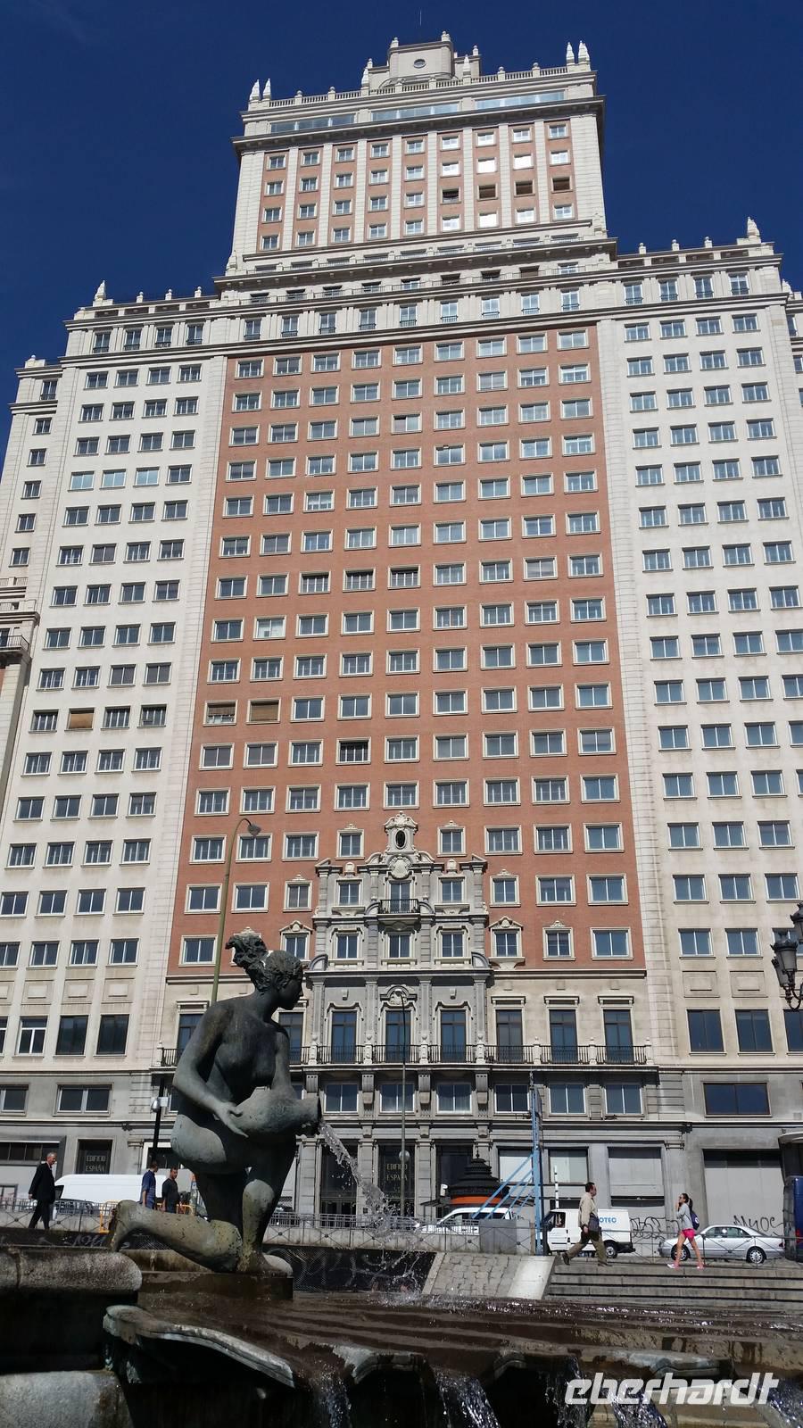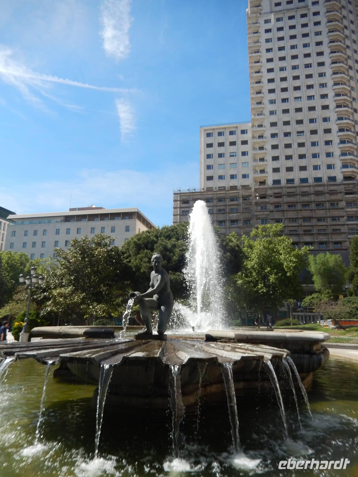 Um erst einmal ein bisschen Orientierung in meiner Heimatstadt zu gewinnen, starteten wir zu einer kleiner Panorama-Stadtrundfahrt auf dem Weg vom Flughafen zum Hotel. Die Fahrt führte uns über die 4 Torres oder Hochhäuser von Madrid, wo wir aussteigen und die gute Frühlingluft genießen konnten. Auf dem Weg fuhren wir auch an dem Columbus Platz vorbei, wo sich die größte spanische Flagge befindet. Wir fuhren über  die ganze Paseo Castellana-Allee mit dem Real Madrid Fussball Stadium und weiter über Puerta de Alcala, und Plaza de Cibeles. Wir lassen uns die Besichtigung der Stierkampfarena für die nächsten Tage. Kurze Zeit später checkten wir in unserem, im Herzen von Madrid gelegenen, 4-Sterne-Hotel Senator Gran Via 70 ein. Nun blieb Zeit, um sich frisch zu machen oder sich bei einem kleinen Nickerchen zu erholen, denn einige von uns waren am Morgen schon kurz nach Mitternacht abgeholt wurden. Um 16:15 Uhr trafen wir uns an der Rezeption vom Hotel. Nun hatten wir die Gelegenheit, erste Eindrücke dieser wunderbar pulsierenden Metropole zu gewinnen und die Umgebung unseres Hotels im Zentrum der Stadt zu erkunden. Gemeinsam unternahmen wir zu Fuß einen Stadtrundgang. Zunächst ging es auf die Plaza de España, wo sich das Denkmal von dem berühmter Schriftsteller Cervantes befindet.