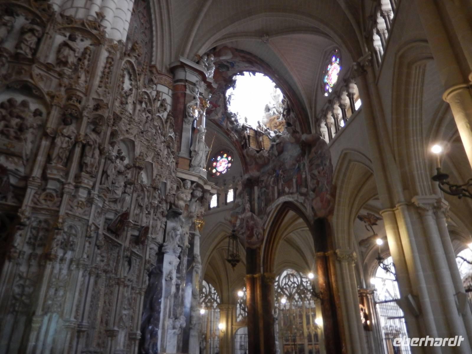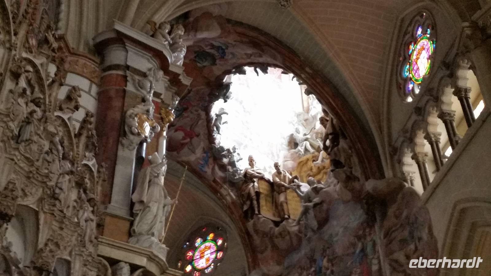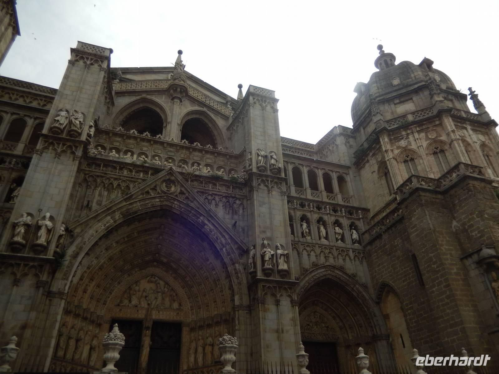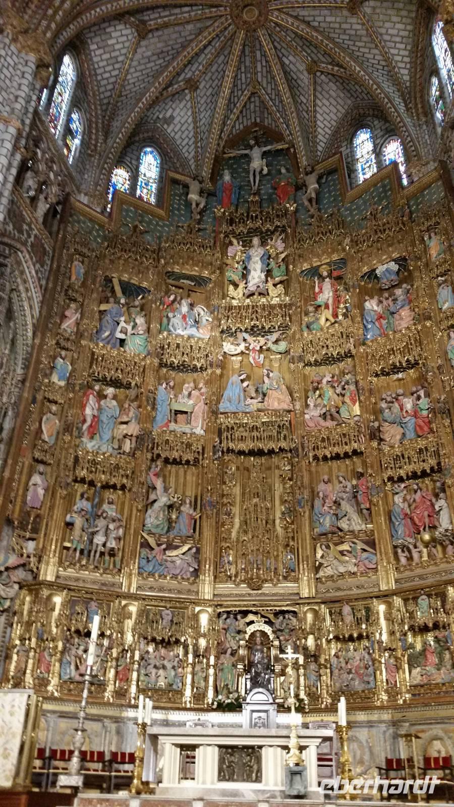 Eines der Wahrzeichen der Stadt, den Arco de la Sangre, lernten wir später bei einer Stadtführung kennen. Der aus Cervantes "Don Quijote" bekannte Bogen mit dem dahinter liegenden Alcazar (Palast) ist ein traumhaftes Fotomotiv. Wir fingen hier bei dem Zocodover Platz an und spazierten gemeinsam durch die Straßen von Toledo. Zuerst besuchten wir die imposante Kathedrale. Dieser Dom hat 2 Türme, aber einer war nicht zu Ende gebaut worden, da dann das Geld gefehlt hatte. Von innen erinnerte uns dieser Dom an den von Sevilla oder Malaga. Später besuchten wir das berühmte Gemälde von El Greco „Das Begräbnis von dem Graf Orgaz" und machten eine kleine Mittagspause zum Essen mit einem leckeren Menü. Weiter ging zu der jüdische Synagoge „Santa Maria La Blanca". Toledo ist ein einziges und gutes Beispiel wie damals Christen, Juden und Muslime in Friede zusammenleben konnten.