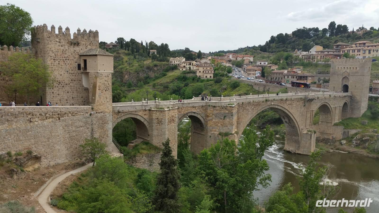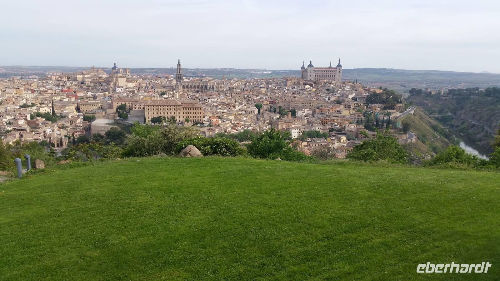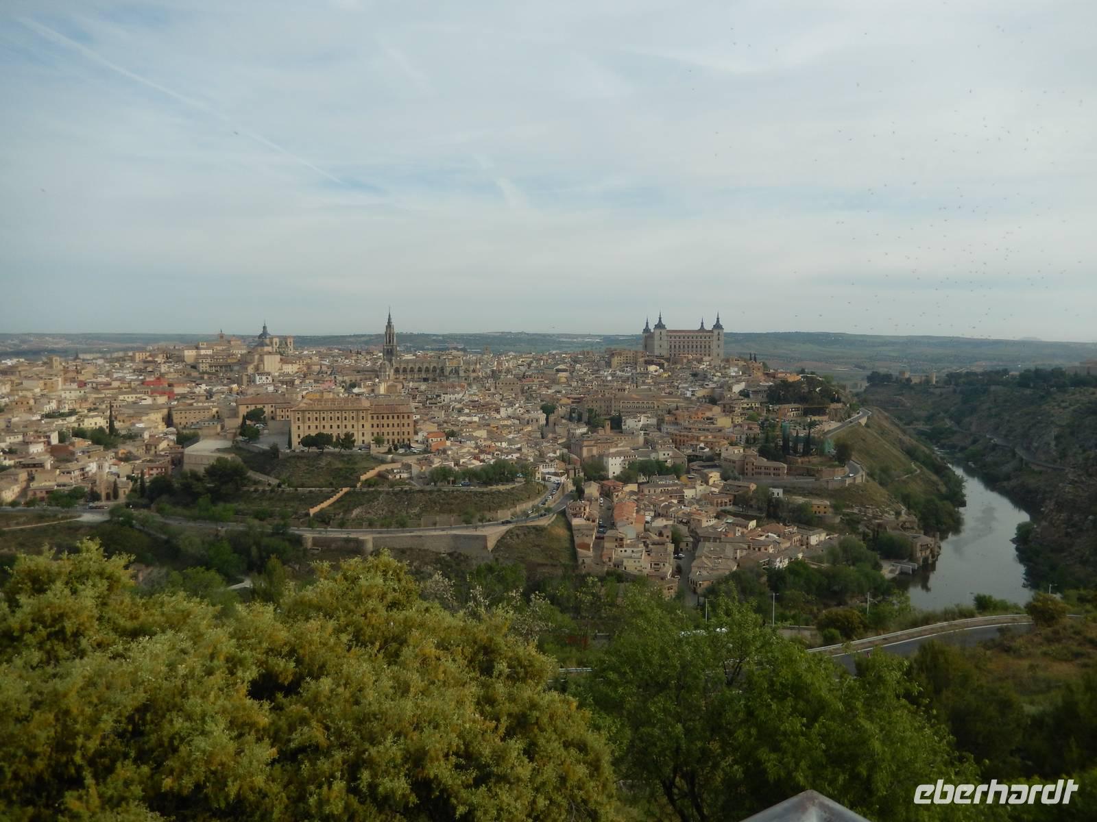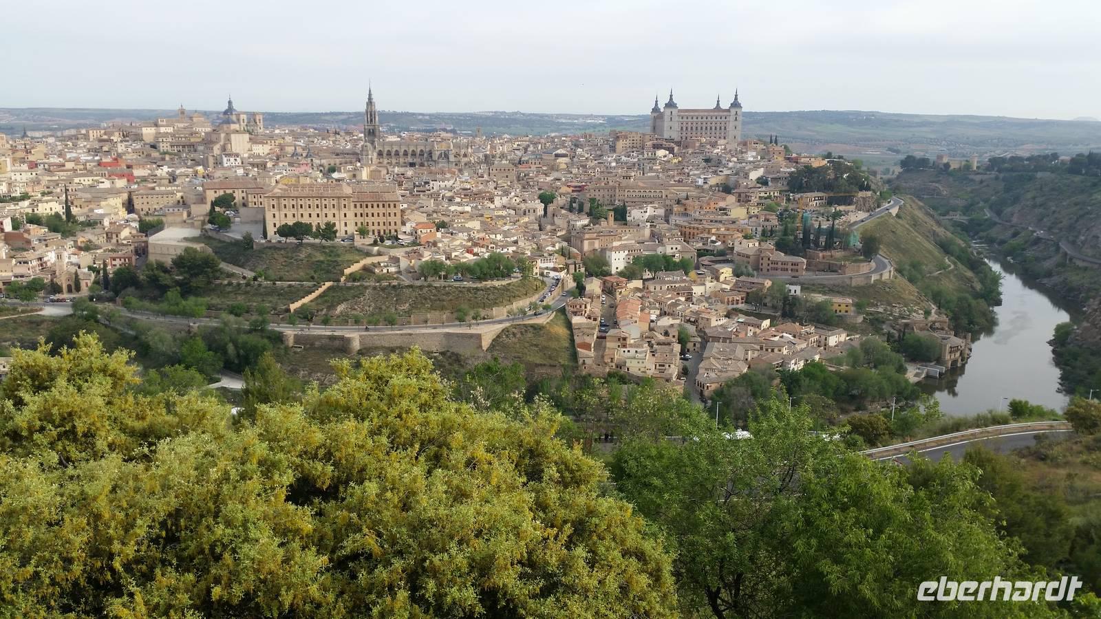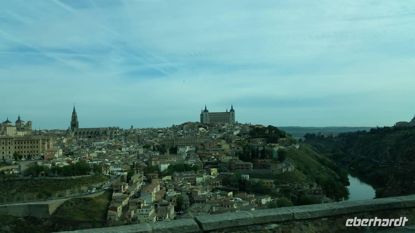 Heute fuhren wir zur eindrucksvollen Stadt Toledo, weniger als 1 Stunde entfernt von Madrid. Wir hatten einen sehr guten Reiseleiter namens Juanjo, der uns seine Heimat zeigte. Diese prächtige historische Metropole thront hoch über dem Ufer des Tajo, der sich an dieser Stelle tief in das Hochland eingeschnitten hat. Um diesen Blick genauso zu haben, fuhren wir erstmal außerhalb Toledos zu der berühmten Parador Nacional Hotel Terrasse, wo wir den besten Panorama Blick genießen konnten.
