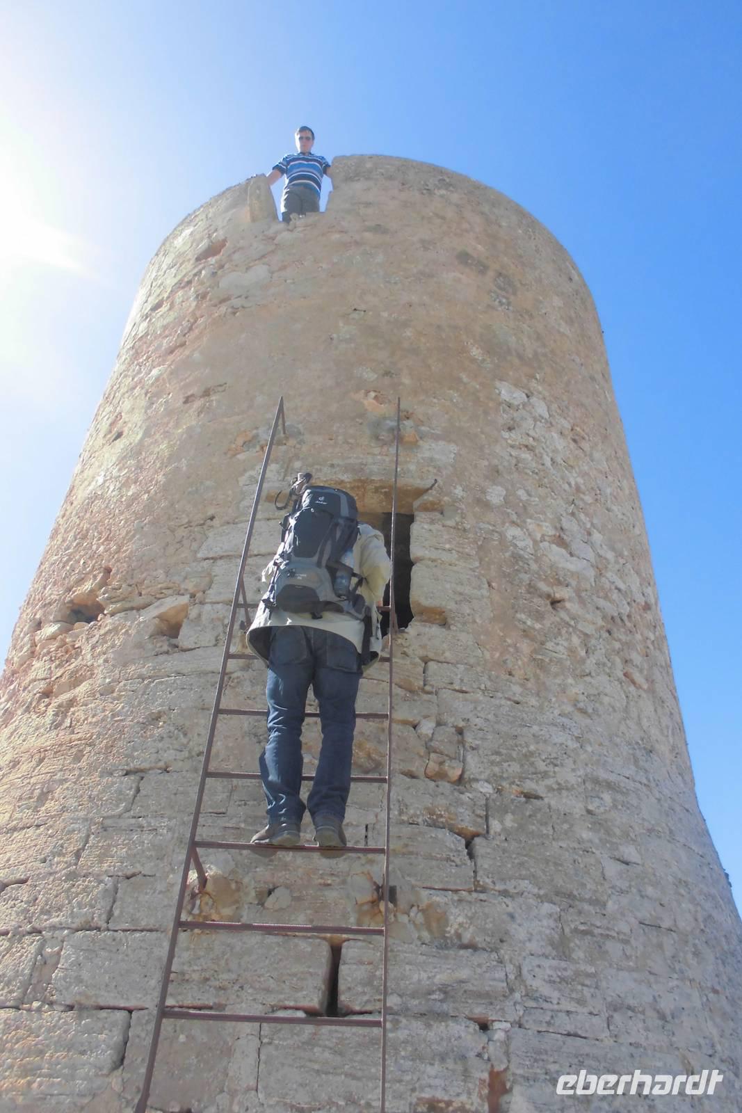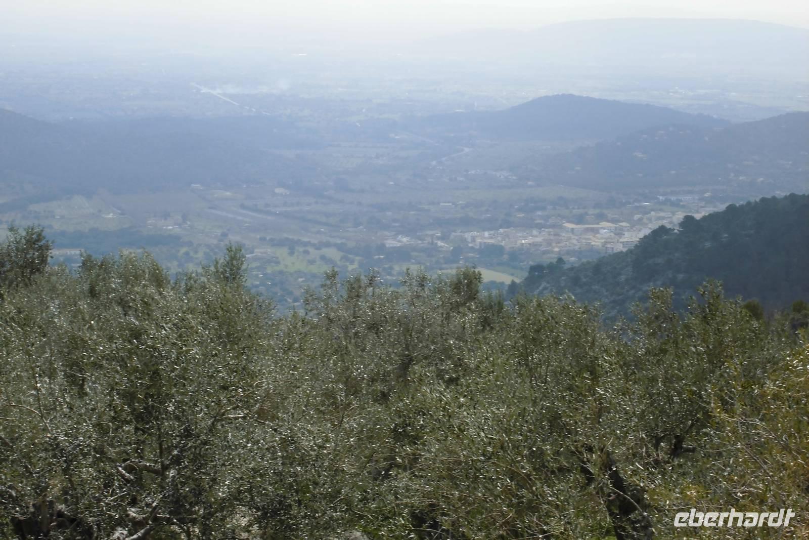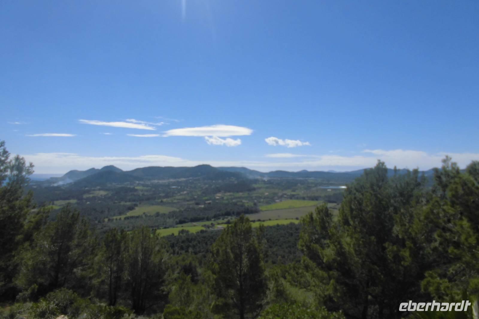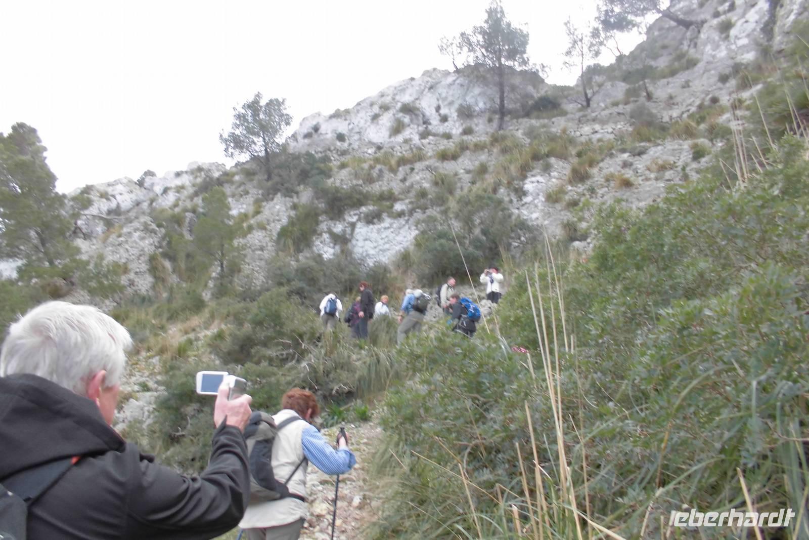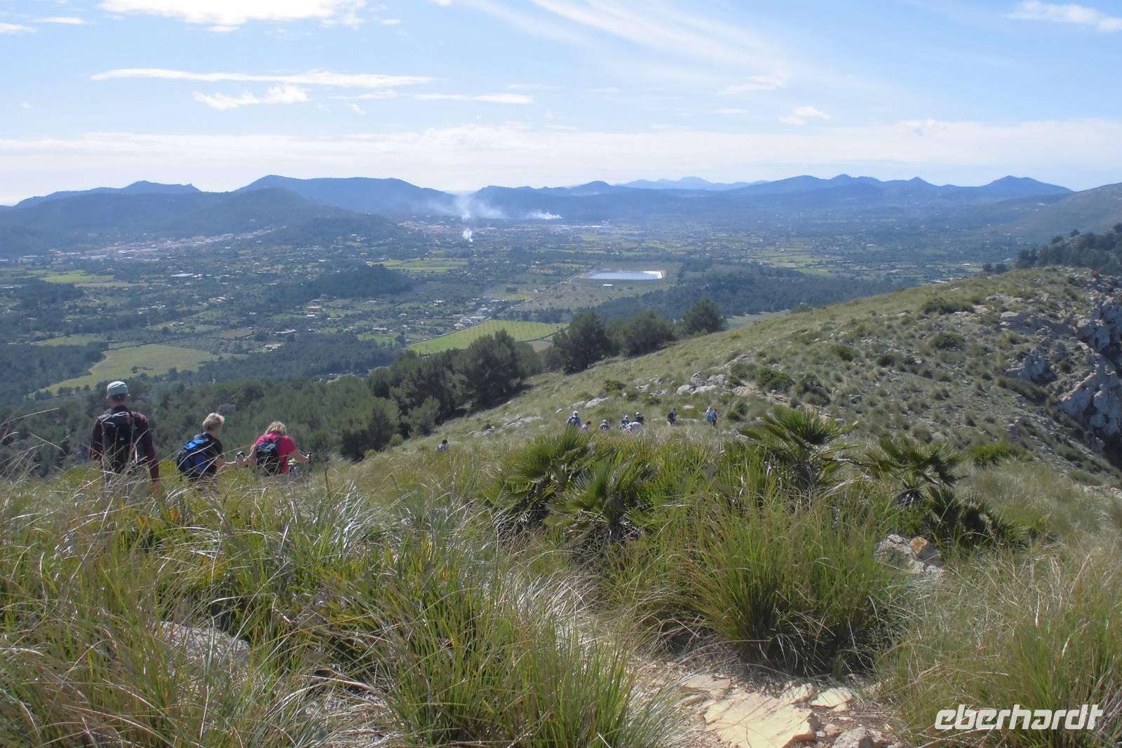 Nach einem reichhaltigen Frühstück treffen wir uns vor dem Hotel, begrüßt von strahlendem Sonnenschein und einer nicht weniger strahlenden Isabel. Nach kurzem Kampf mit Karte und Wind legt Isabel die Karte, befestigt von 4 Orangen, auf die Wiese und zeigt uns unsere heutige Wanderroute. Nachdem jeder noch mit Wasser und Orangen (aus Isabels Garten) versorgt wird, starten wir mit dem Bus zu unserer ersten Wanderung. Busfahrer José fährt uns über Palma und Alaró ins Tal von Orient. Der Startpunkt befindet sich an einem terassenförmig angelegten Olivenhain. Um auf den Wanderweg zu gelangen, müssen wir erstmal über einen Zaun klettern, bis Günther (Isabel: „ Natürlich eine Mann!") auf die Idee kommt, doch einfach das große Tor zu öffnen und hindurch zu gehen - der erste Spaß des Tages ;-) . Vorbei an Schafen, die uns gar nicht wahrzunehmen scheinen, queren wir den Olivenhain, Isabel erzählt viel über Anbau und Verarbeitung der kleinen Früchte. Nach 10 Minuten Weg beginnt der Anstieg. 350 Höhenmeter warten darauf, von uns bewältigt zu werden. Mit ruhigem Tempo bewältigen wir Meter um Meter, Stein um Stein. Die Wanderung führt uns durch typisch mallorquinische Bergvegetation, vorbei an flachen Sträuchern und alten Steineichen. Der gesamte Weg ist durch den oftmals steinigen Untergrund recht rutschig, sodass hier hohe Konzentration und Trittsicherheit gefordert ist. Kurve um Kurve steigen wir die Serpentinen, welche sich am Hang entlang schlängeln, hinauf. Nach einer guten Stunde machen wir an einer großen Lichtung Pause. Am Waldparkplatz Es Pouet scheint uns endlich wieder die Sonne ins Gesicht und wir genießen den wunderschönen Ausblick in die Ebene der Insel, schließlich befinden uns auf über 700 Meter Höhe in der Sierra de Tramuntana. Bei wem es die Kondition erlaubt, der steigt weiter auf zum Castell d'Alaró, unserem heutigen Tagesziel. Der Weg wird wieder etwas steiler und nachdem wir das Eingangstor passiert haben, sehen wir auch schon den ersten Turm der Burg. Mittlerweile sind wir auf über 820 Metern gestiegen und werden mit einem einmaligen Ausblick belohnt.