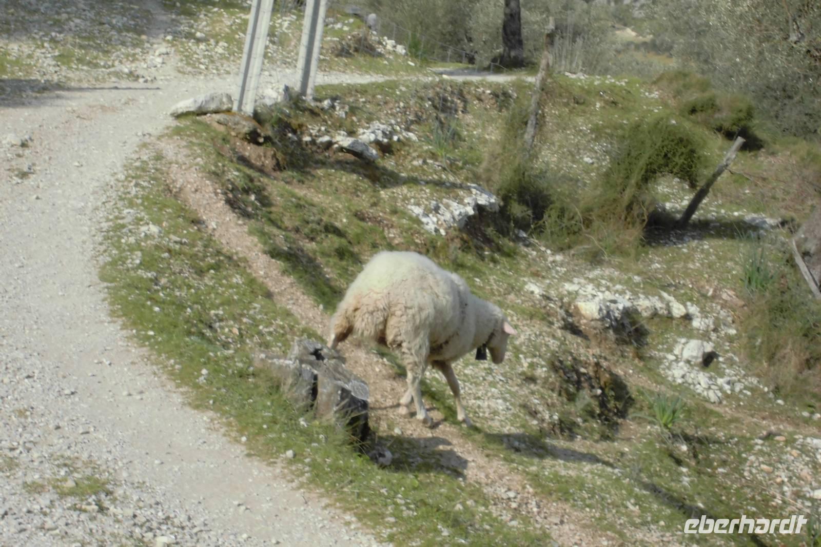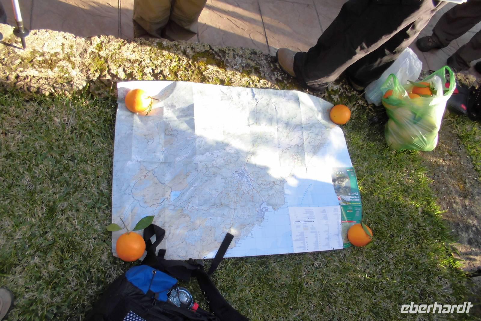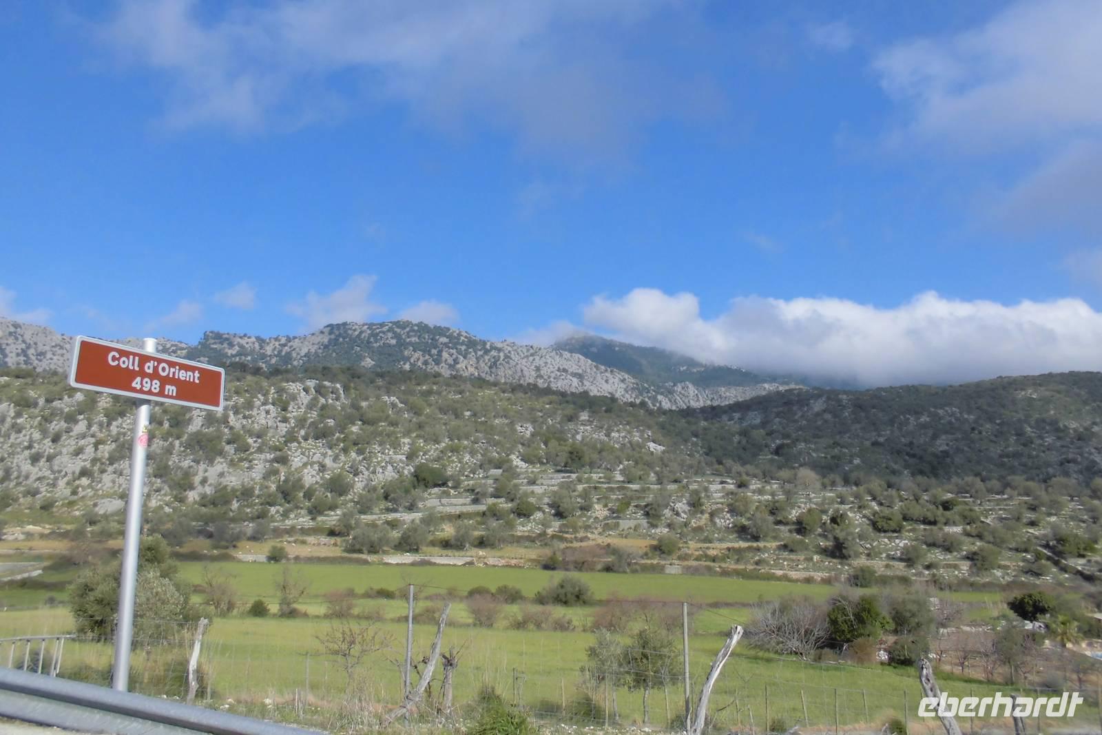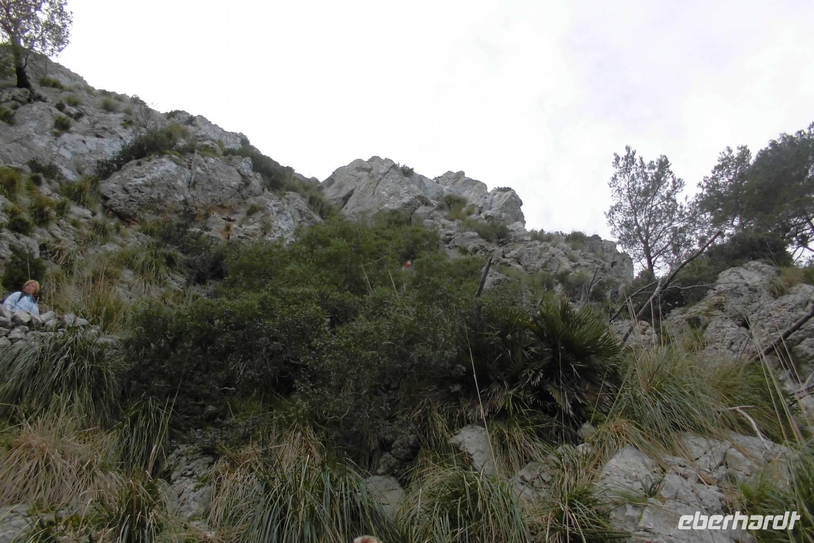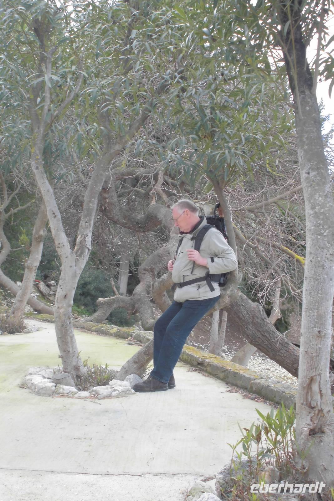 Nach einem reichhaltigen Frühstück treffen wir uns vor dem Hotel, begrüßt von strahlendem Sonnenschein und einer nicht weniger strahlenden Isabel. Nach kurzem Kampf mit Karte und Wind legt Isabel die Karte, befestigt von 4 Orangen, auf die Wiese und zeigt uns unsere heutige Wanderroute. Nachdem jeder noch mit Wasser und Orangen (aus Isabels Garten) versorgt wird, starten wir mit dem Bus zu unserer ersten Wanderung. Busfahrer José fährt uns über Palma und Alaró ins Tal von Orient. Der Startpunkt befindet sich an einem terassenförmig angelegten Olivenhain. Um auf den Wanderweg zu gelangen, müssen wir erstmal über einen Zaun klettern, bis Günther (Isabel: „ Natürlich eine Mann!") auf die Idee kommt, doch einfach das große Tor zu öffnen und hindurch zu gehen - der erste Spaß des Tages ;-) . Vorbei an Schafen, die uns gar nicht wahrzunehmen scheinen, queren wir den Olivenhain, Isabel erzählt viel über Anbau und Verarbeitung der kleinen Früchte. Nach 10 Minuten Weg beginnt der Anstieg. 350 Höhenmeter warten darauf, von uns bewältigt zu werden. Mit ruhigem Tempo bewältigen wir Meter um Meter, Stein um Stein. Die Wanderung führt uns durch typisch mallorquinische Bergvegetation, vorbei an flachen Sträuchern und alten Steineichen. Der gesamte Weg ist durch den oftmals steinigen Untergrund recht rutschig, sodass hier hohe Konzentration und Trittsicherheit gefordert ist. Kurve um Kurve steigen wir die Serpentinen, welche sich am Hang entlang schlängeln, hinauf. Nach einer guten Stunde machen wir an einer großen Lichtung Pause. Am Waldparkplatz Es Pouet scheint uns endlich wieder die Sonne ins Gesicht und wir genießen den wunderschönen Ausblick in die Ebene der Insel, schließlich befinden uns auf über 700 Meter Höhe in der Sierra de Tramuntana. Bei wem es die Kondition erlaubt, der steigt weiter auf zum Castell d'Alaró, unserem heutigen Tagesziel. Der Weg wird wieder etwas steiler und nachdem wir das Eingangstor passiert haben, sehen wir auch schon den ersten Turm der Burg. Mittlerweile sind wir auf über 820 Metern gestiegen und werden mit einem einmaligen Ausblick belohnt.