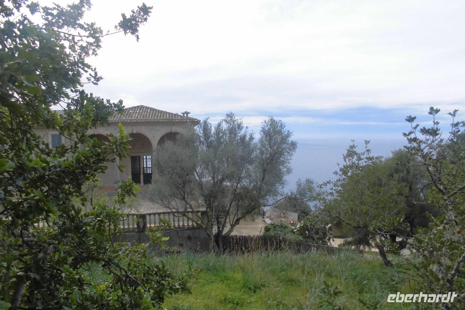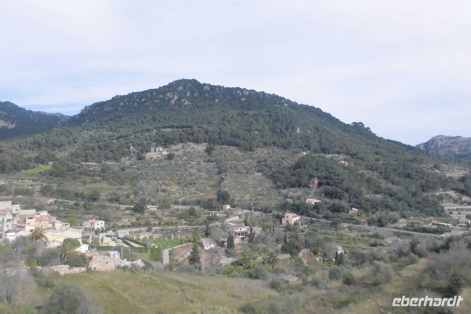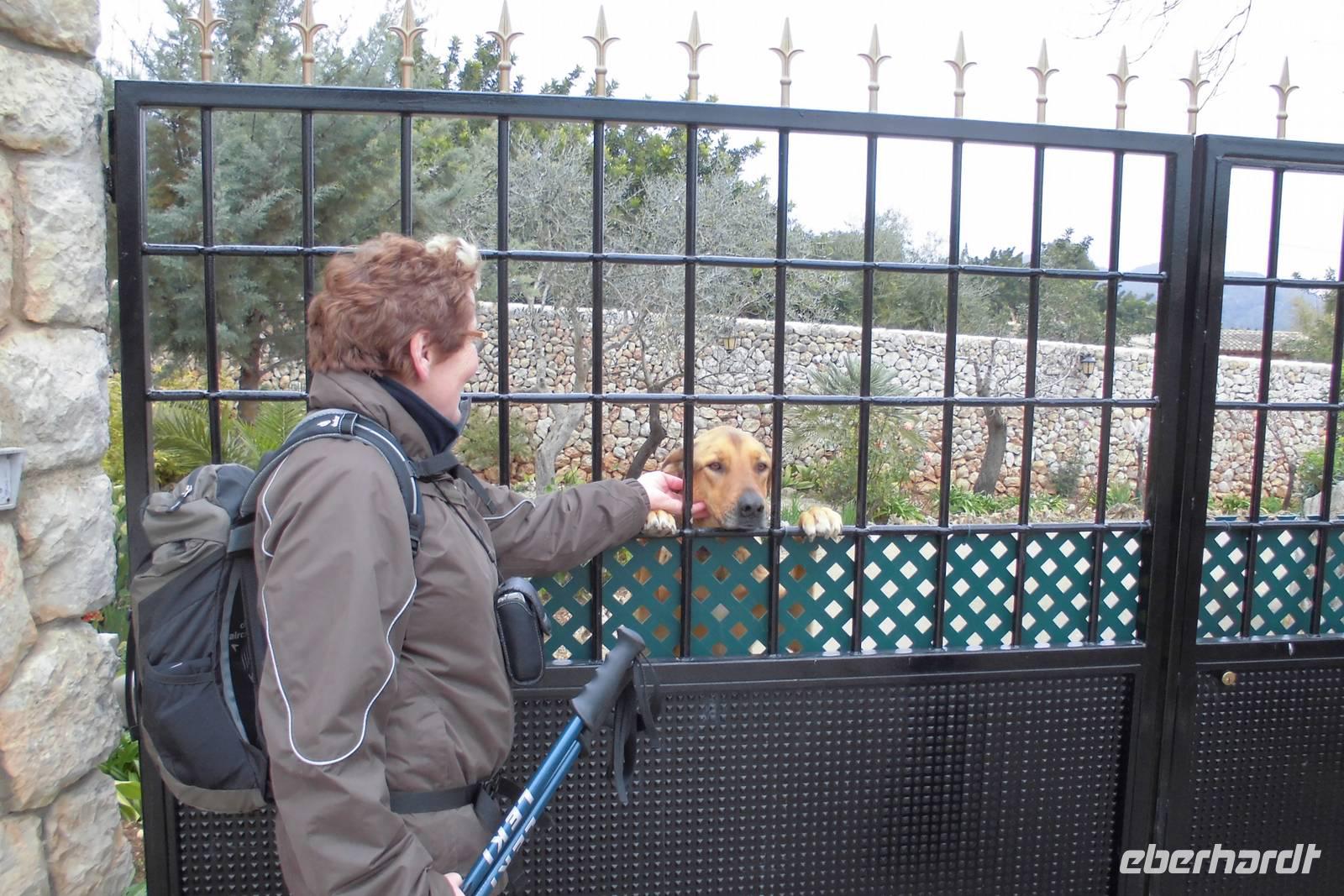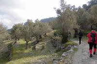 Der Abstieg gestaltet sich nun einfacher. Wir folgen einer alten, staubigen Straße, treffen jetzt immer häufiger weitere Wanderer. Auf halber Strecke wartet nun ein weiteres Highlight auf uns - die Finca „Es Verger". Der alte Bergbauernhof beherbergt ein kleines Restaurant, in welchem wir nach langem Weg einkehren. Die Tische sind schon vorbereitet, auf uns wartet Wein und Wasser. Bei einer kleinen Vorstellungsrunde, lernen wir uns alle etwas besser kennen, nicht nur, dass der Name „Peter" offensichtlich kein Alleinstellungsmerkmal in unserer Gruppe ist, sondern auch, dass wir Gewinner des Radiogewinnspiels in unserer Runde hatten! Nach diesem kurzweiligen Intermezzo wird dann auch schon das Mittagessen serviert - Lammkeule mit Rosmarinkartoffeln, kurz gesagt: ein Gedicht! Dementsprechend etwas schwerfälliger machten wir uns dann auf die letzte Tagesetappe. Wir folgen weiter der staubigen Straße, welche sich auf der anderen Seite des Puig d'Alaró hinab schlängelt. Wir nähern uns wieder der Zivilisation, luken hier und da durch die hohen Tore in die Höfe der Anwesen. Isabel macht immermal einen kurzen Halt und erzählt über das Leben der hier wohnenden Mallorquiner. Als wir eine Landstraße erreichen, ist klar, dass diese erste Wanderung nun schon fast zu Ende ist. Hinter eine Kurve wartet dann auch schon José auf uns, um uns zurück nach Paguera zu bringen.