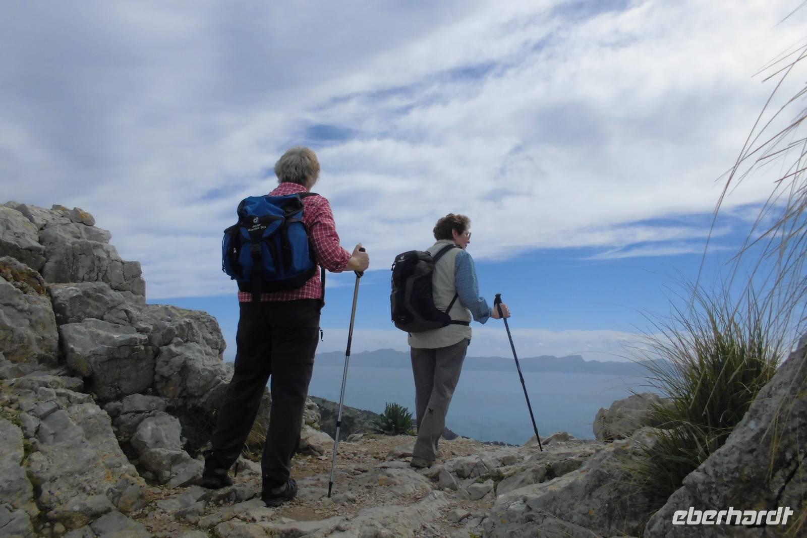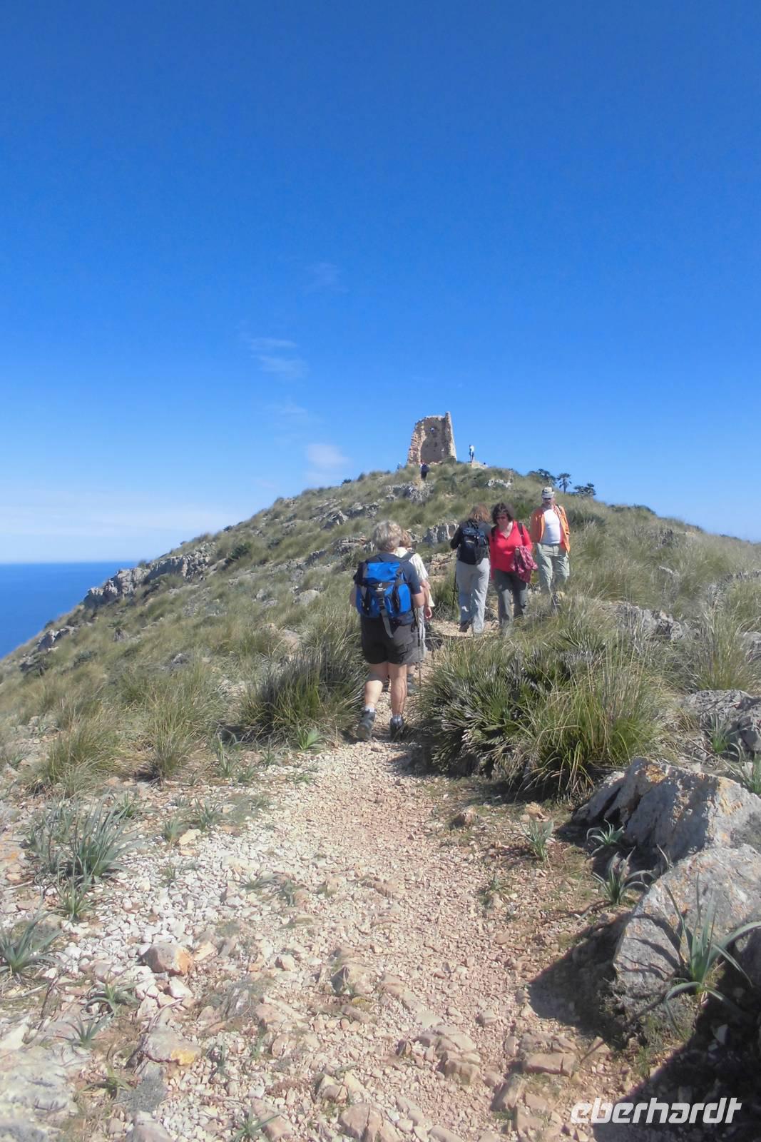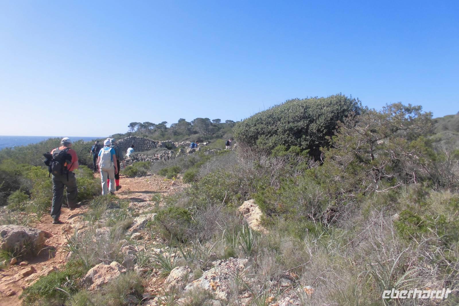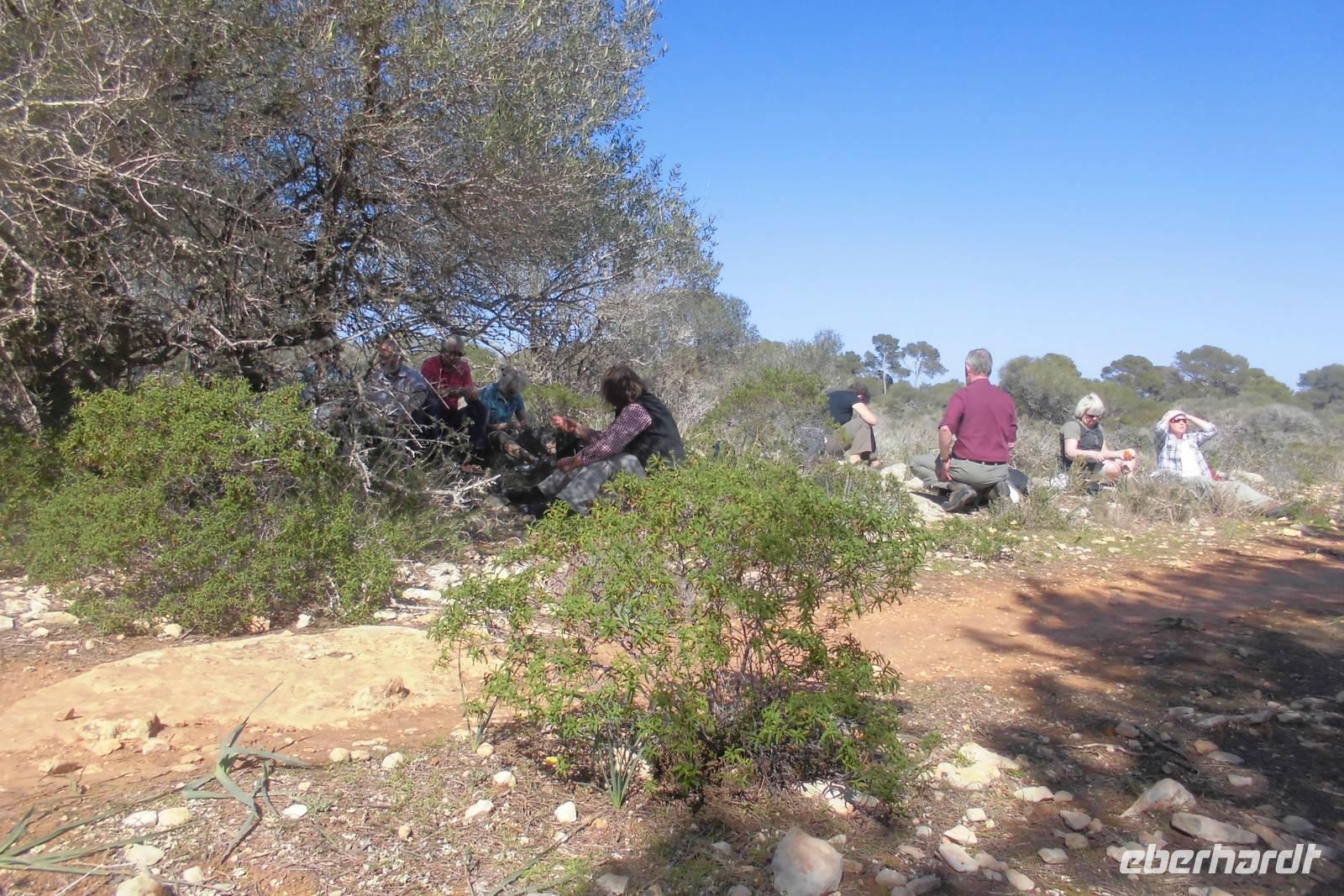 Unsere Fahrt führt uns weiter gen Norden auf die Halbinsel Alcúdia. Isabèl zeigt uns unterwegs „Ihre" Badestellen - echte Geheimtipps. Der Bus schlängelt sich entlang der Serpentinen immer weiter nach oben, bis wir nach einer kurzweiligen Fahrt die Ermita de la Victòria erreichen - den Anfangspunkt unserer heutigen Wanderung. Nachdem wir kurz in eine kleine Heiratskapelle lugen, beginnt der erste Teil des Anstieges. Der breite Weg führt uns durch ein kleines Kiefernwäldchen. Hier und da machen wir halt und lassen uns von Isabèl die hier typische Flora erklären. Der Weg wird mit der Zeit etwas flacher und das einzig größe Hindernis ist ein kleiner Zaun, über den wir alle natürlich sportlich drüber klettern. Die Kiefern werden links und rechts weniger, sodass wir bald nur noch an Sträuchern vorbei wandern. Bald schon erkennen wir unser nächstes Tagesziel - die Talaia d'Alcúdia, einen Berggipfel mit den Überresten eines alten Wachturms. Der breite Weg verengt sich nun zusehends zu einem Trampelpfad. Auch die Steigung nimmt wieder merklich zu. Zum Schluss kraxeln wir fast, um den Gipfel zu erreichen. Dafür werden wir mit einem atemberaubenden Rundblick belohnt! Die gesamte Nordostküste Mallorcas liegt uns bei strahlend blauem Himmel zu Füßen. Im Norden das Cap Formentor, im Südosten das Cap Ferrutx, dazwischen jeweils die Bucht von Pollença und die Bucht von Alcúdia. Um diesen traumhaften Ausblick so lange wie möglich genießen zu können, beschließen wir, hier oben unser Picknick zu machen - ein spanischer Wein zum Anstoßen ist da natürlich obligatorisch! Umso schwerfälliger sind dann auch die ersten Meter abwärts. Erstaunt und auch etwas kopfschüttlend machen wir kurzer Zeit später ein paar jungen Männern platz, die ihre Mountainbikes auf den Gipfel tragen, nur, um wenig später auf selbigen über den schmalen Weg und die Schottersteine wieder bergab zu fahren. Ab und an schauen wir uns noch um und blicken doch ungläubig den Sportlern hinterher. Natürlich bevorzugen wir weiterhin die Fortbewegung per pedes! Langsam wird auch unser nun schon bekannter Weg wieder breiter, sodass auch das nächste Etappenziel wieder näher rückt. An der Ermita machen wir erneut eine kleine Pause, bevor wir abermals zu einem weiteren Tagesziel aufbrechen.